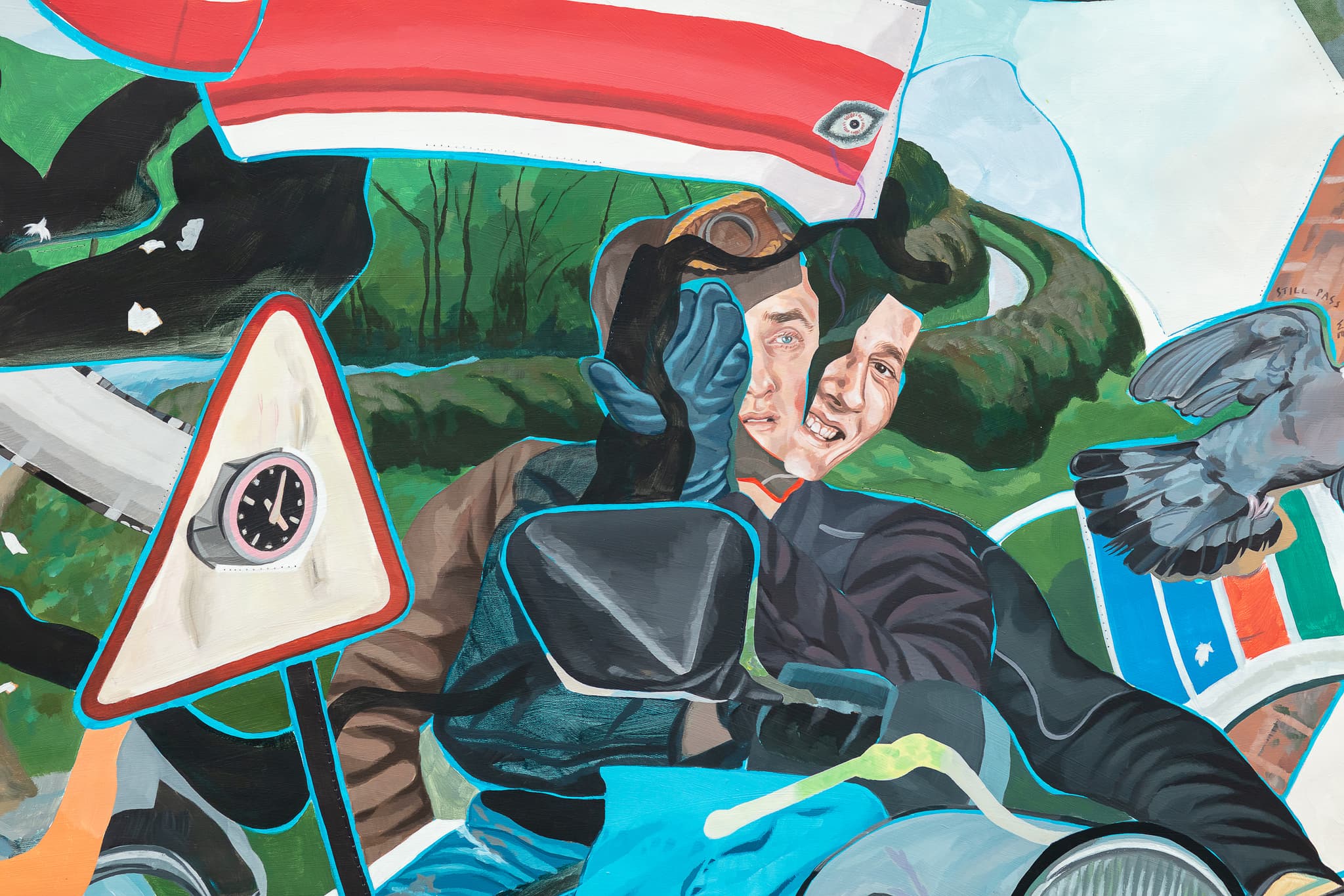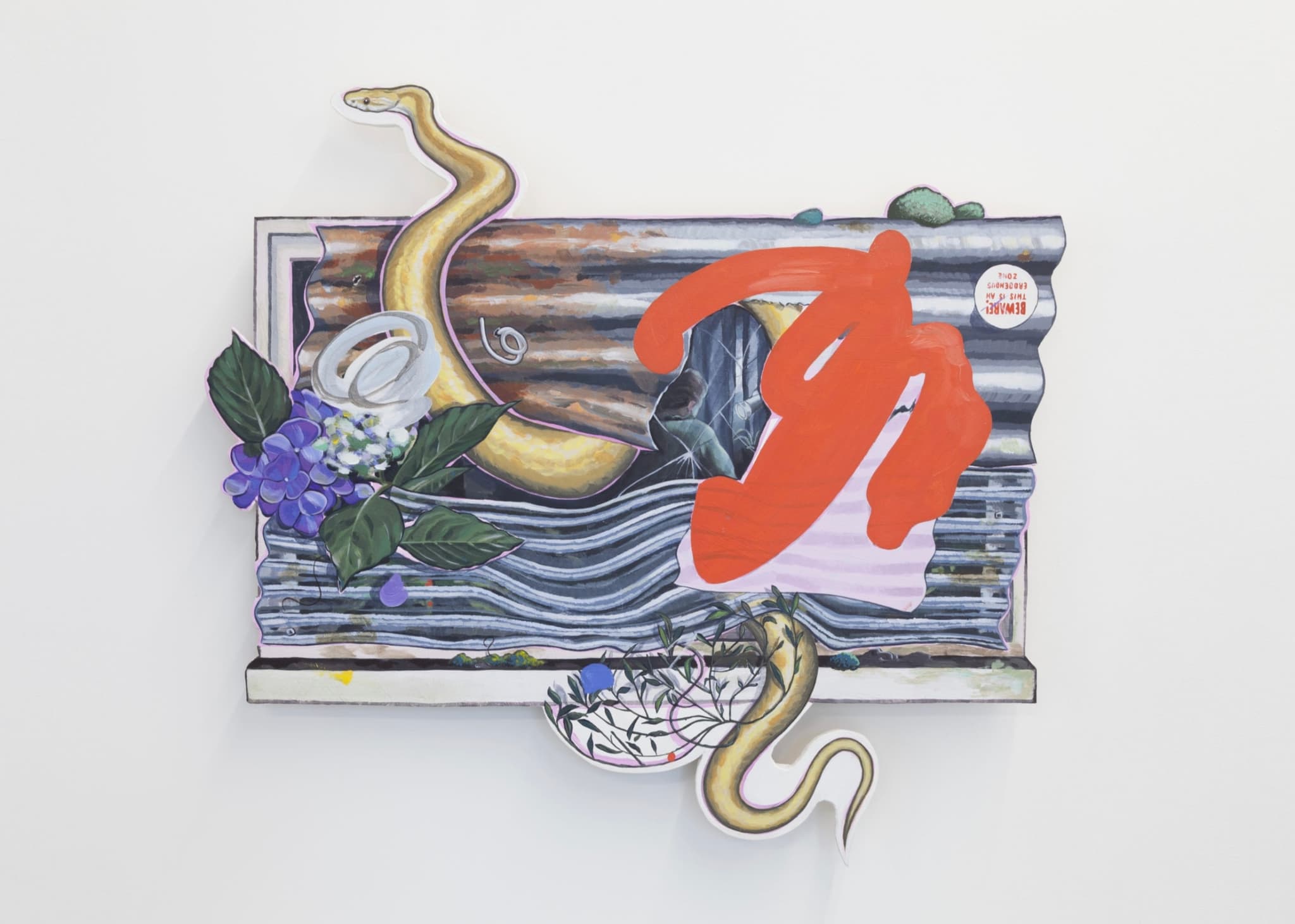 Acrylic on linen, appliqué on found material and metal