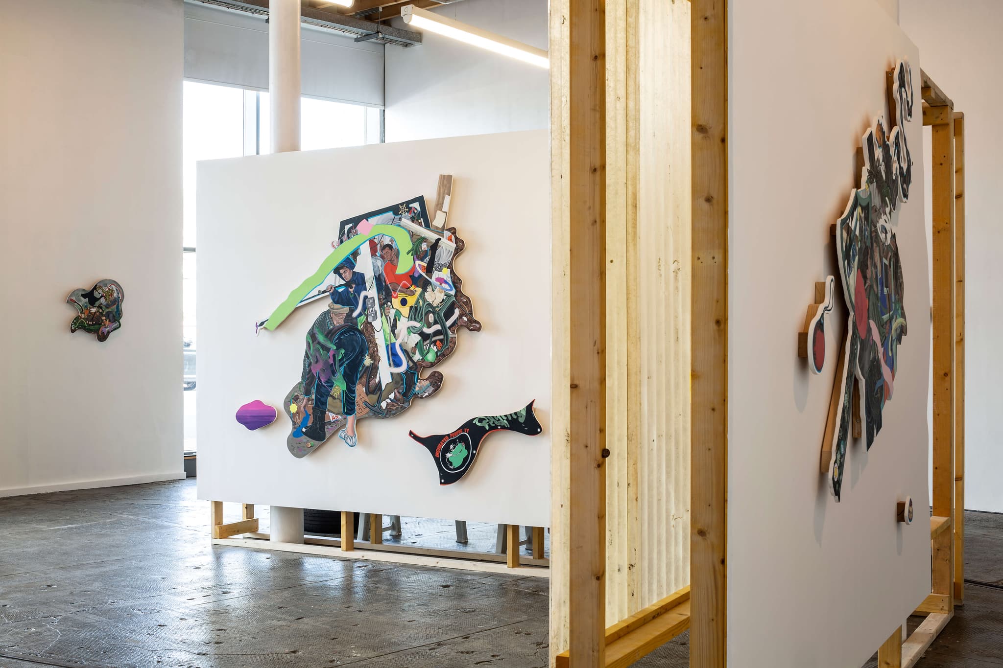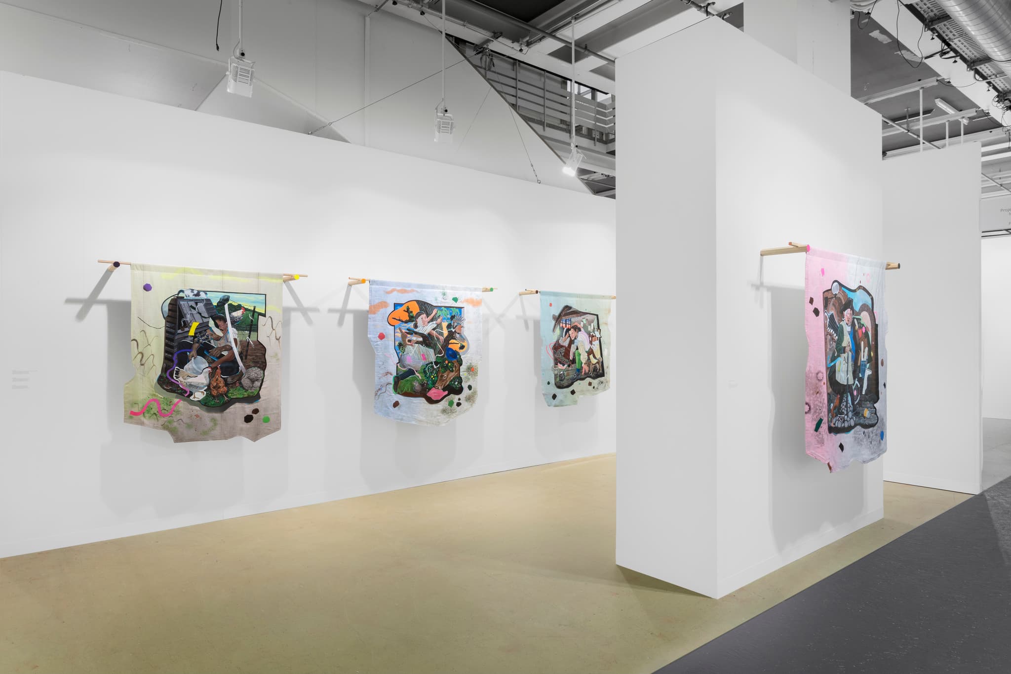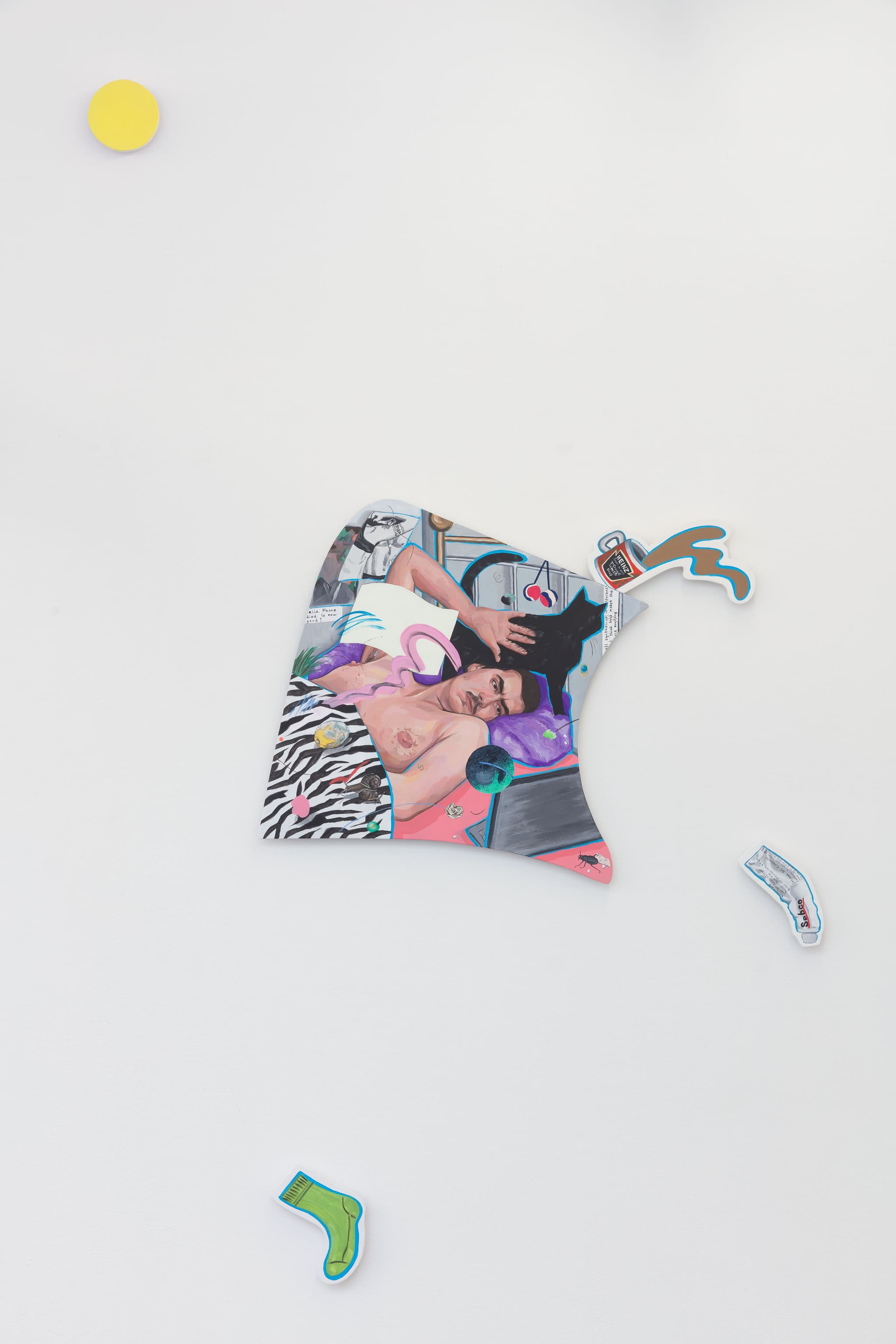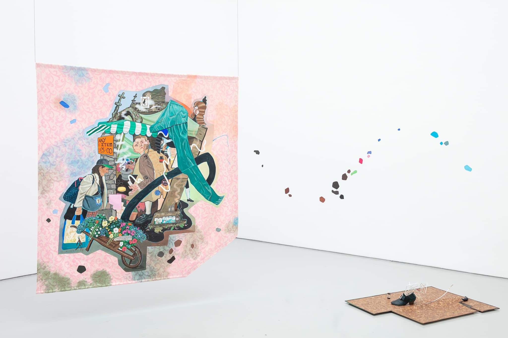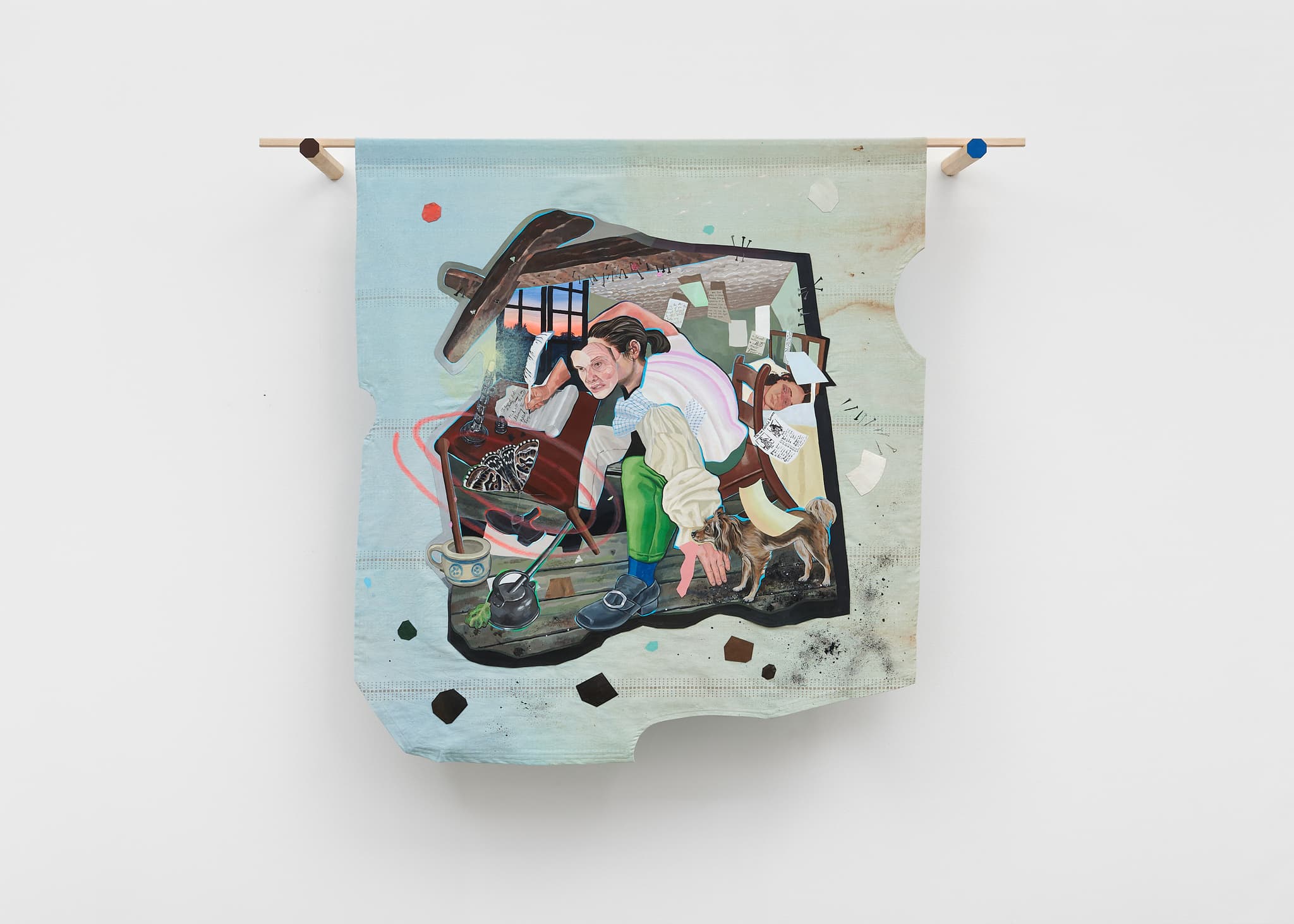 Acrylic on linen, appliqué on found material and hand-painted maple wood wall brackets