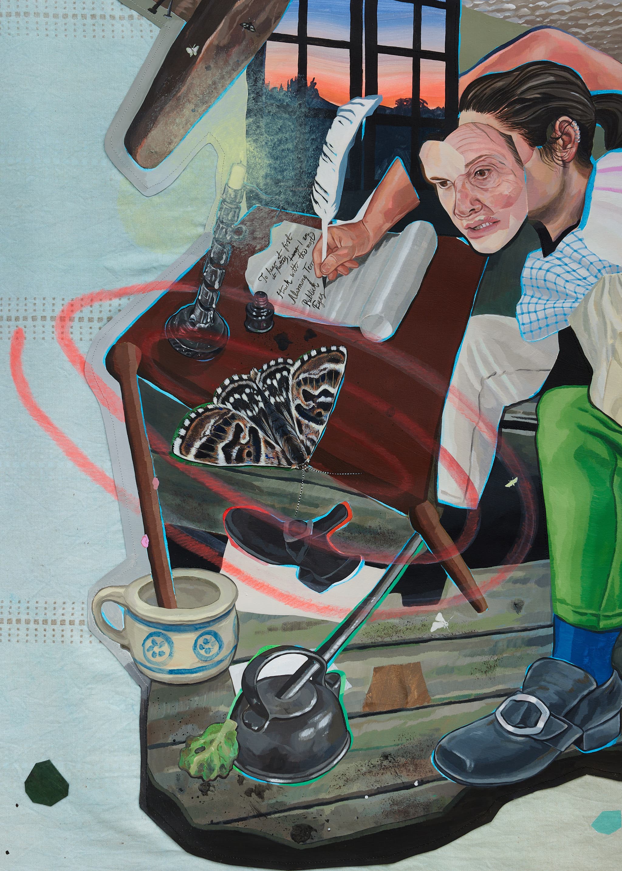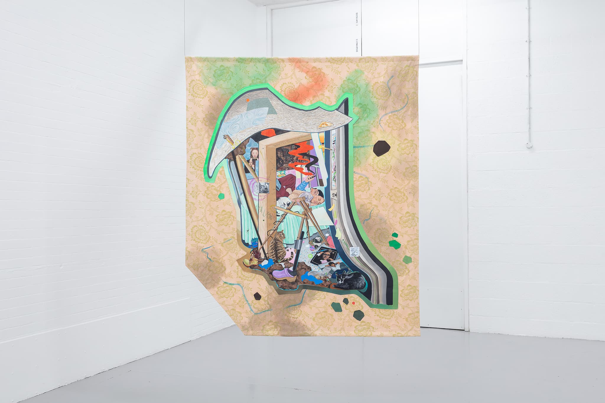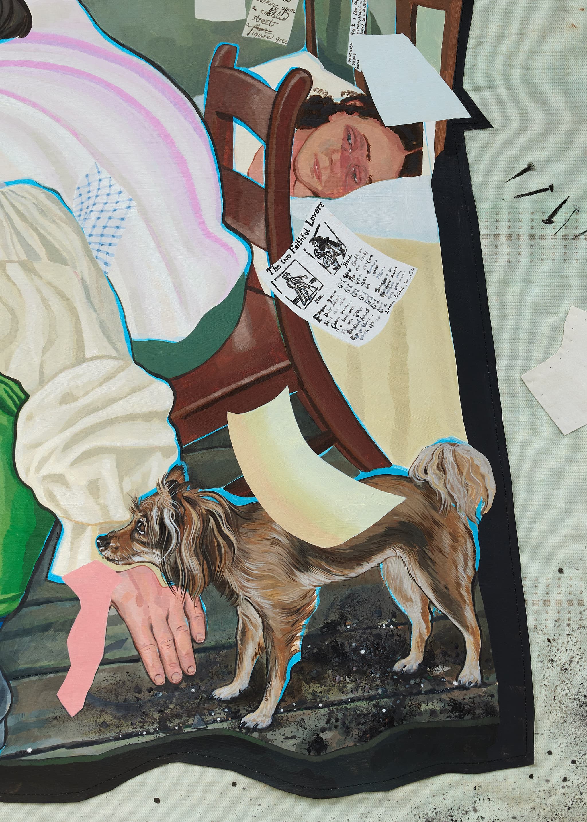 Working with acrylic, either on shaped wooden panels or appliquéd onto found fabric, Brooks’ practice explores trans and gender non-conforming histories. Embedded in the materials of domestic space, which they describe as ‘the first space of dreaming, fantasising, worlding,’ each work originates from fragments of the depicted figure’s lives, gleaned from newspaper clippings, autobiographical descriptions and visits to the places they lived or worked. Collaging together different places, eras and individuals, Brooks’ works resist simplified representations of trans and gender non-conforming lives. Rather they open up a flexible space for the unfolding of multiple perspectives, shifting identities and evolving relationships. They are not historical portraits but dream-like scenarios: fragmented, mutable, incomplete.