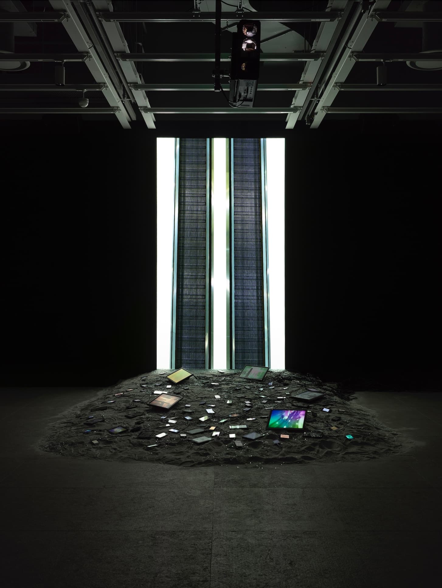 Al-Maria’s debut exhibition in the United States, at the Whitney Museum of Art, 2016, attends to the Gulf’s embrace of consumerism. Black Friday features primarily of shots of empty shopping centres in Doha. An unseen narrator declares the mall as the place “where the glamorous heart of evil is born”, a place of entrapment and confusion complete with faces blurred beyond recognition and bodies collapsed on the floor.