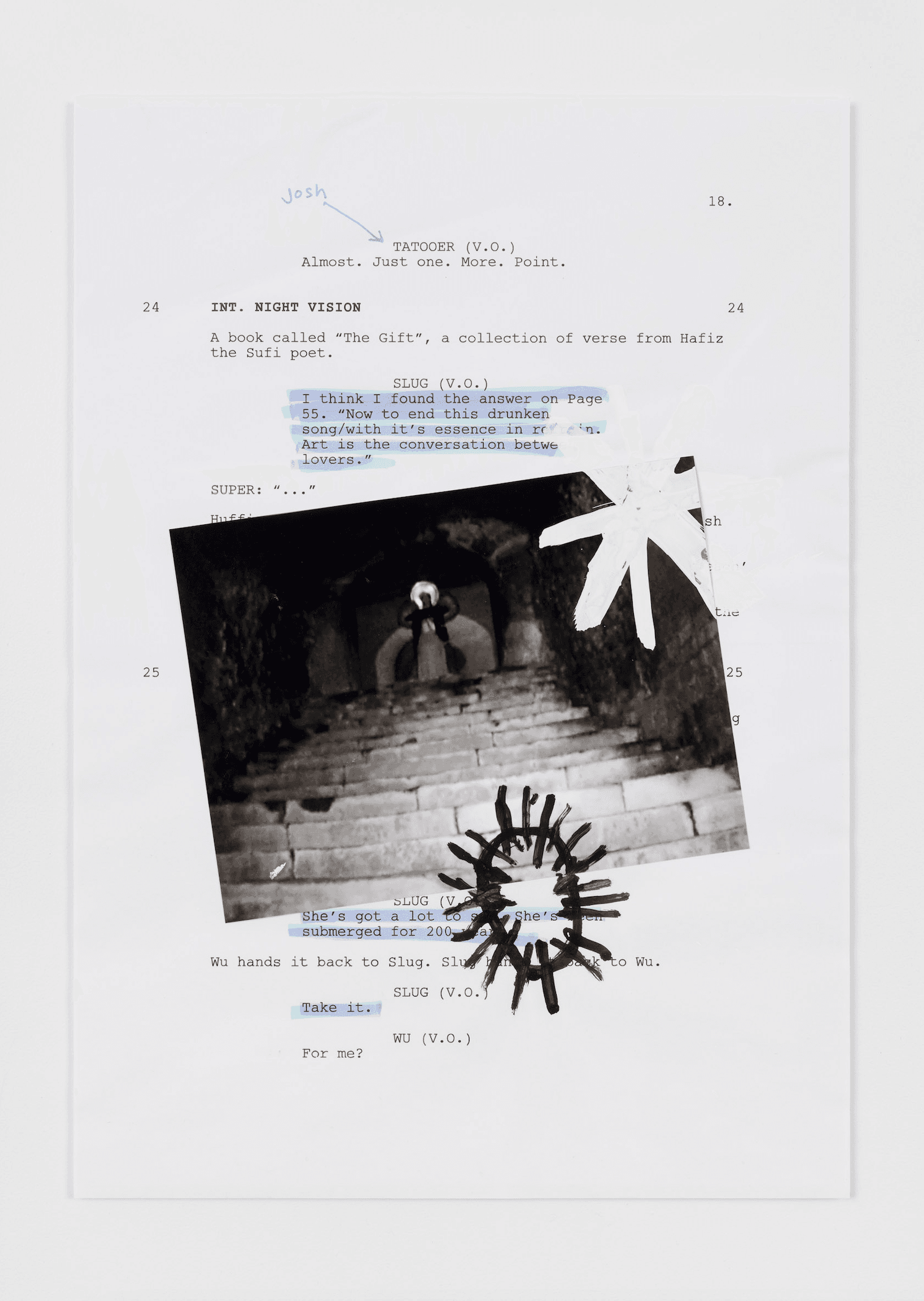 Film ephemera, collected found material, pen, acrylic, string and index text