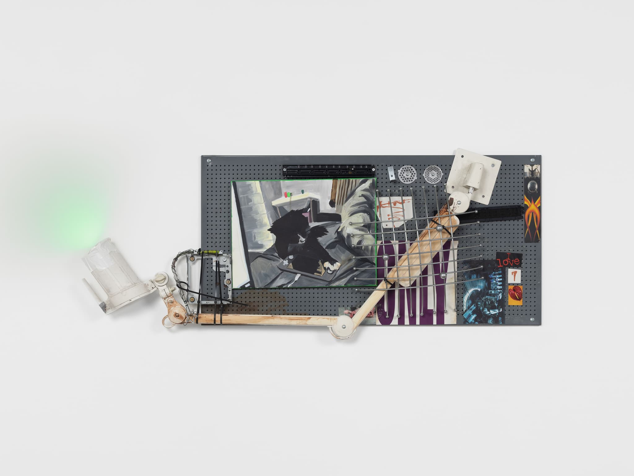 Acrylic on canvas, collage, dentist lamp, LED light, steel, plastic and found material on steel pegboard