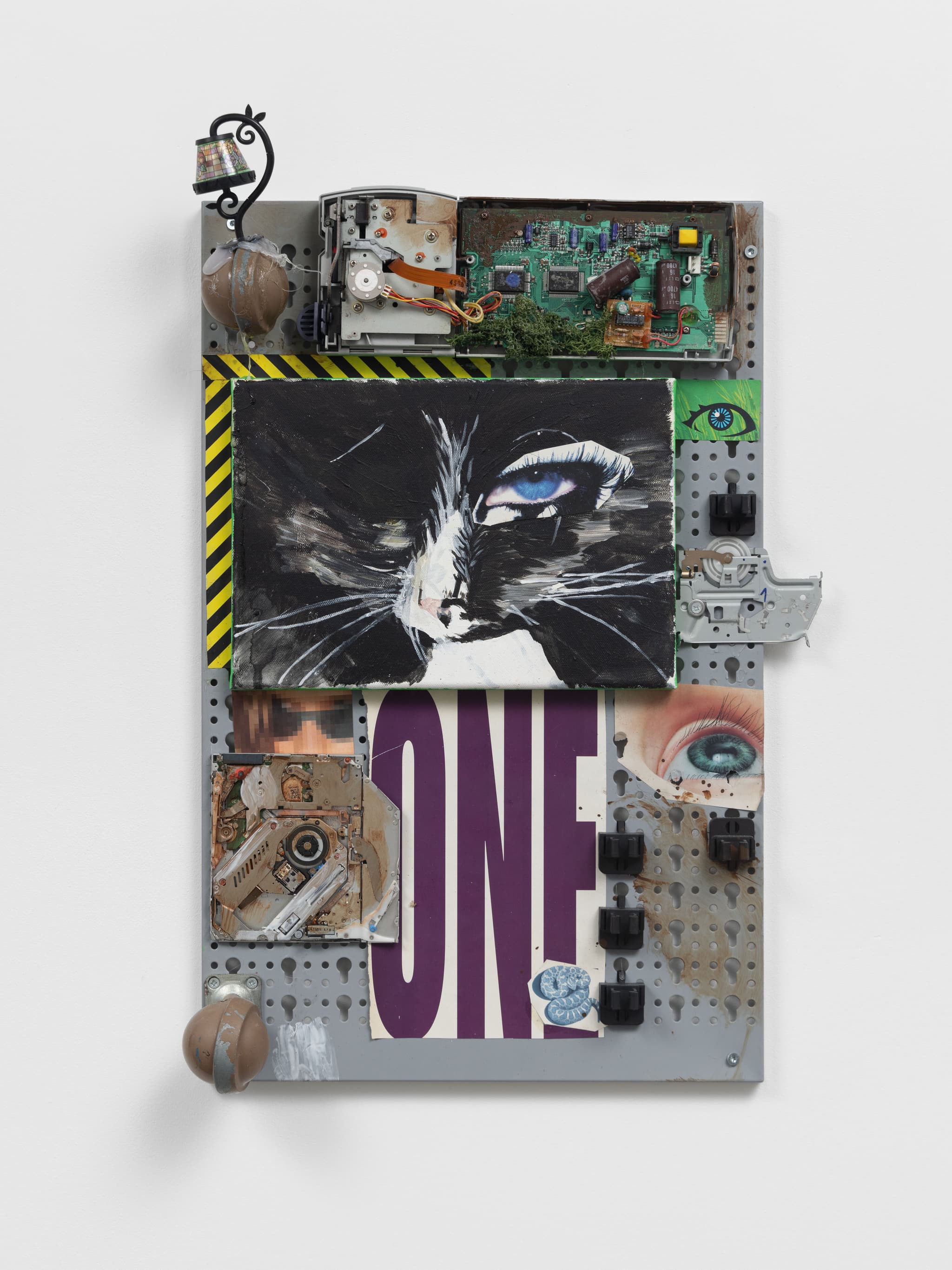 Acrylic on canvas, plastic toy lamp, epoxy resin, wheels, circuit boards, collage and disk tray on steel pegboard