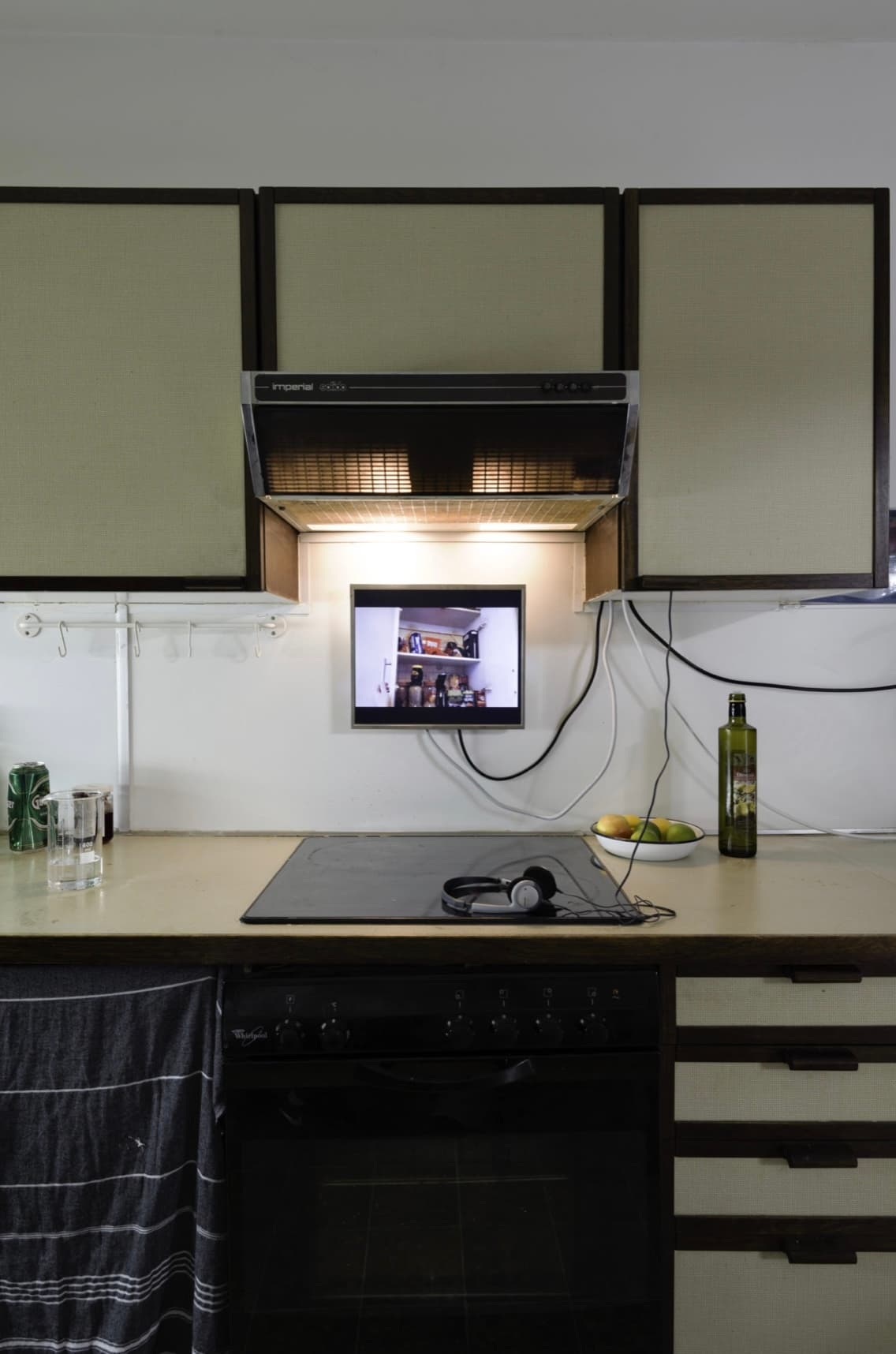 Mannequin, microwave, table, cameras, screens, phone and apple