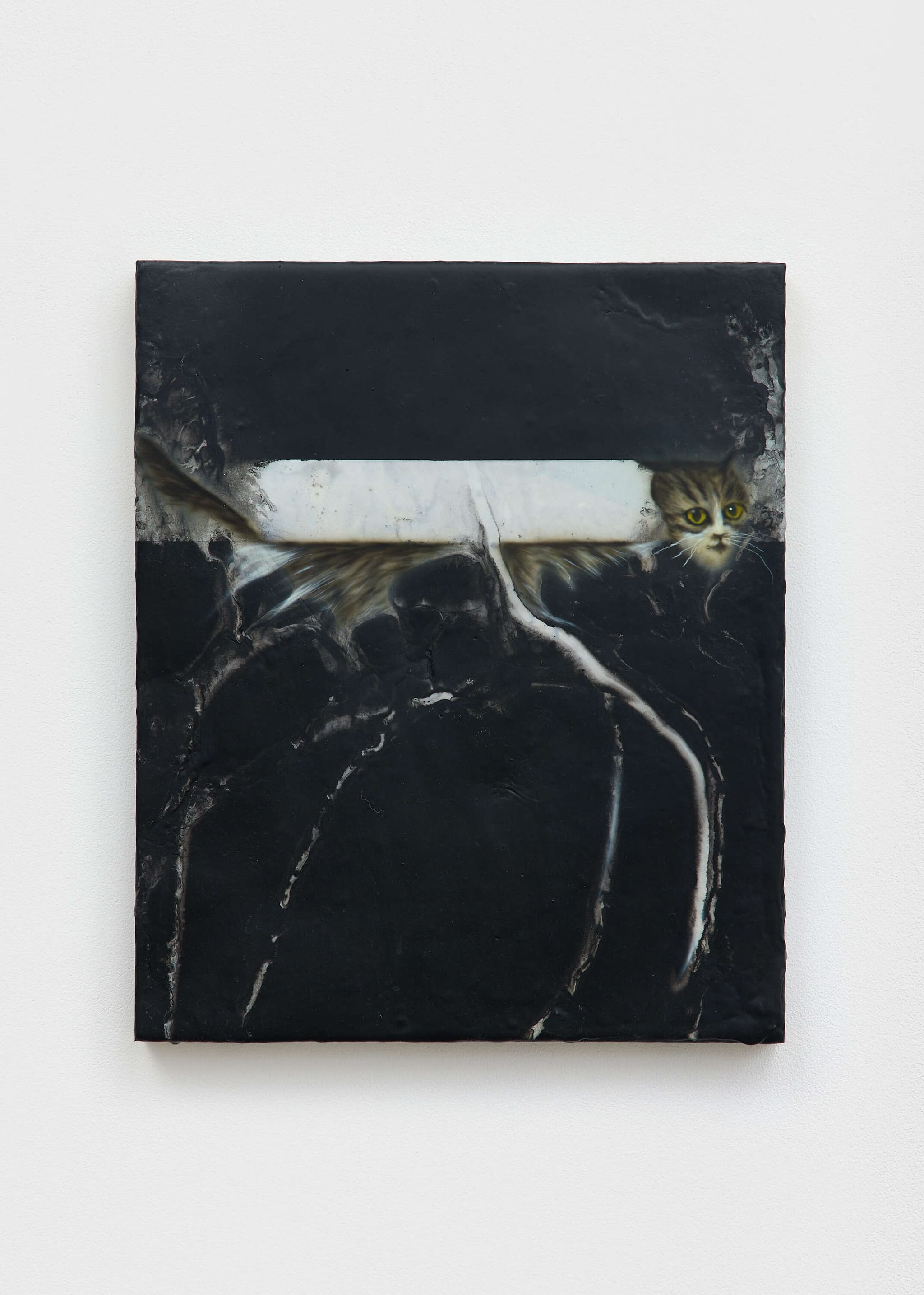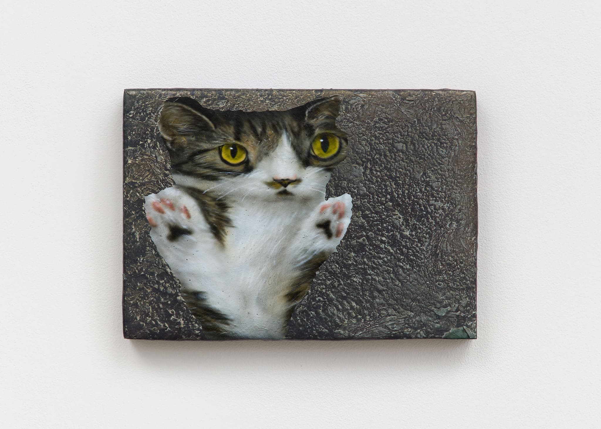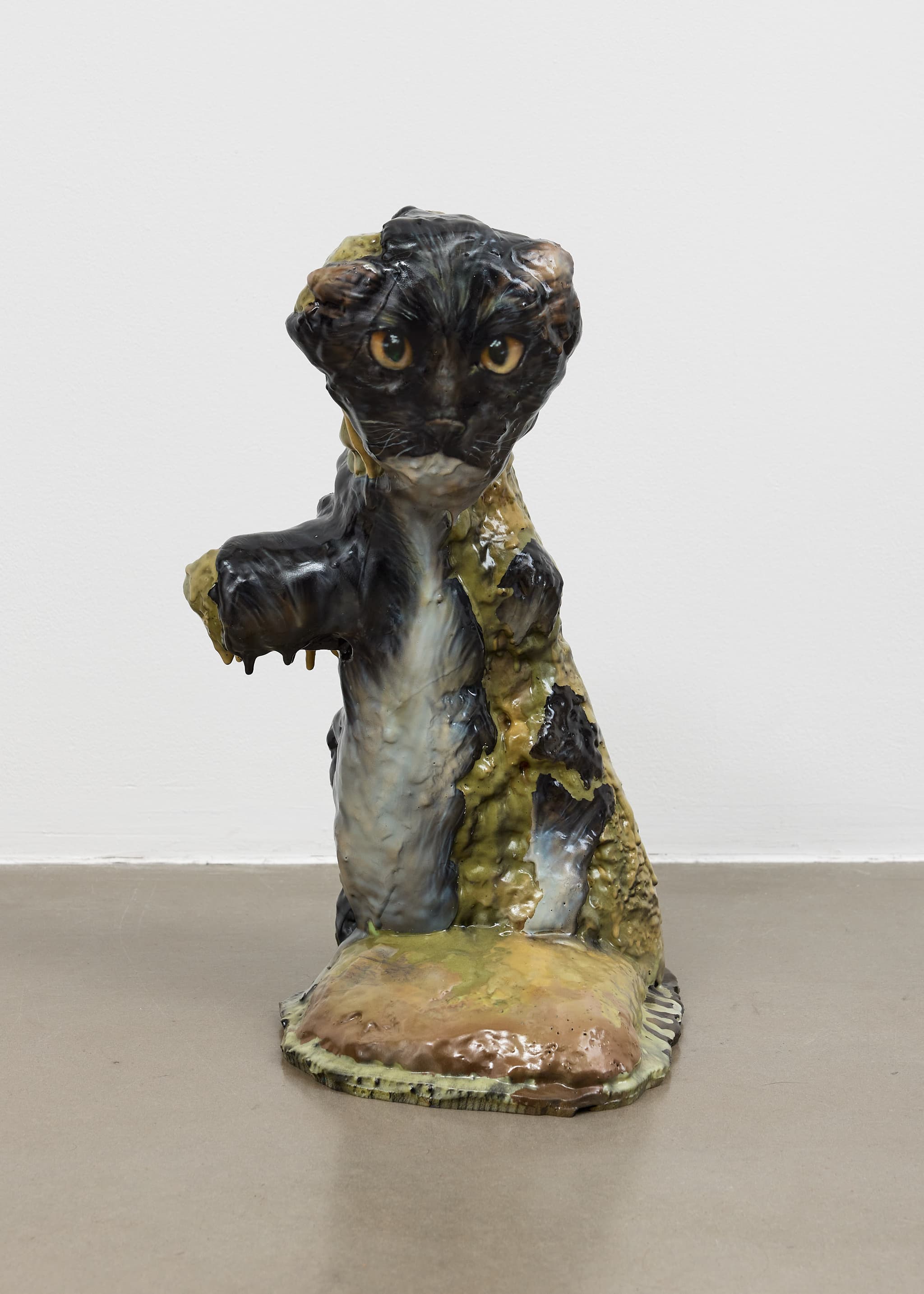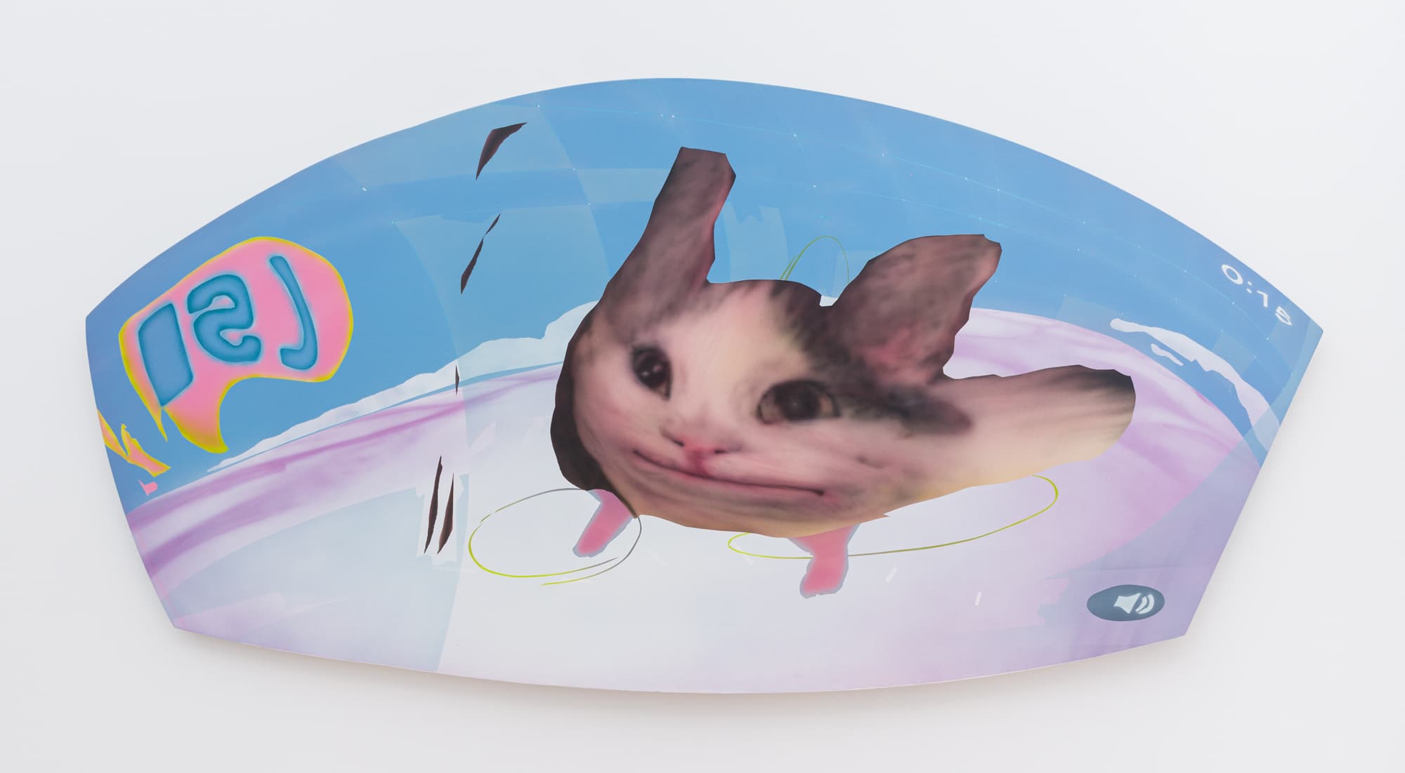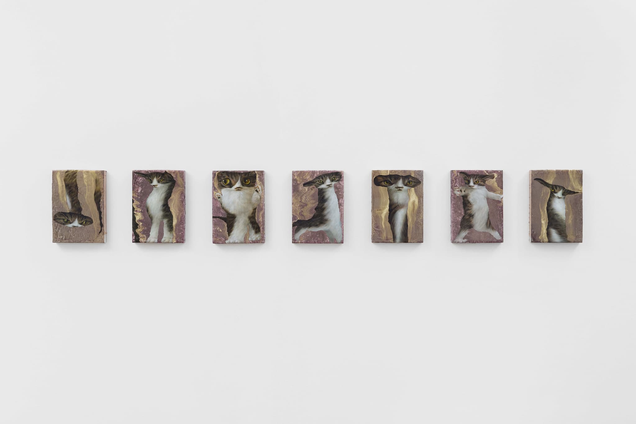 As the birth and death of images are repeated infinitely online, Ahn seeks to depict how technology and late capitalism have been corporally absorbed and continually alter our perception of reality. His practice honours the nonsense, ruse and the erroneous nature of existence. Resembling the filters we play with on our phones, he seamlessly texture-maps depictions of Hiro, his pet cat, onto organically contorting resin forms. Ahn confronts the malleability of representation and the enduring process of becoming. In his latest body of works, he introduces a new character into the memeitic universe of his own creation, Mako the kitten.