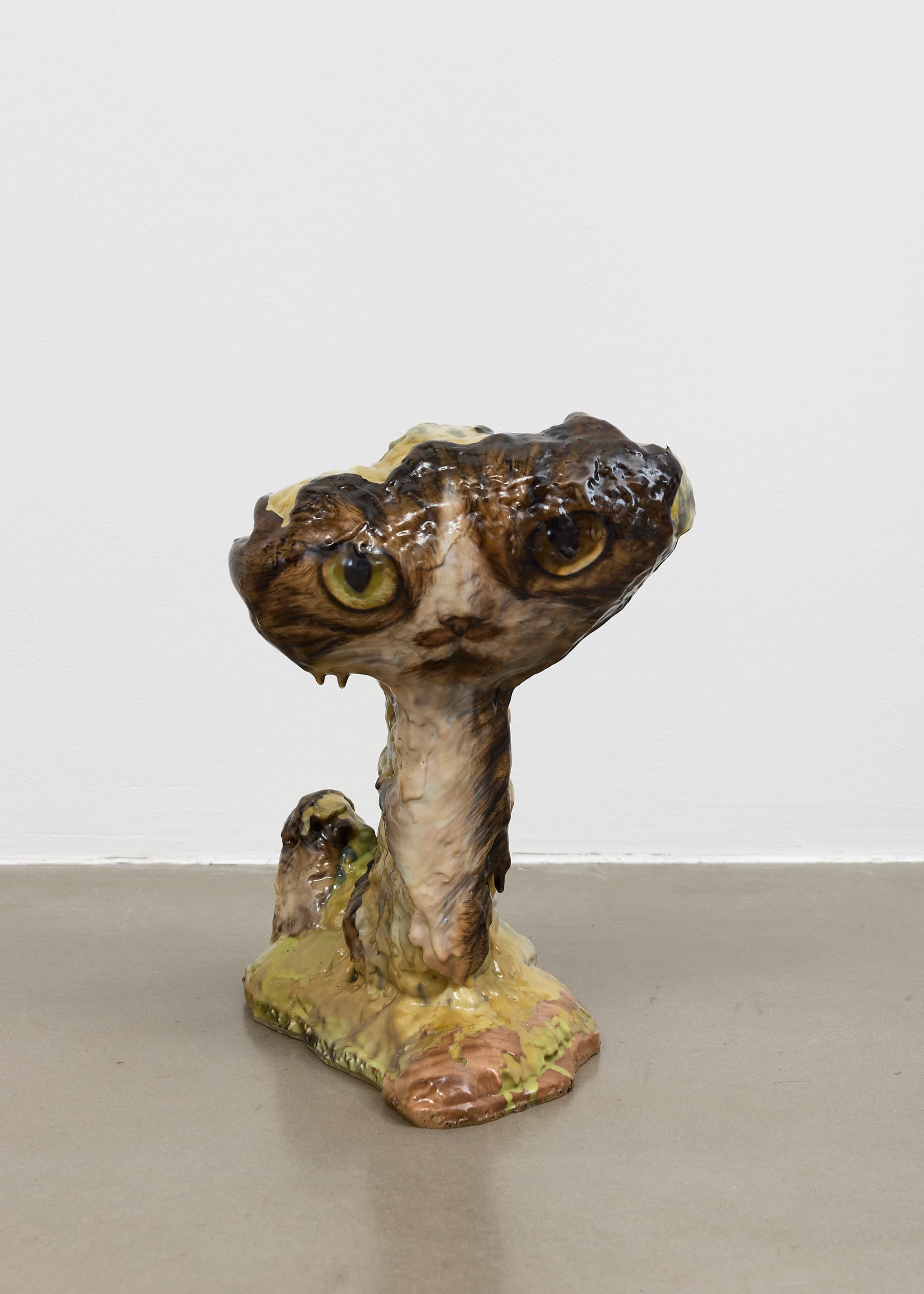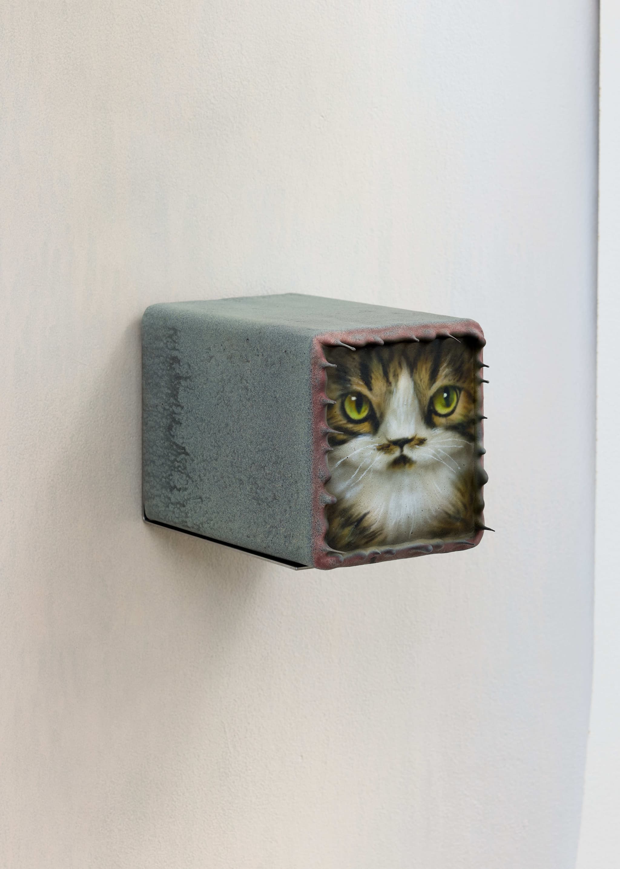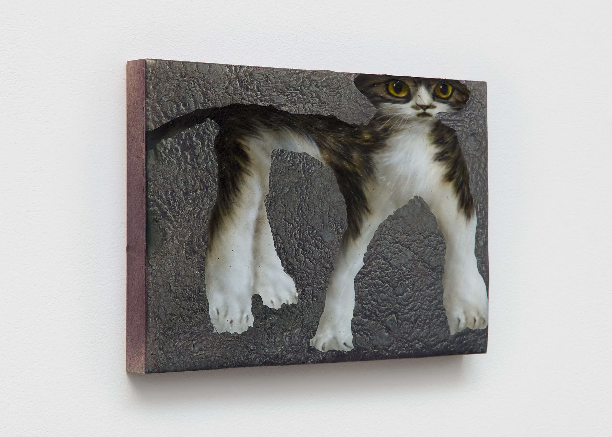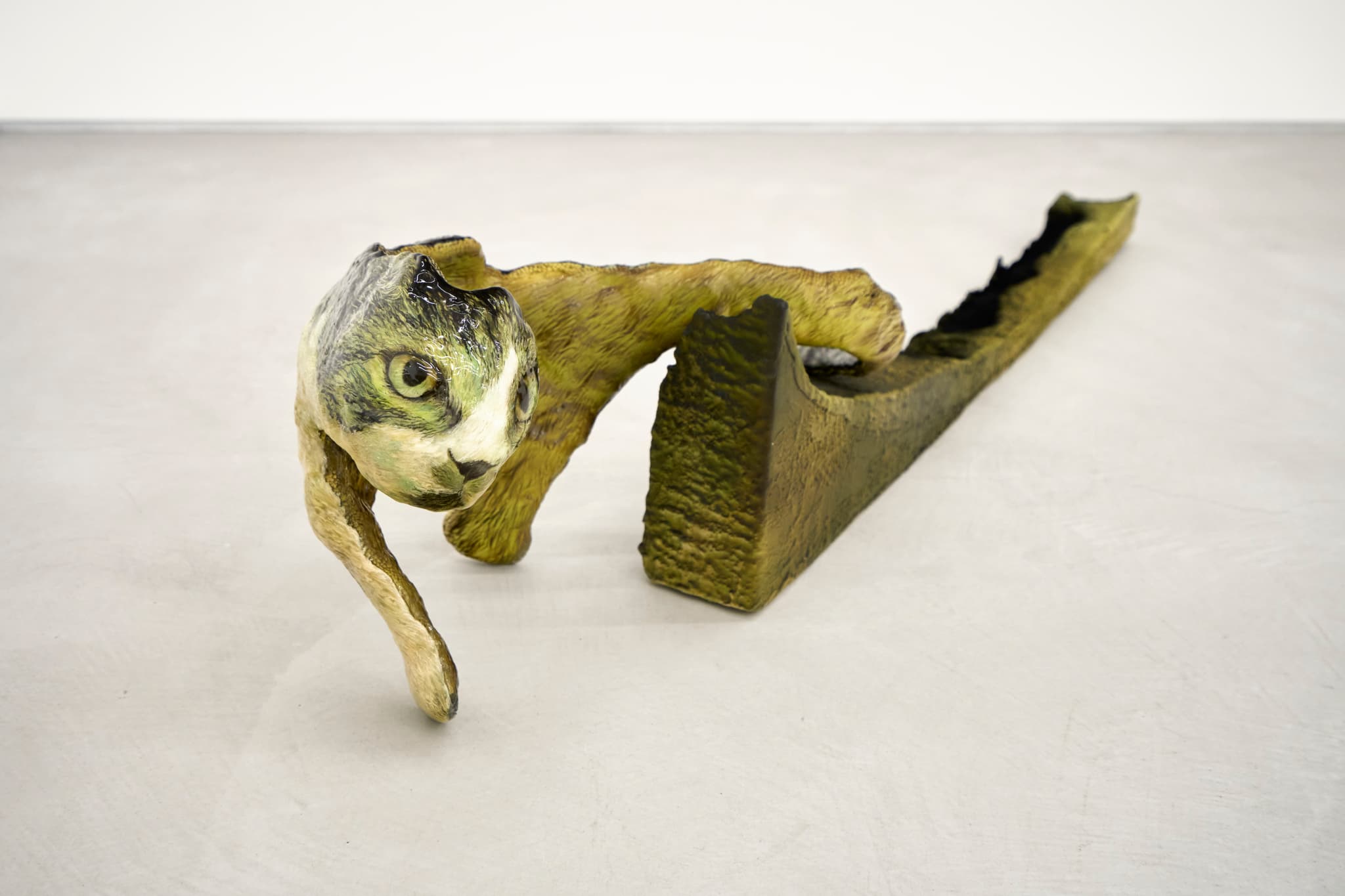As the birth and death of images are repeated infinitely online, Ahn seeks to depict how technology and late capitalism have been corporally absorbed and continually alter our perception of reality. His practice honours the nonsense, ruse and the erroneous nature of existence. Resembling the filters we play with on our phones, he seamlessly texture-maps depictions of Hiro, his pet cat, onto organically contorting resin forms. Ahn confronts the malleability of representation and the enduring process of becoming. In his latest body of works, he introduces a new character into the memeitic universe of his own creation, Mako the kitten.