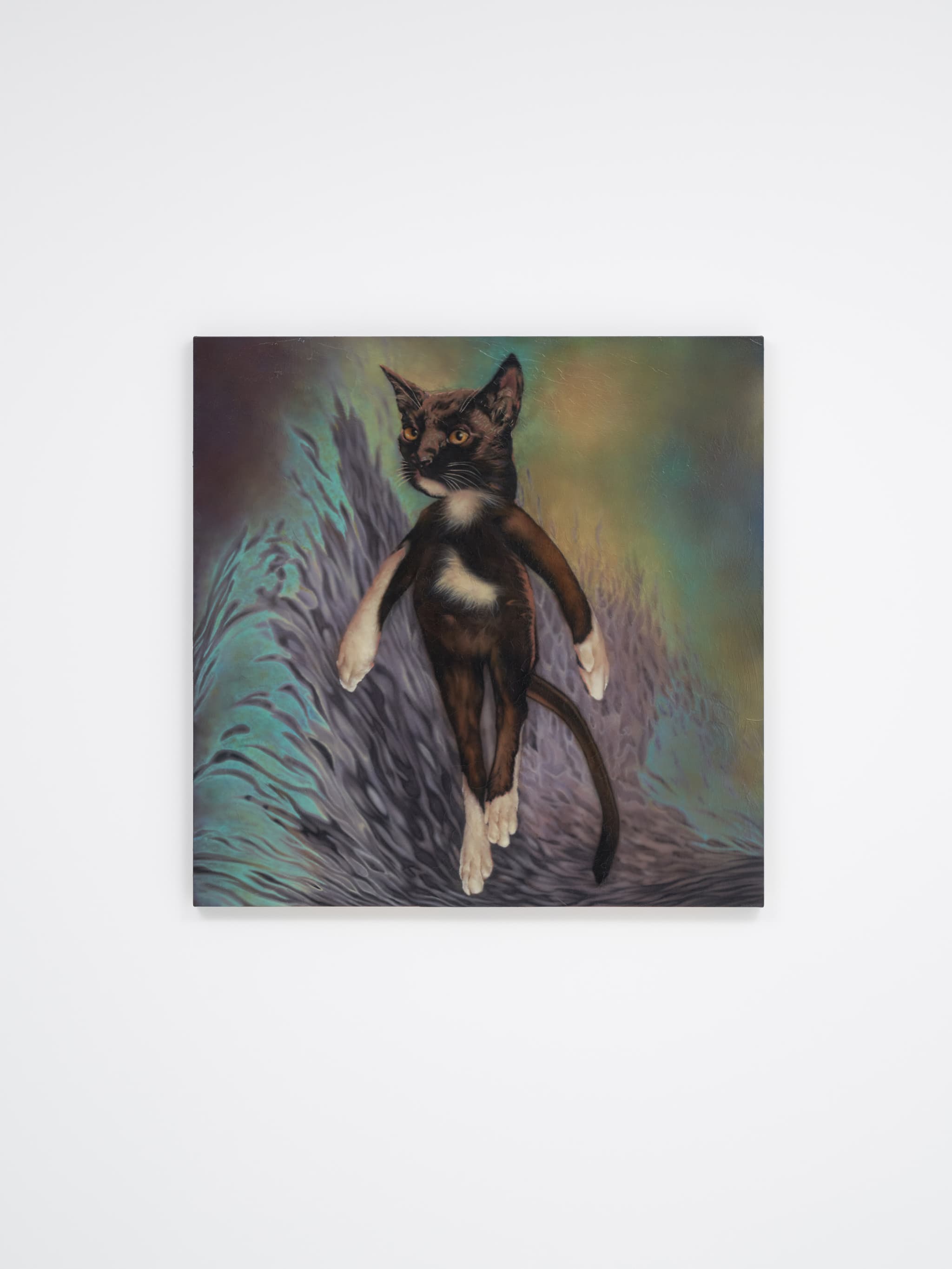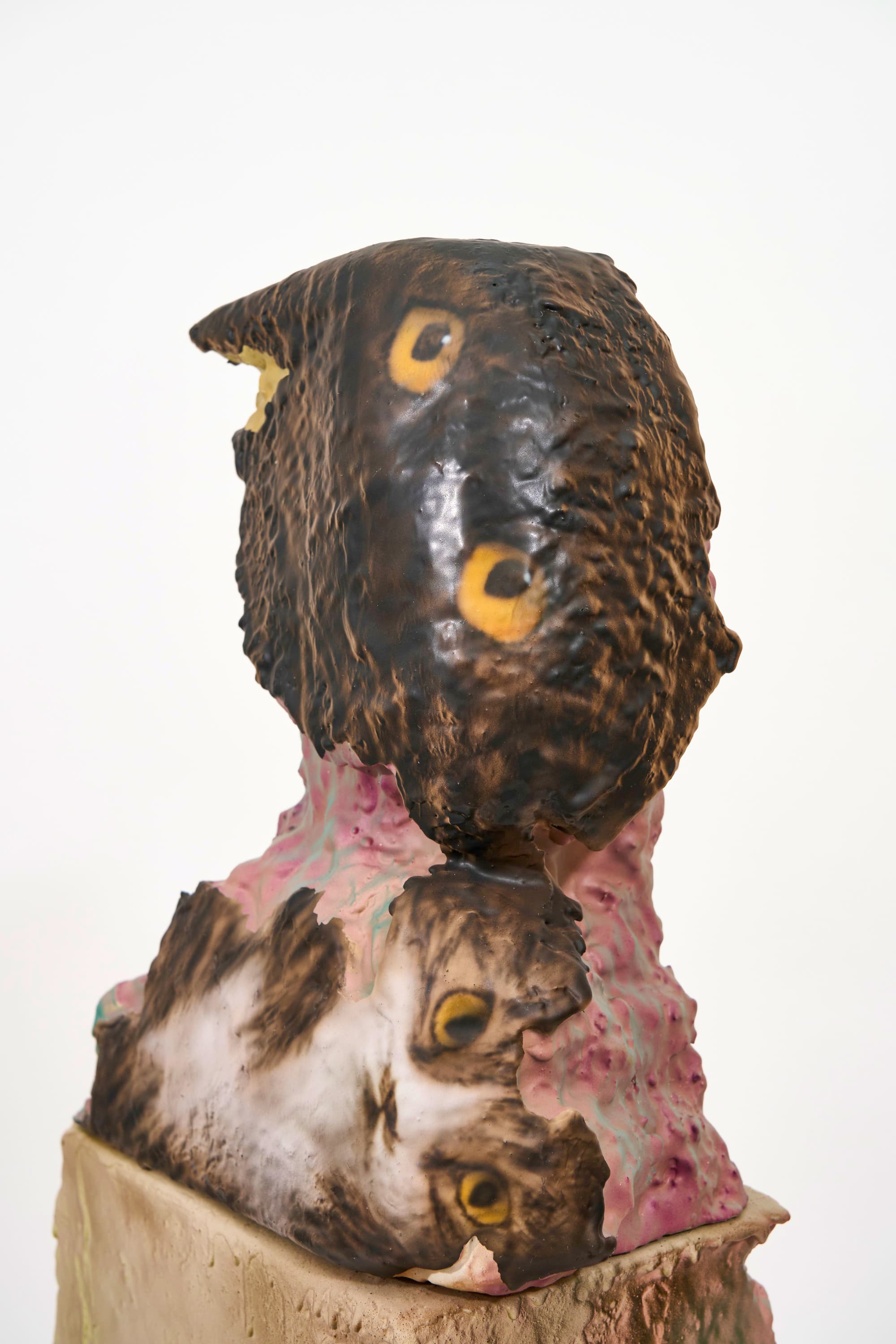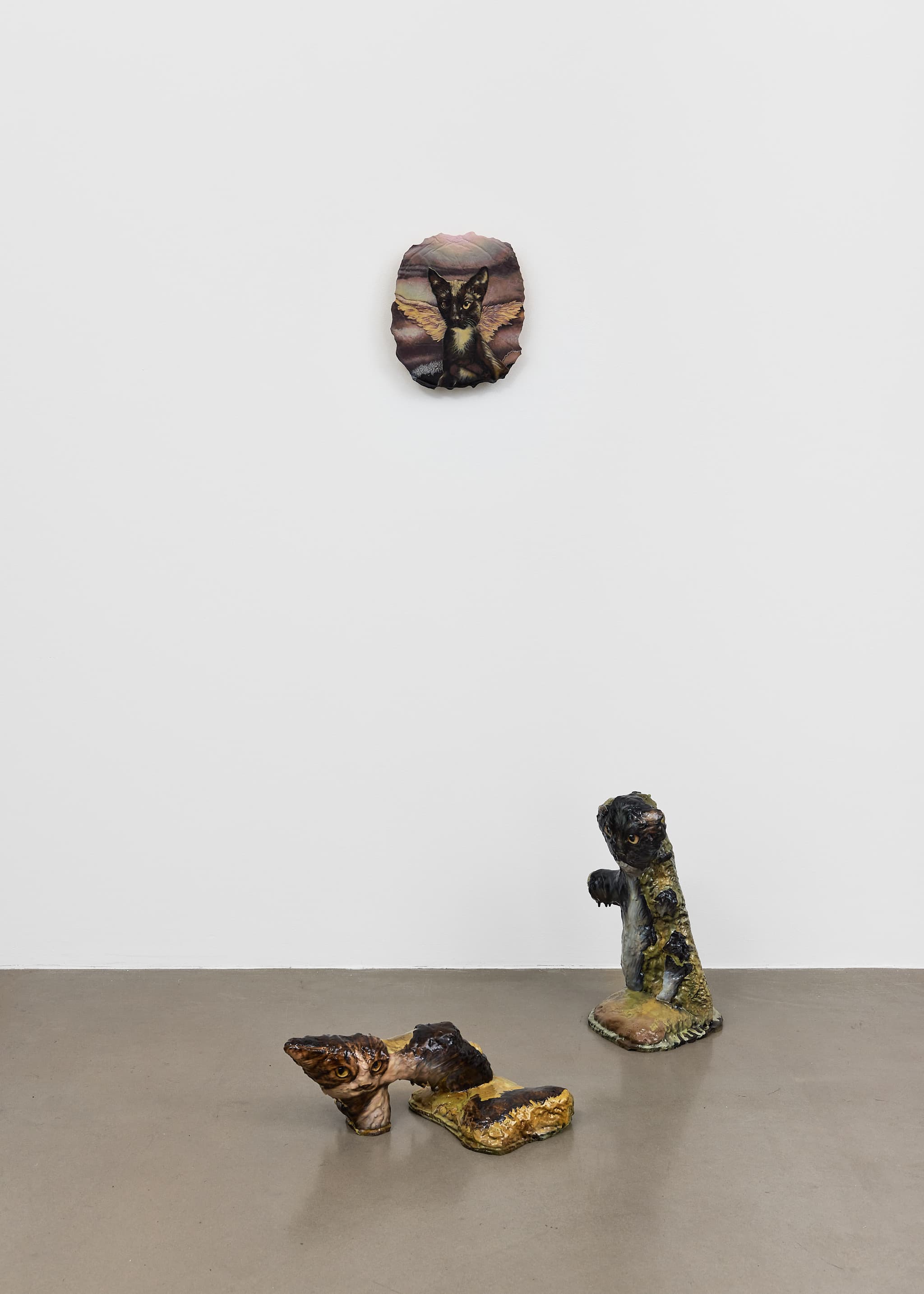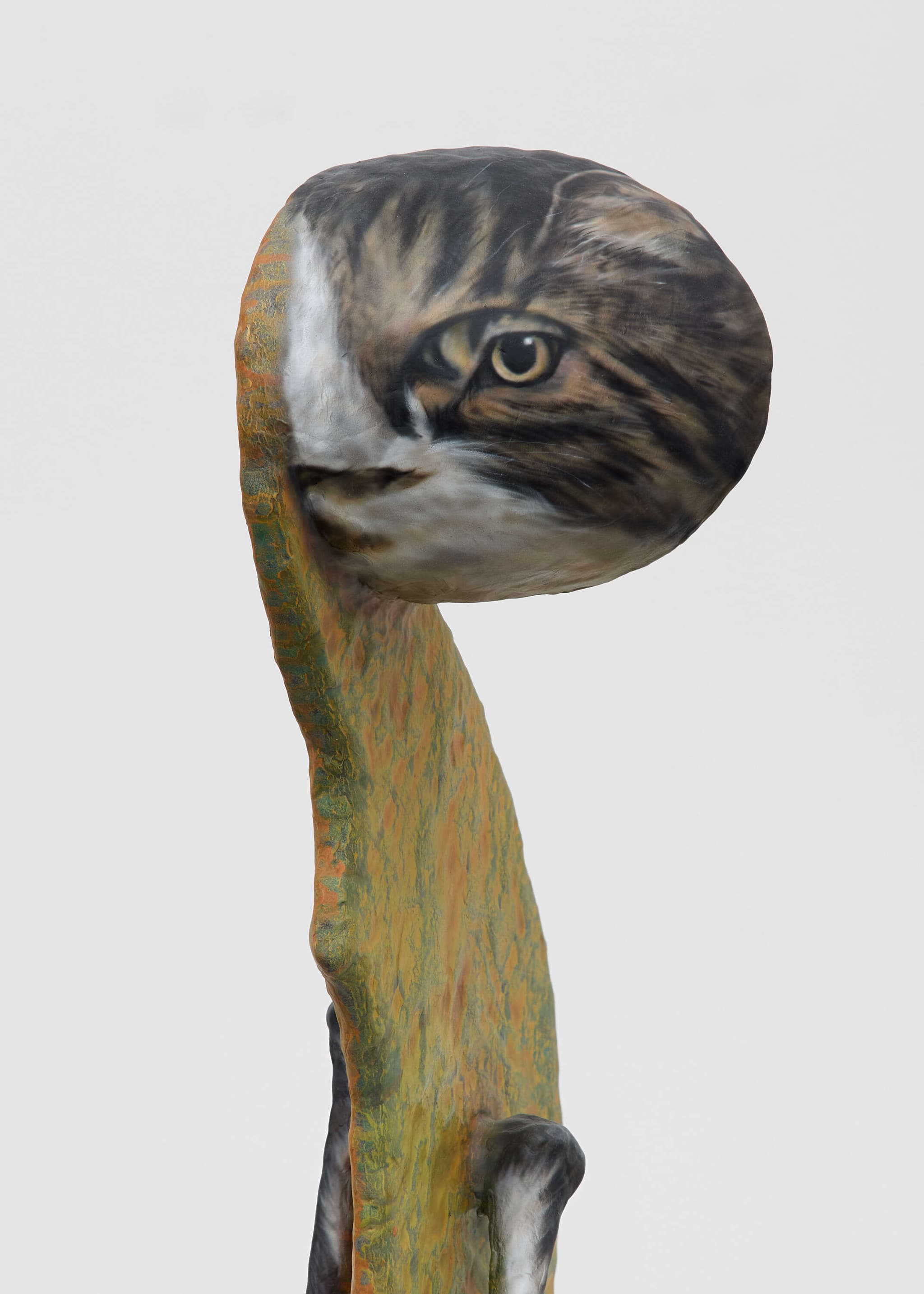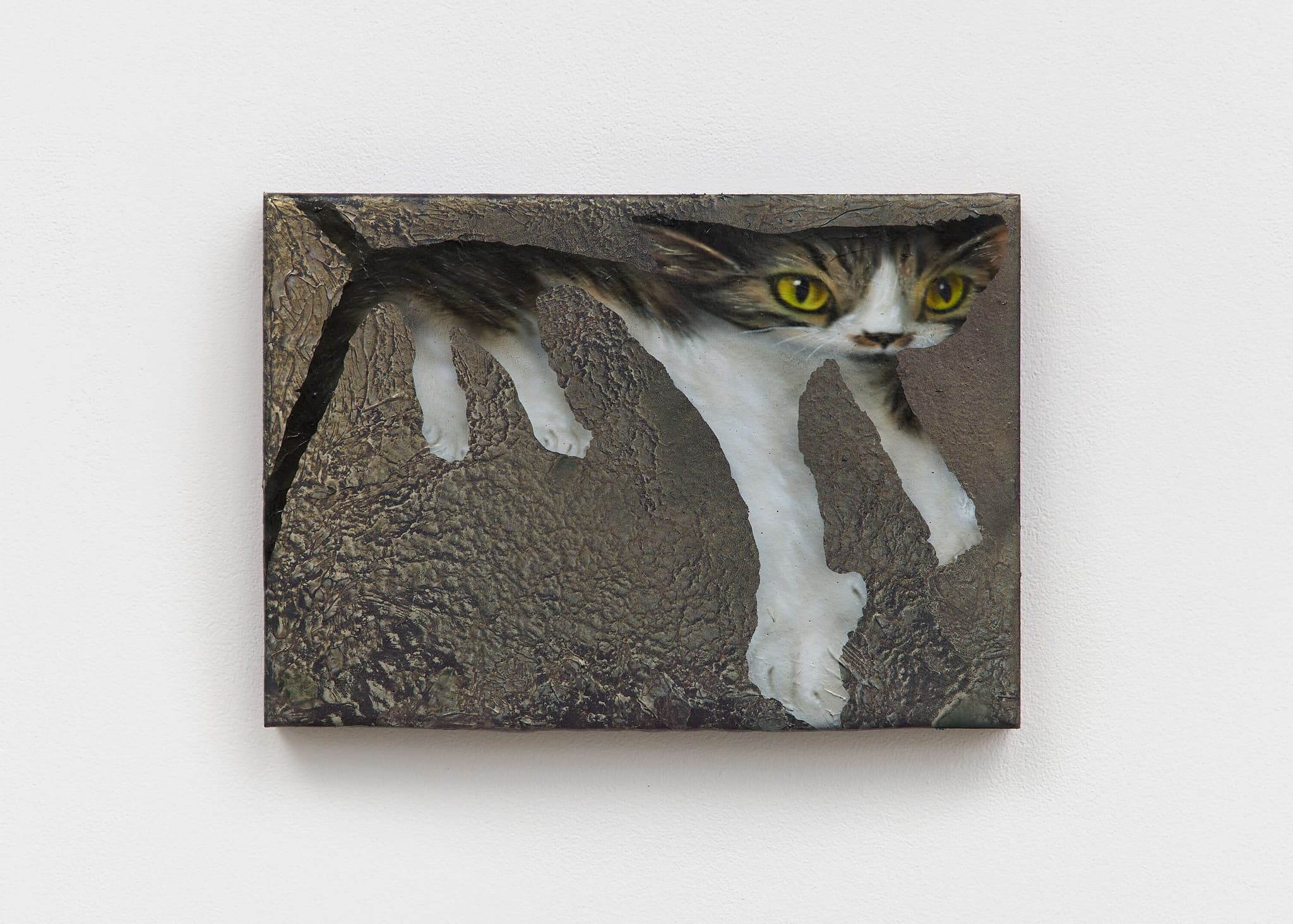 As the birth and death of images are repeated infinitely online, Ahn seeks to depict how technology and late capitalism have been corporally absorbed and continually alter our perception of reality. His practice honours the nonsense, ruse and the erroneous nature of existence. Resembling the filters we play with on our phones, he seamlessly texture-maps depictions of Hiro, his pet cat, onto organically contorting resin forms. Ahn confronts the malleability of representation and the enduring process of becoming. In his latest body of works, he introduces a new character into the memeitic universe of his own creation, Mako the kitten.