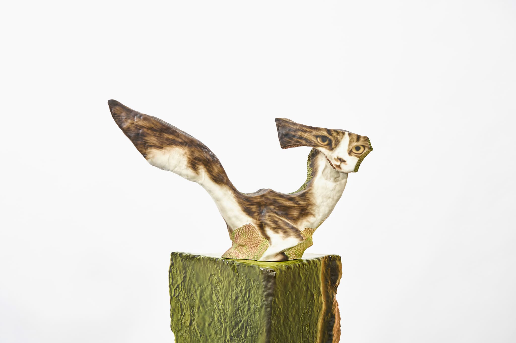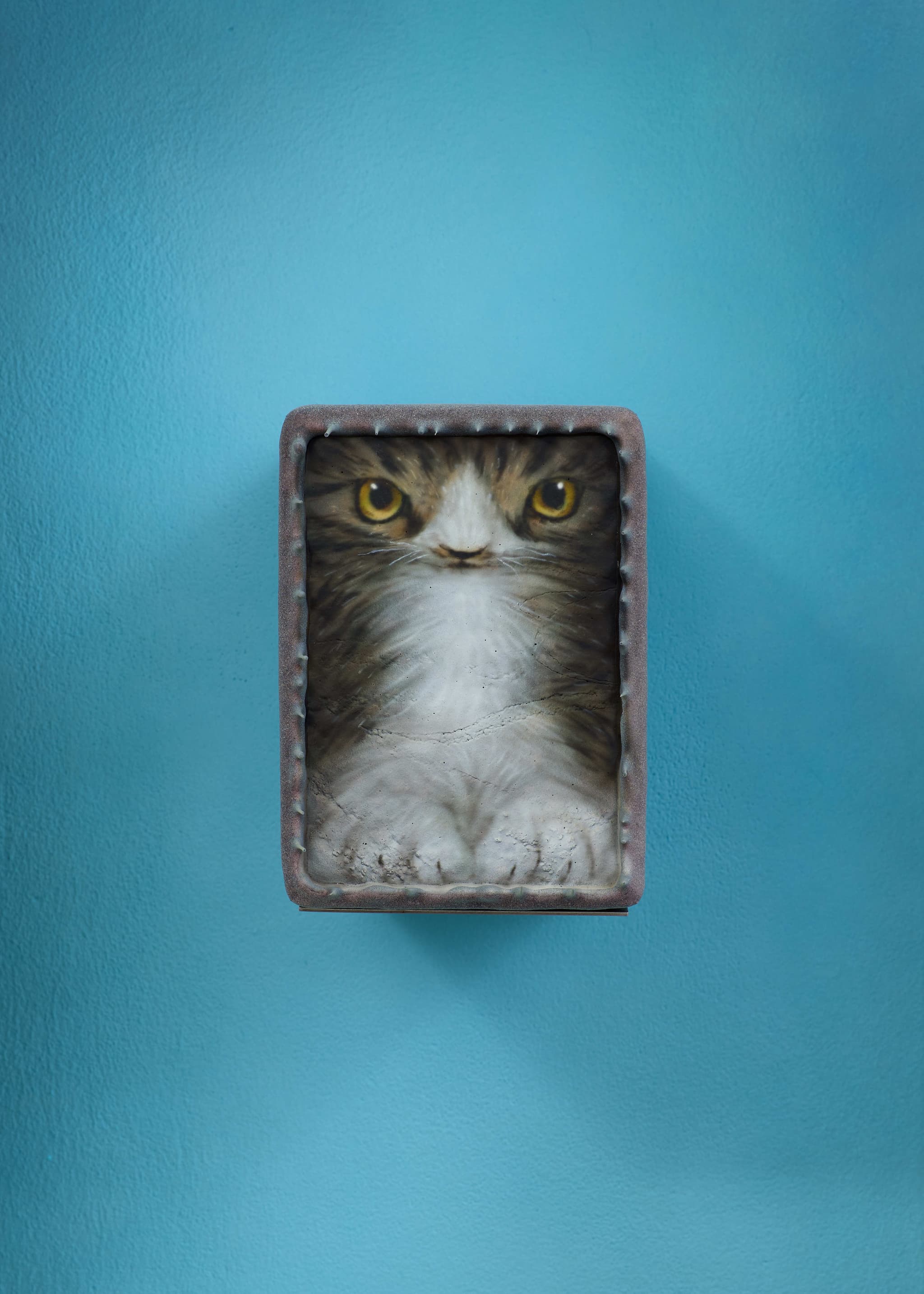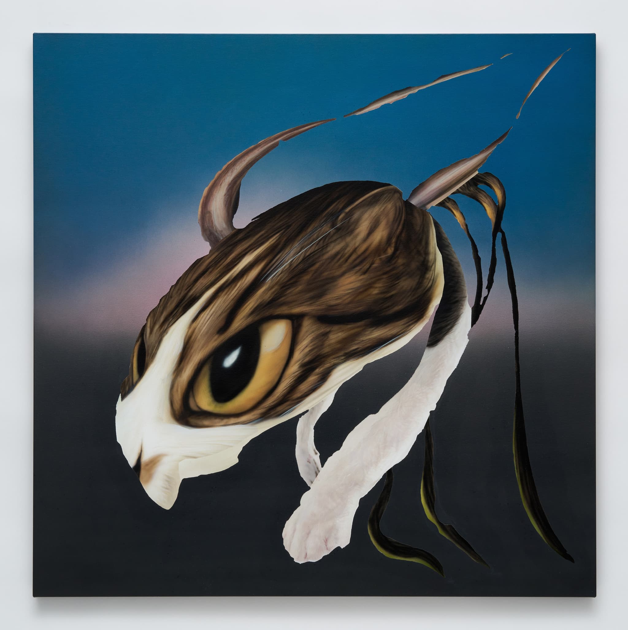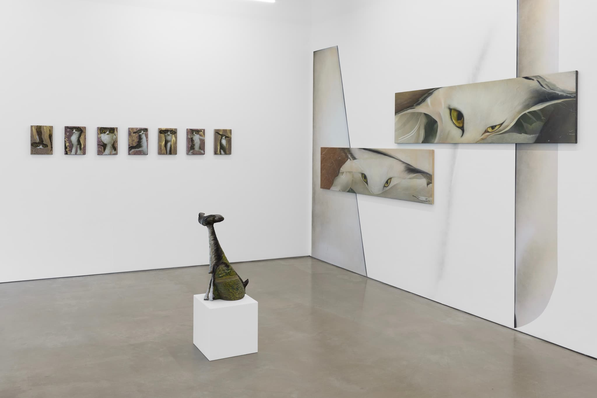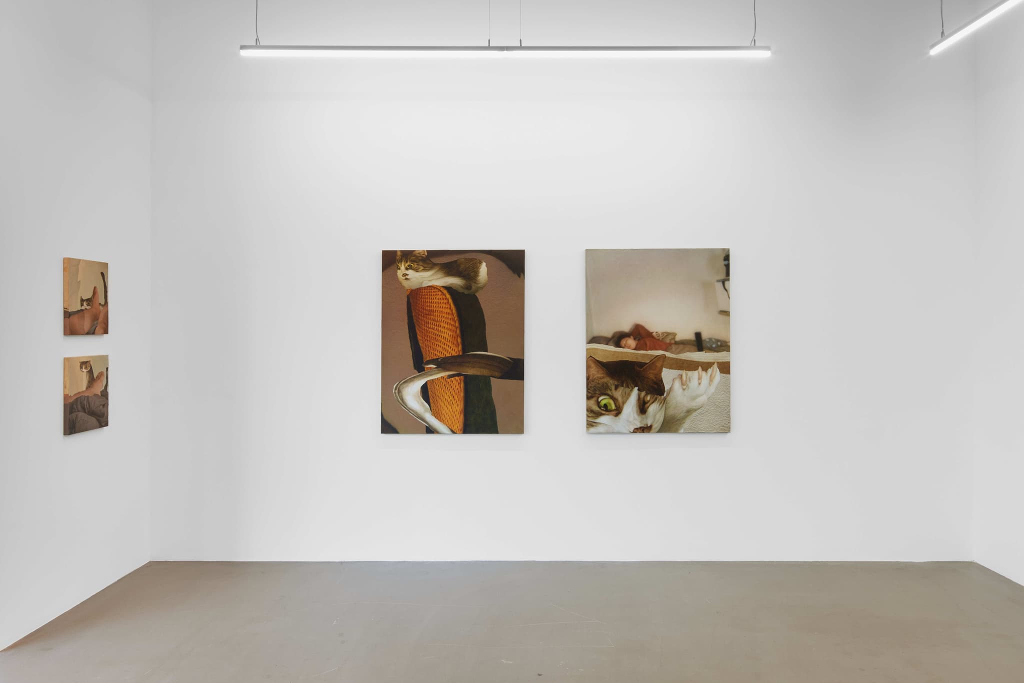 As the birth and death of images are repeated infinitely online, Ahn seeks to depict how technology and late capitalism have been corporally absorbed and continually alter our perception of reality. His practice honours the nonsense, ruse and the erroneous nature of existence. Resembling the filters we play with on our phones, he seamlessly texture-maps depictions of Hiro, his pet cat, onto organically contorting resin forms. Ahn confronts the malleability of representation and the enduring process of becoming. In his latest body of works, he introduces a new character into the memeitic universe of his own creation, Mako the kitten.