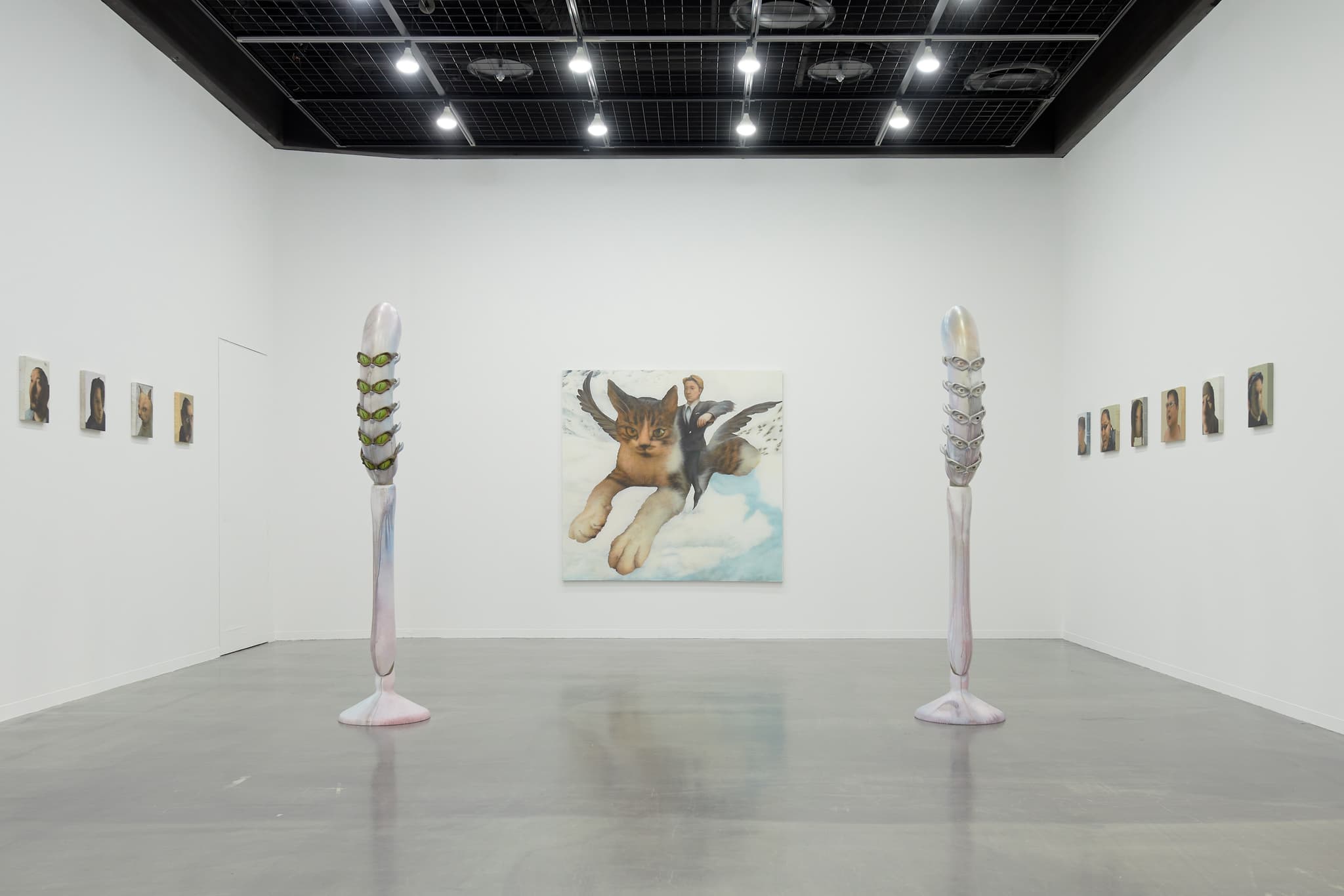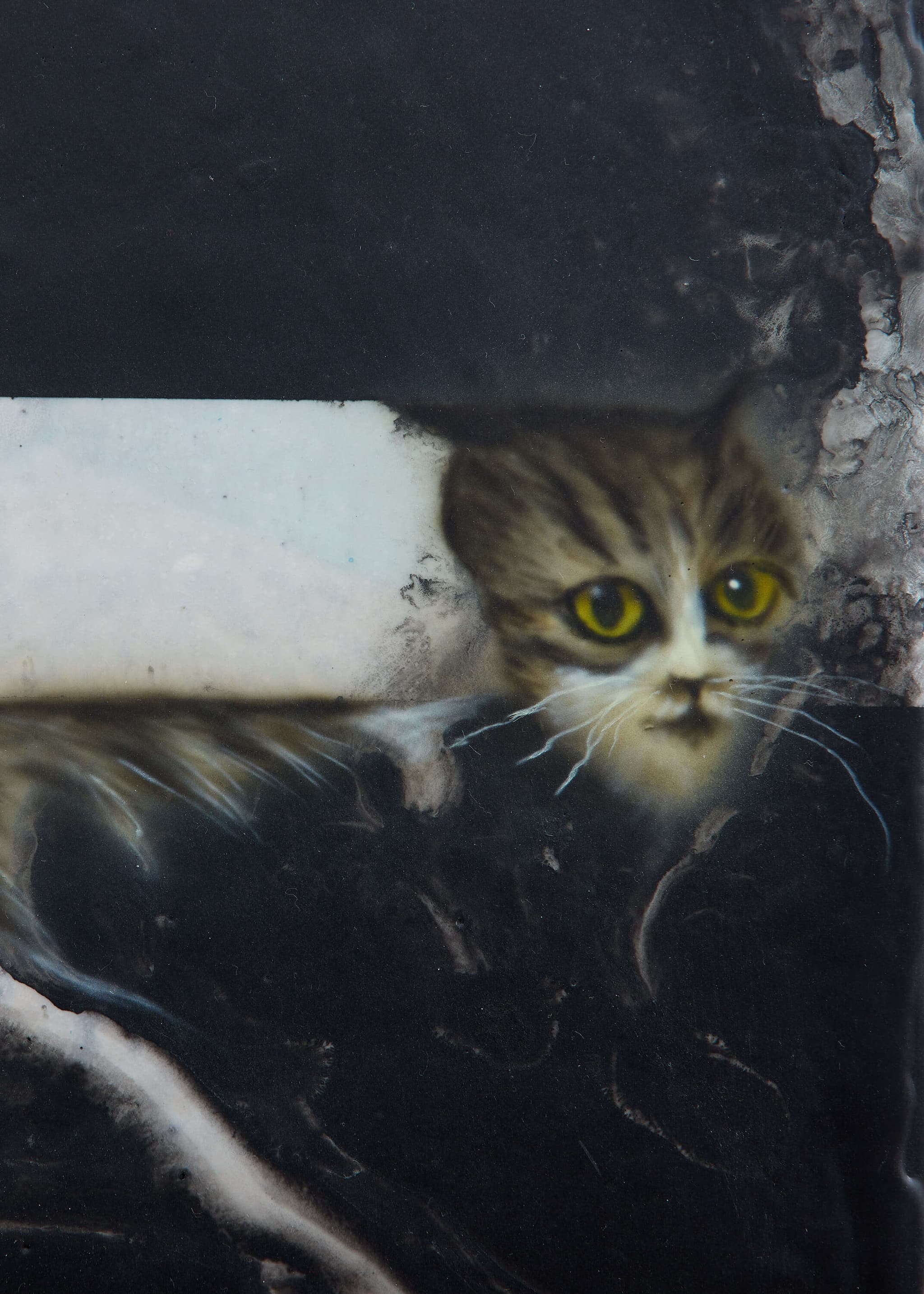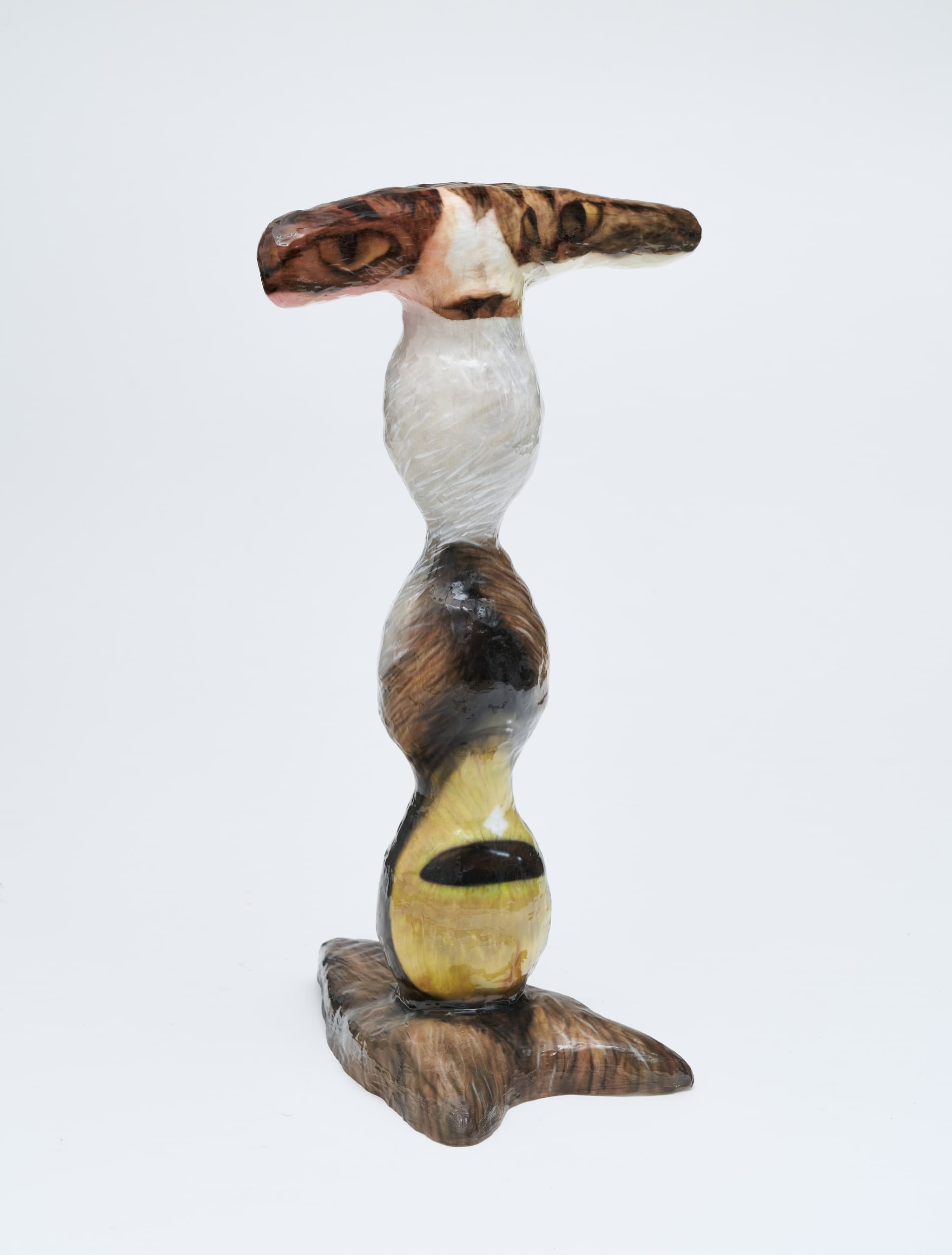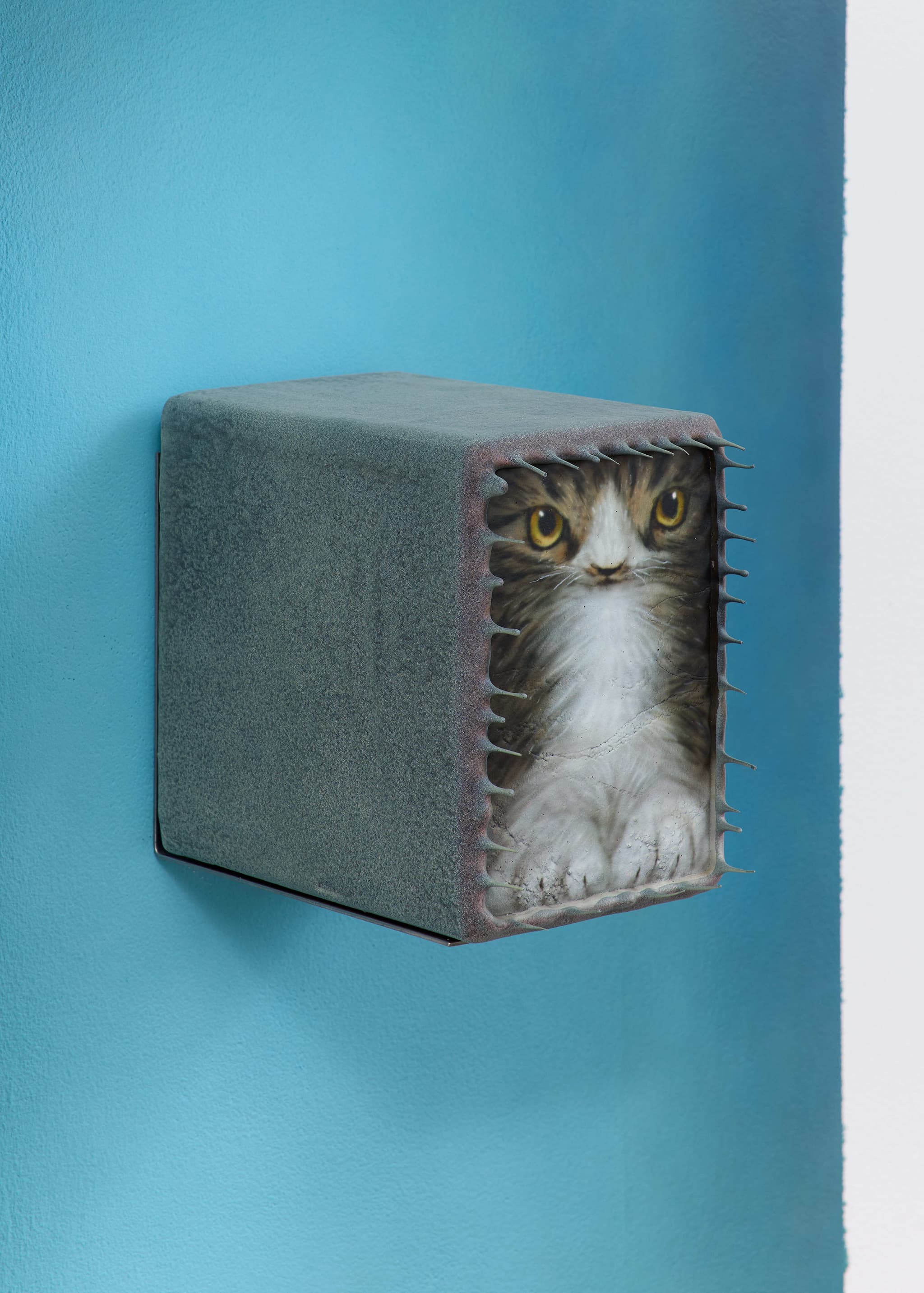 As the birth and death of images are repeated infinitely online, Ahn seeks to depict how technology and late capitalism have been corporally absorbed and continually alter our perception of reality. His practice honours the nonsense, ruse and the erroneous nature of existence. Resembling the filters we play with on our phones, he seamlessly texture-maps depictions of Hiro, his pet cat, onto organically contorting resin forms. Ahn confronts the malleability of representation and the enduring process of becoming. In his latest body of works, he introduces a new character into the memeitic universe of his own creation, Mako the kitten.