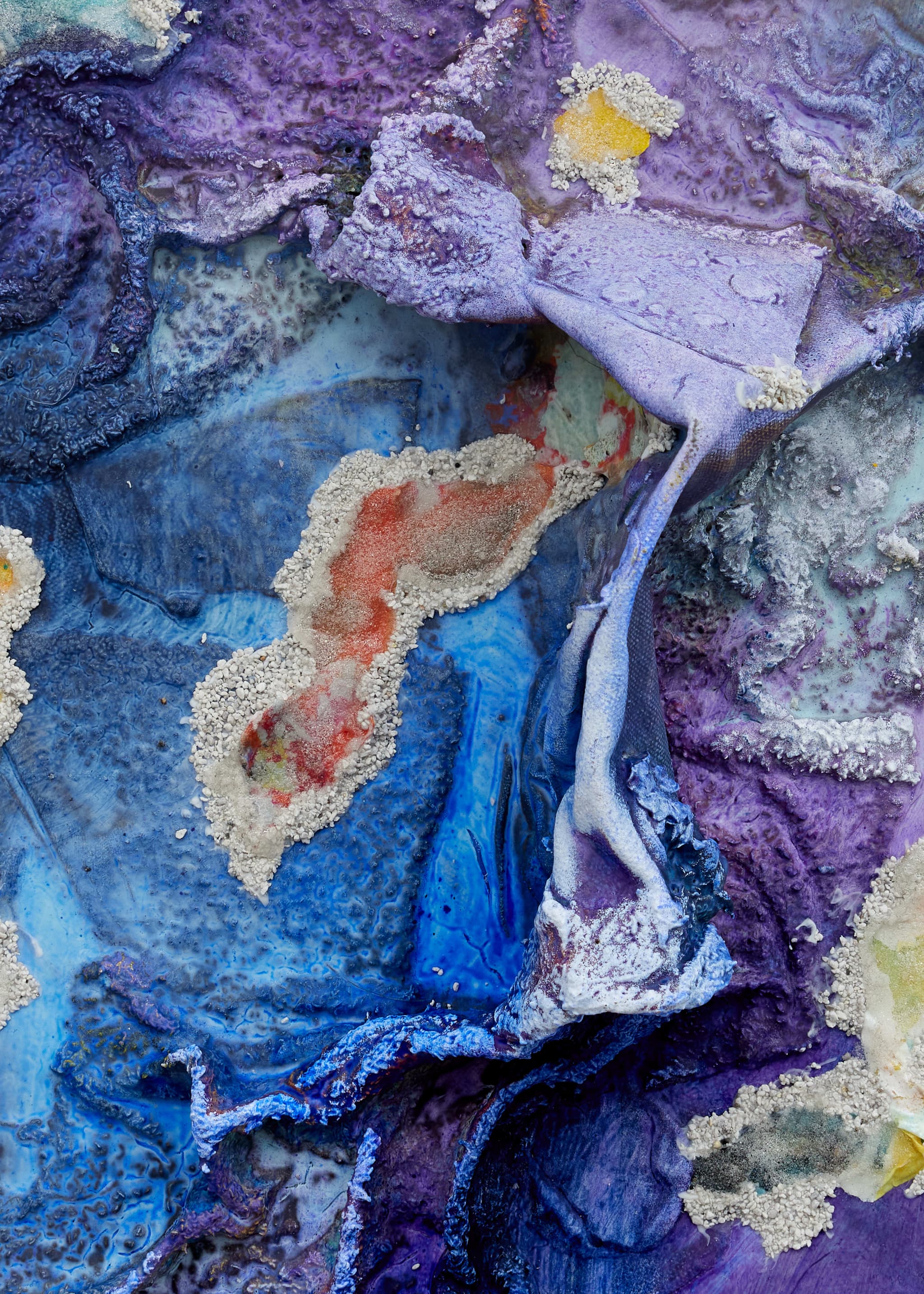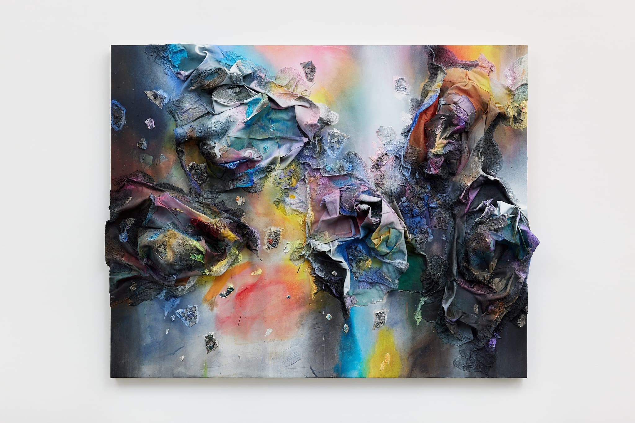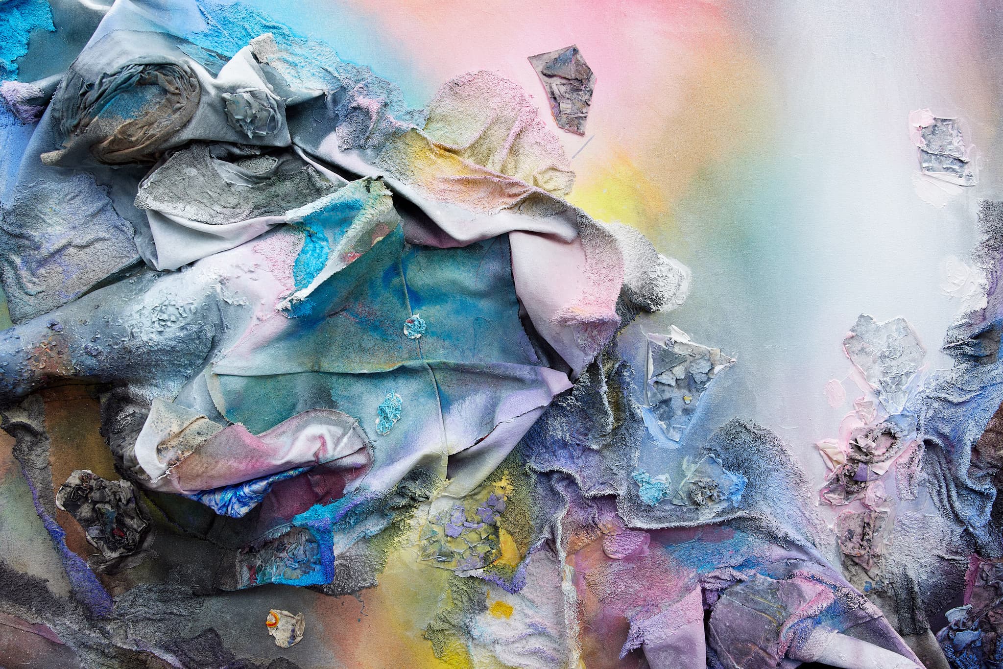 Canvas scraps, used studio rags, used studio clothing, paper fragments, paint chips, pumice, glass beads and acrylic paint on canvas