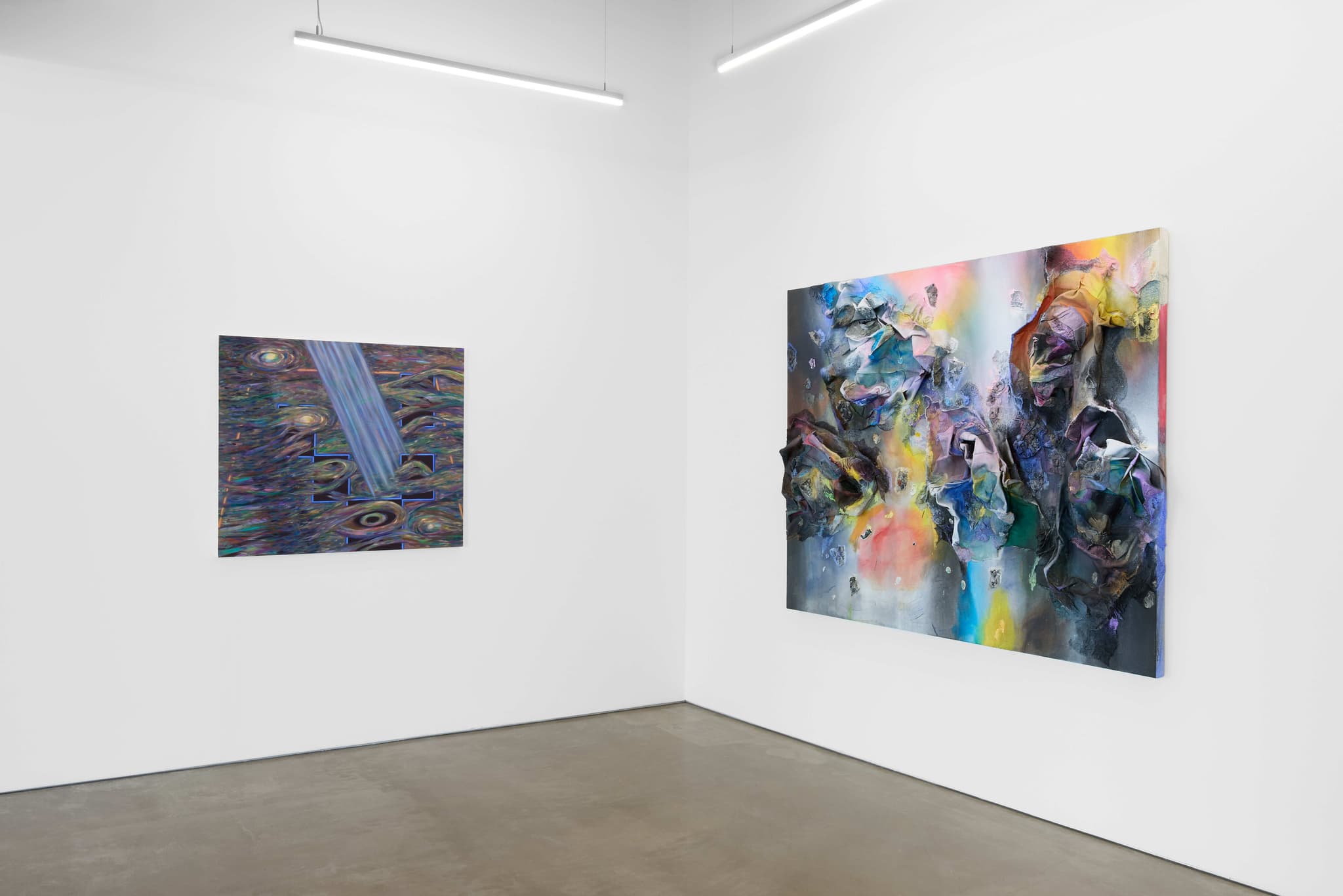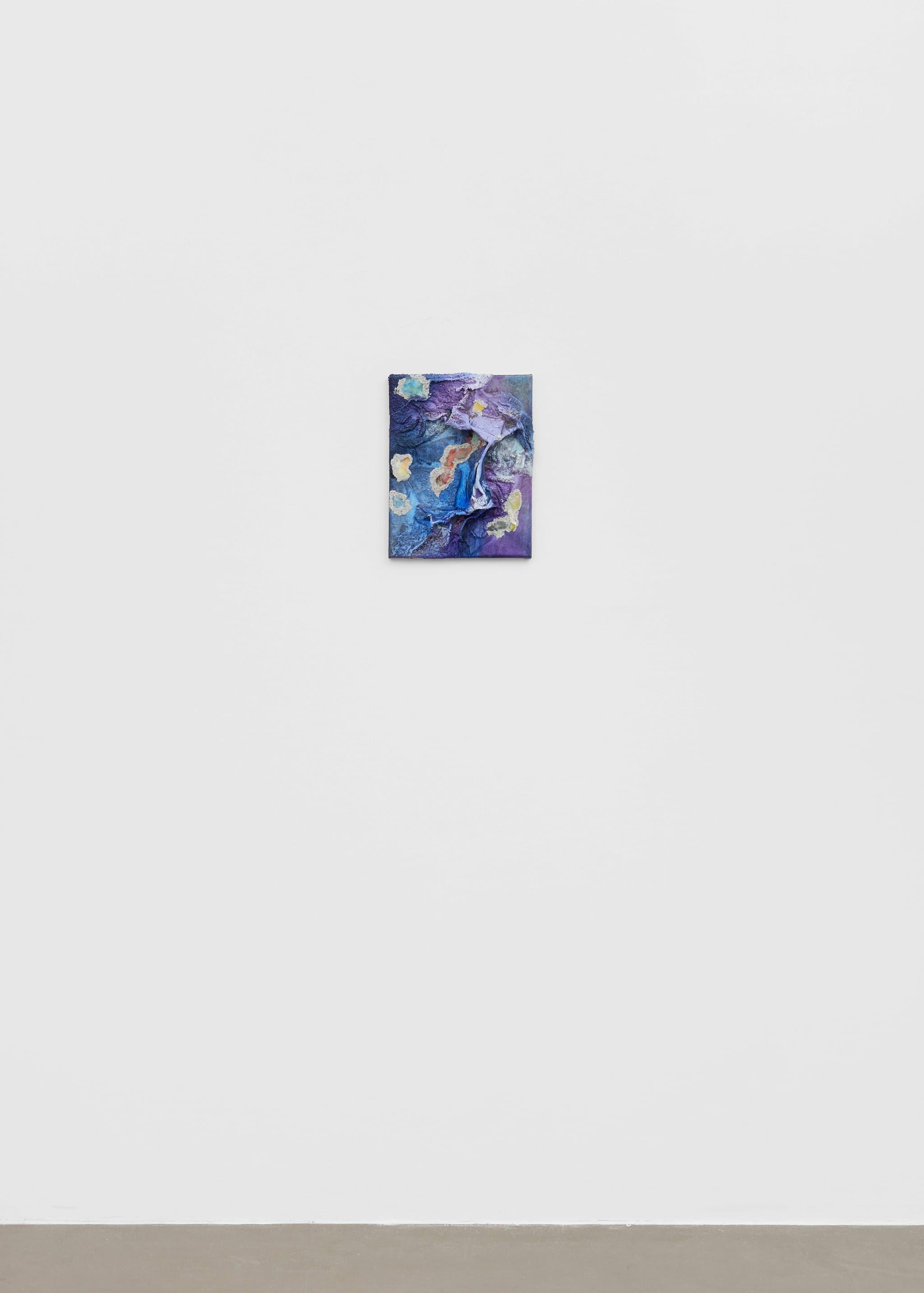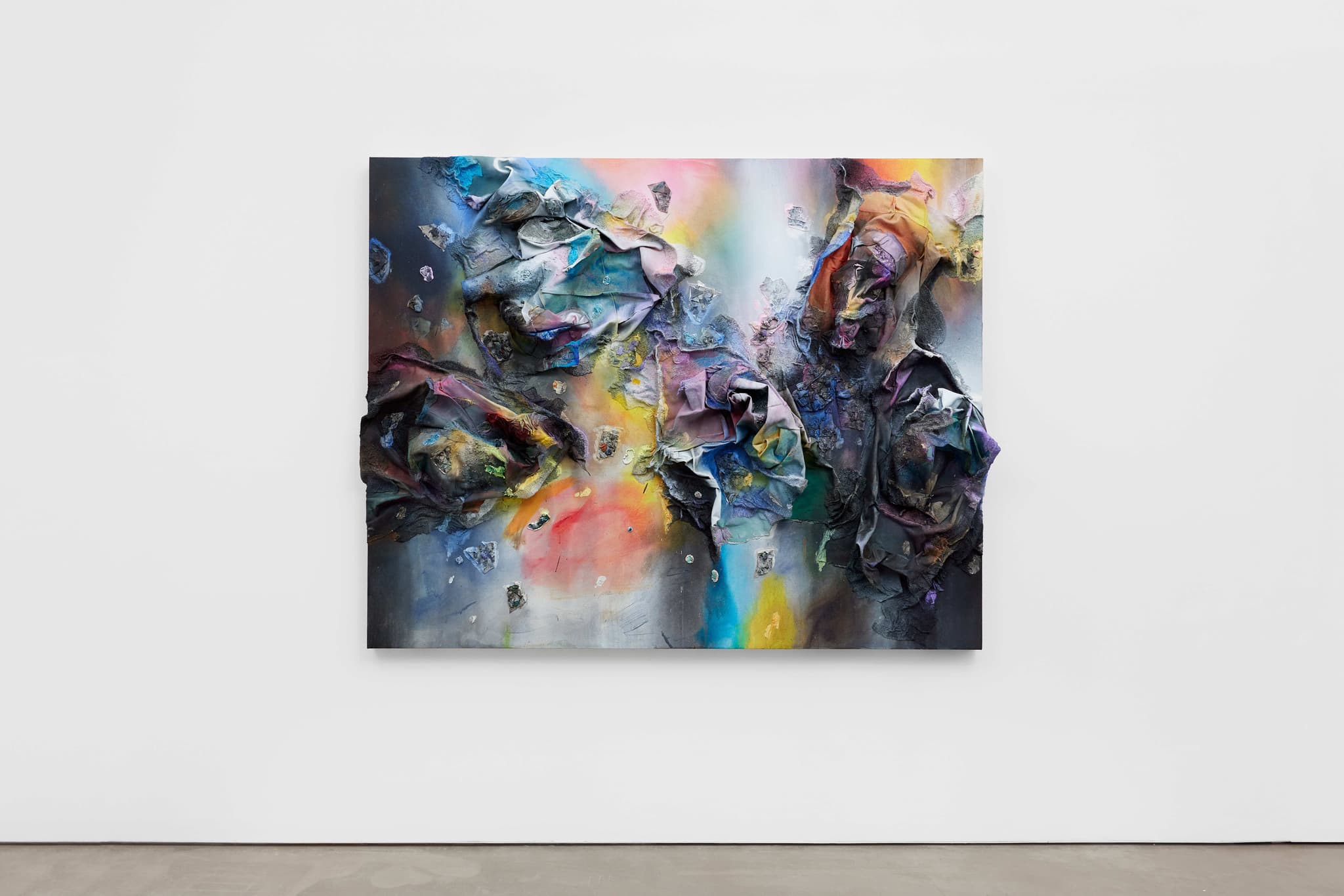 Martinez’s process is equally intuitive and revealing. The artist collects textiles and other materials often sourced from loved ones, which are then soaked in paint, reconfigured and splayed onto the canvas. These are combined with scraps and paint chips, saved and hardened over many months, with industrial materials such as sawdust and iron oxide to build up the surfaces, agglomerations that coalesce into linkages that relate to the body and emergence of form. The colours emerge out of darkened or muddied grounds, possessing a halo of phosphorescent chalkiness, an afterglow, emitting a kind of powdery materiality. Their canvases are fluid experiments in material, colour, and gesture. Through material citation, Martinez keeps the previous material owners’ memories alive. Everything is in a continuous state of becoming.