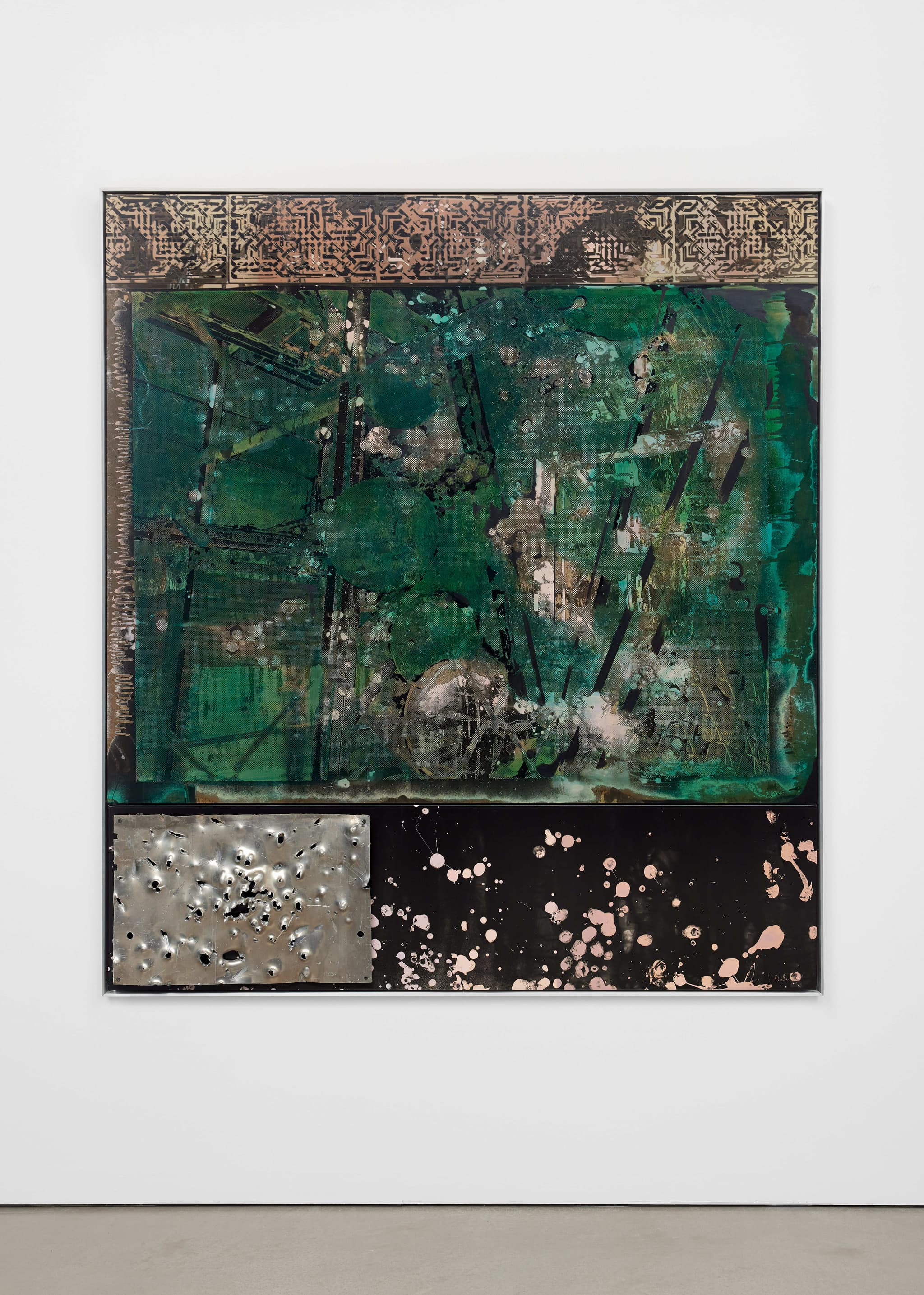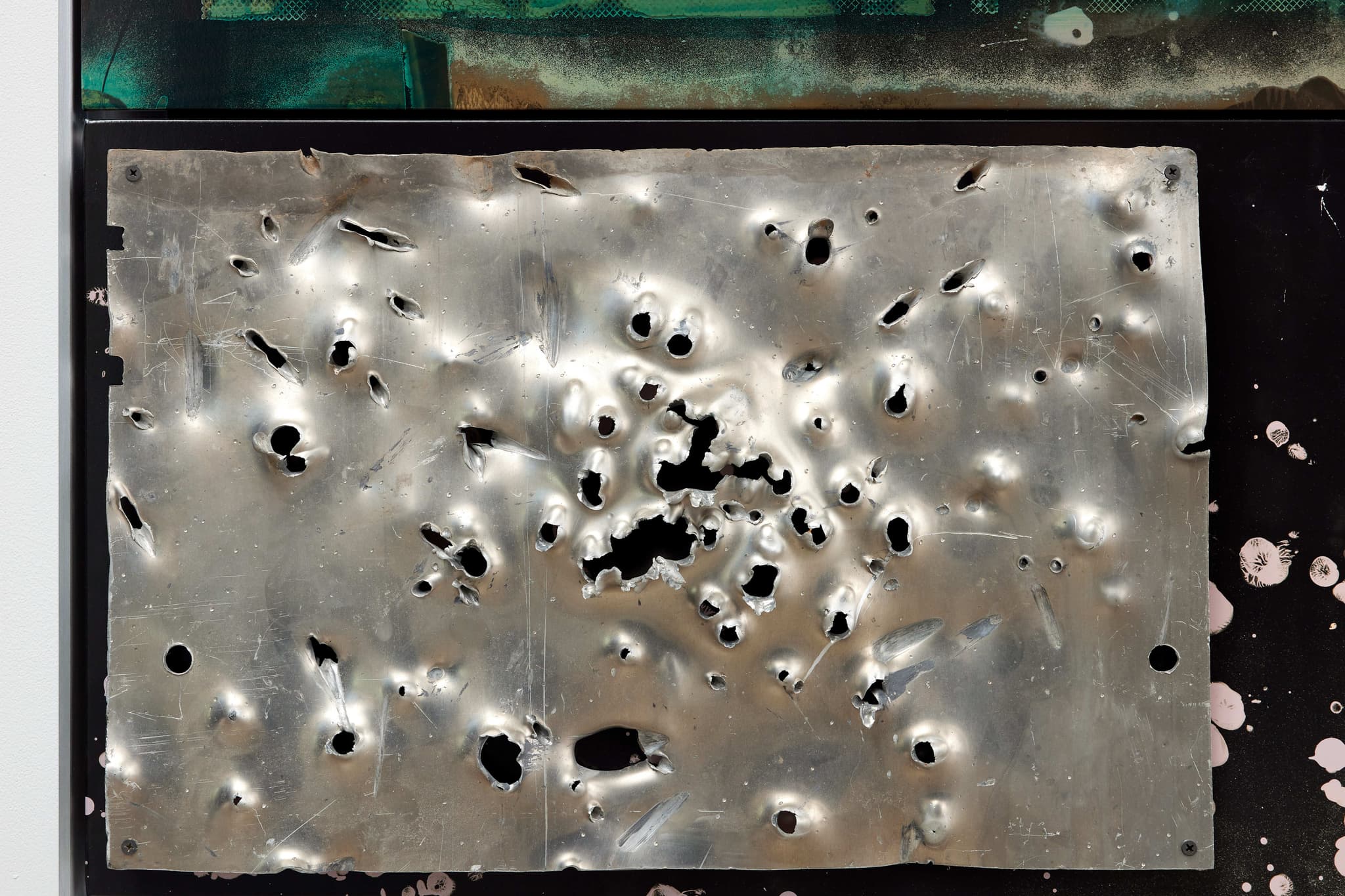 Unique chemical painting on light-sensitive silver gelatin paper, acrylic, bullet-pierced aluminium relief in custom aluminium frame