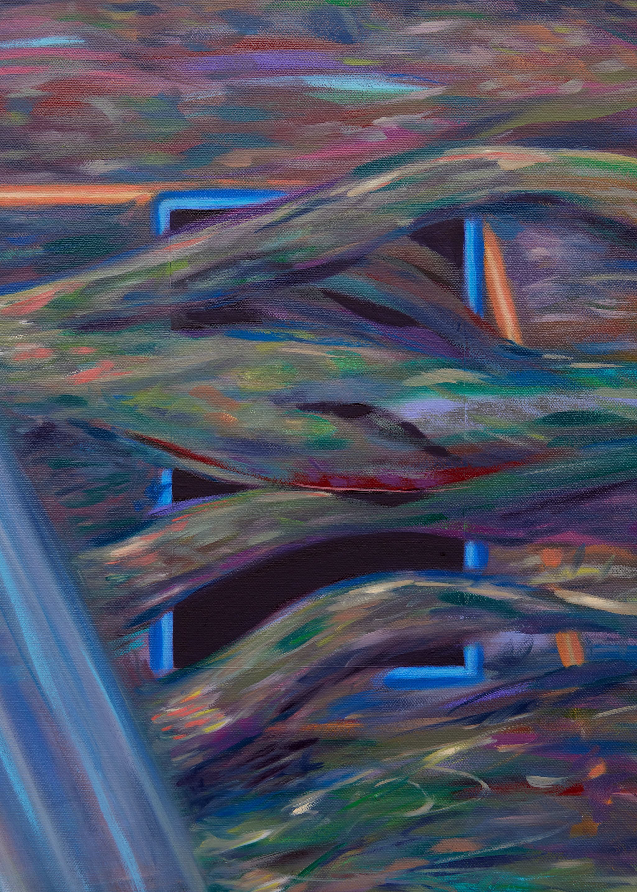 Rather than literal representations of objects or gestures of pure abstraction, Kerr’s paintings appear as portals or fragments of time and memory. Her compositions seem fleeting, but grounded, hovering between time and space. The paintings are more than a compilation of references but vast collections of information — iconography, gestures, scavenges. They appear to draw from collective memory or landscape, not as appropriation, but as an attitude, a reflection of the artist. They seem to tell open ended narratives or dreams. Kerr's recent paintings exude an emergence of colour and form from a darkened or muddied atmosphere, a luminesce which appears to reveal something previously concealed, a kind of interior logic of the painting itself. In Kerr’s paintings, the act of viewing is itself a form of scavenging.