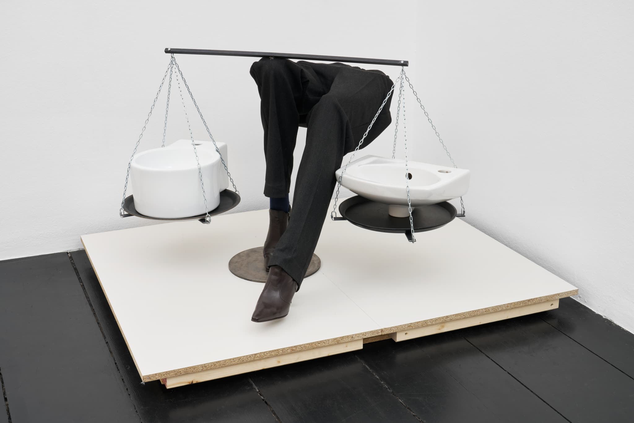 Installation with desk, chair, laptop, mouse, keyboard, artist's website, platform, mannequin legs, sinks, chain, trays, obs boards, dimensions variable.