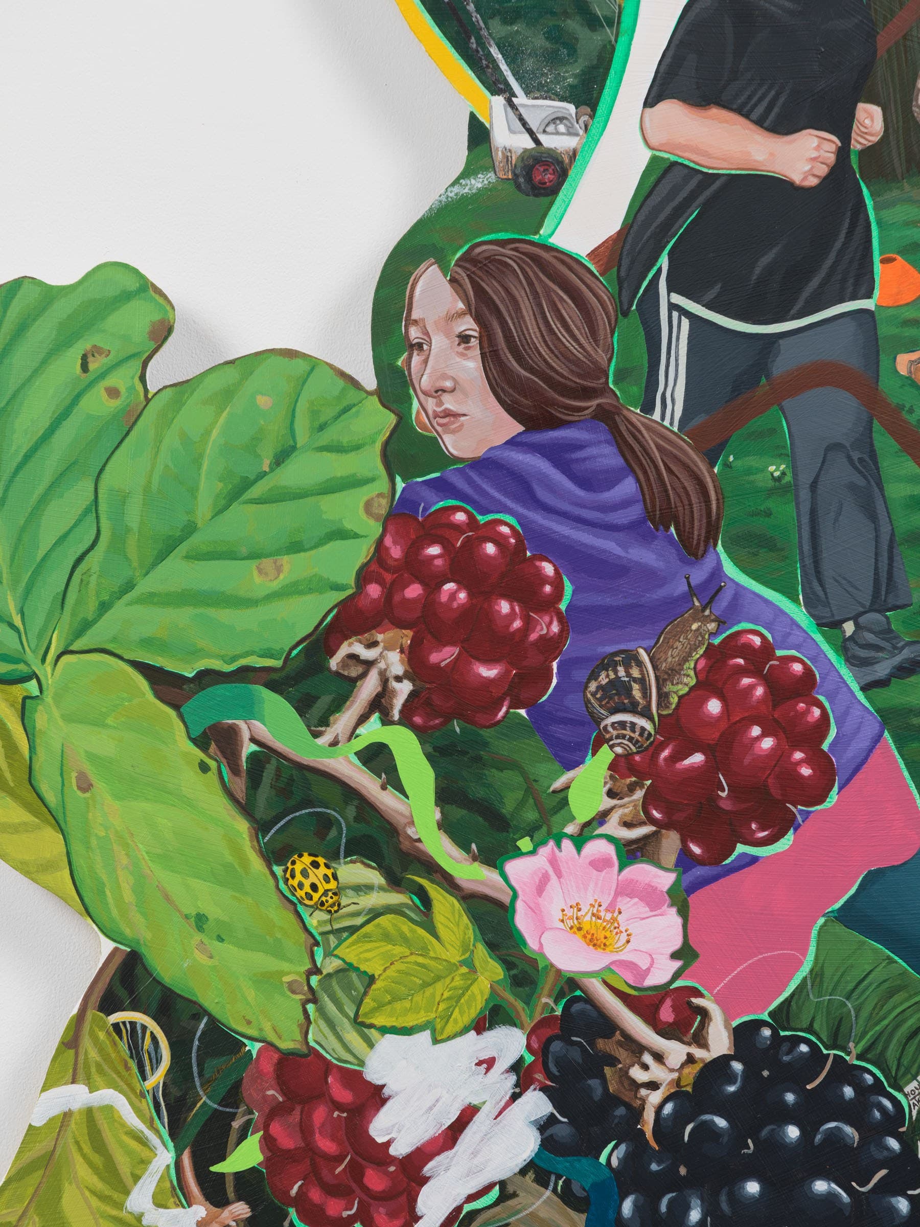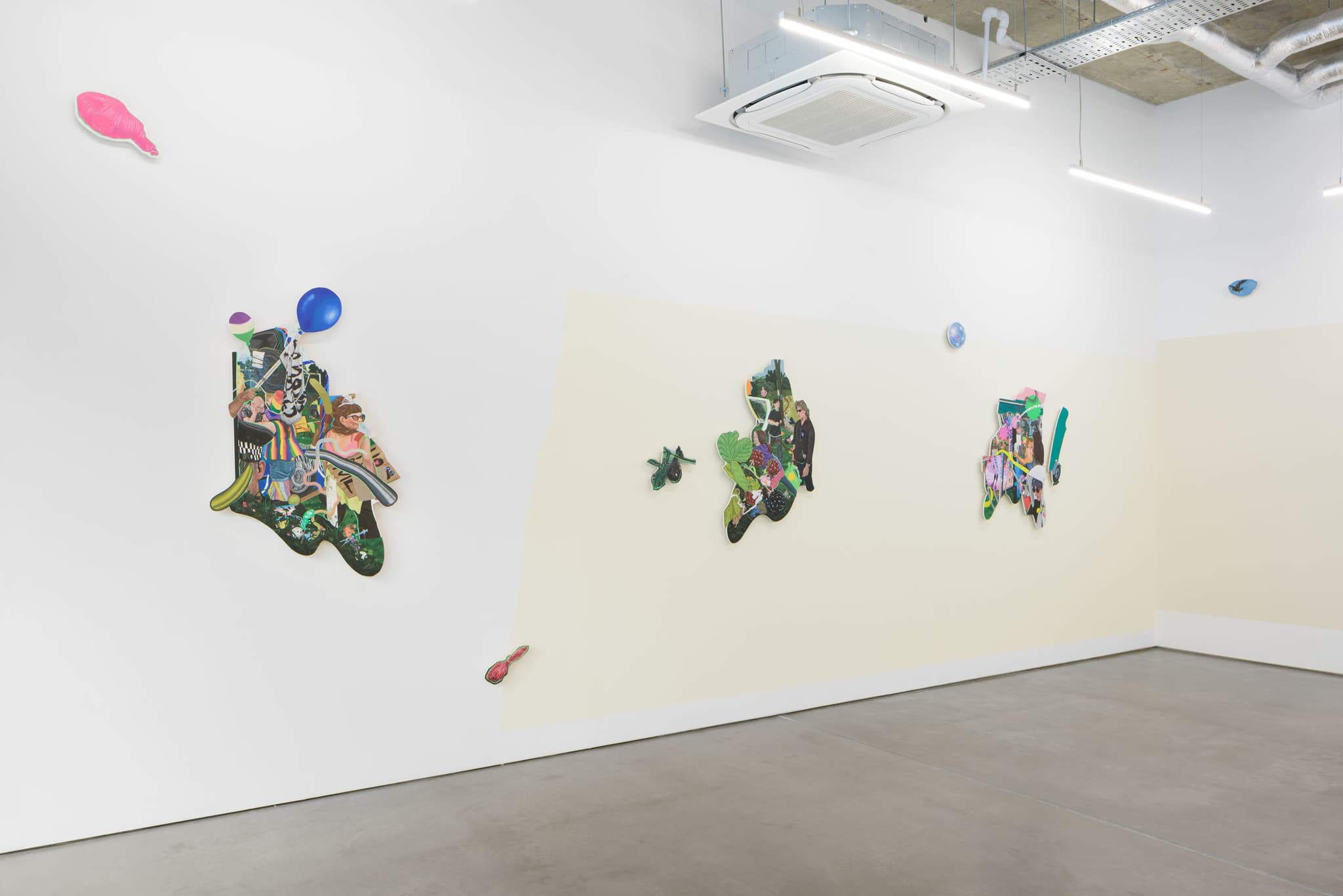 In The bramble, 2022, a wearied parent waits as a child picks blackberries, below them a dormouse clambers away out of reach. A LGBTQ+ Pride event is framed between a COVID 19 testing site and a policeman, peering out over a hedge in Hold me hold my placard, 2022. Other figures congregate around marquees and kiosks, their faces mask-like, out of sync. The works are installed on a site specific wall painting rendered in varying shades of beige. The hues specifically chosen by the artist to evoke the characteristic gazebos that populate the transient events depicted, where people shield under these often faded and degraded structures. Together these intimate descriptions act as a wider metaphor for the fragility of our ecologies, under countless social, environmental and economic challenges of recent years. Our longings to gather together in these public spaces, and our often-thwarted attempts at truly connecting within them.