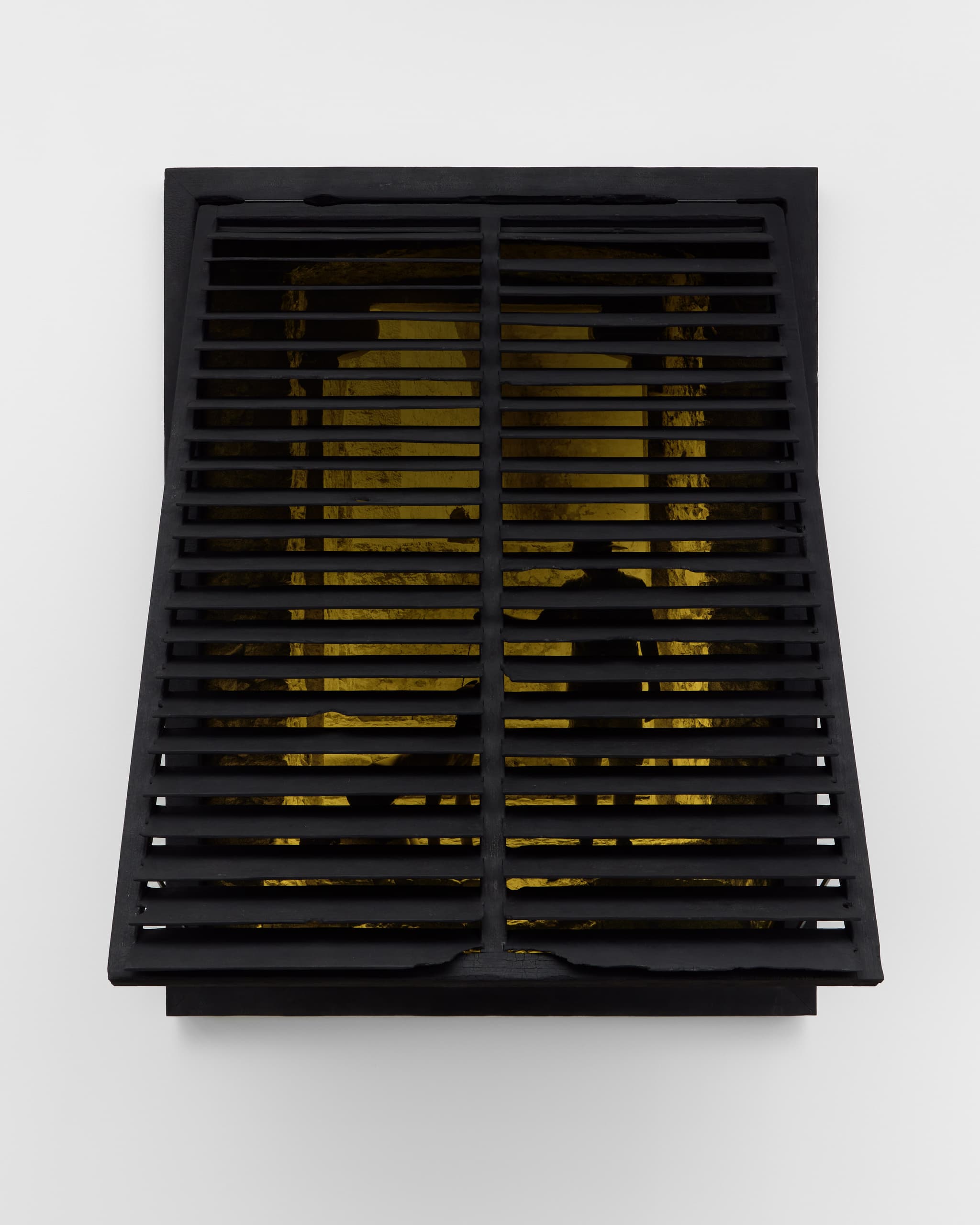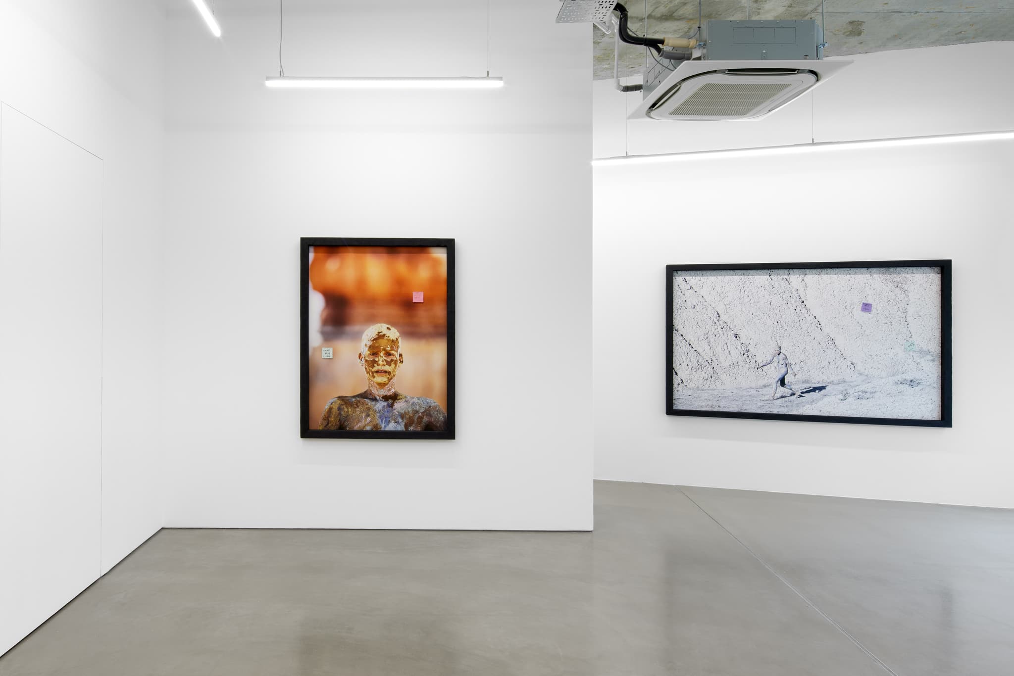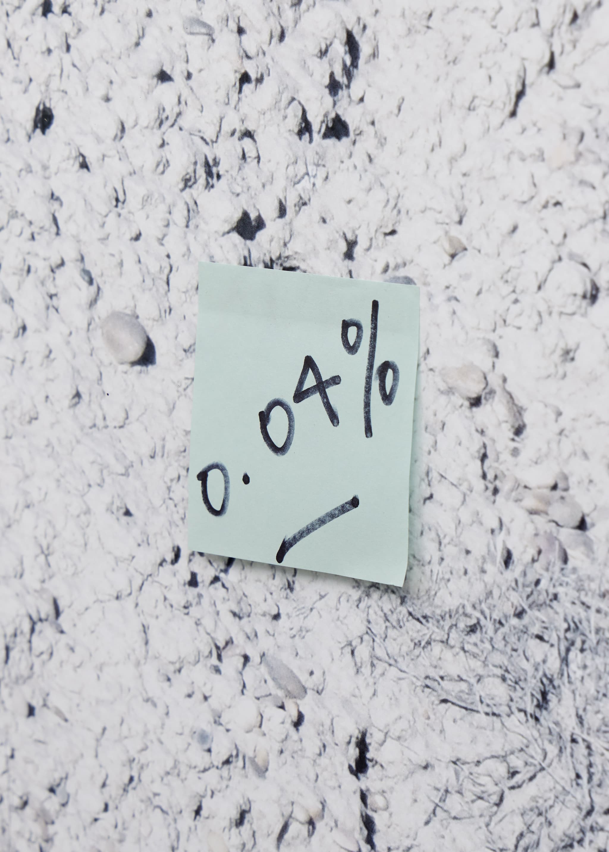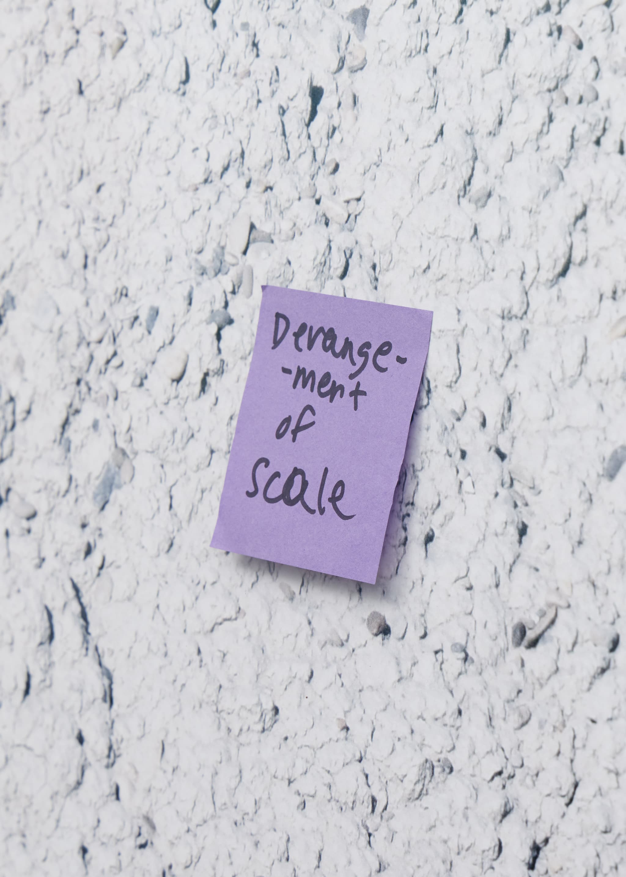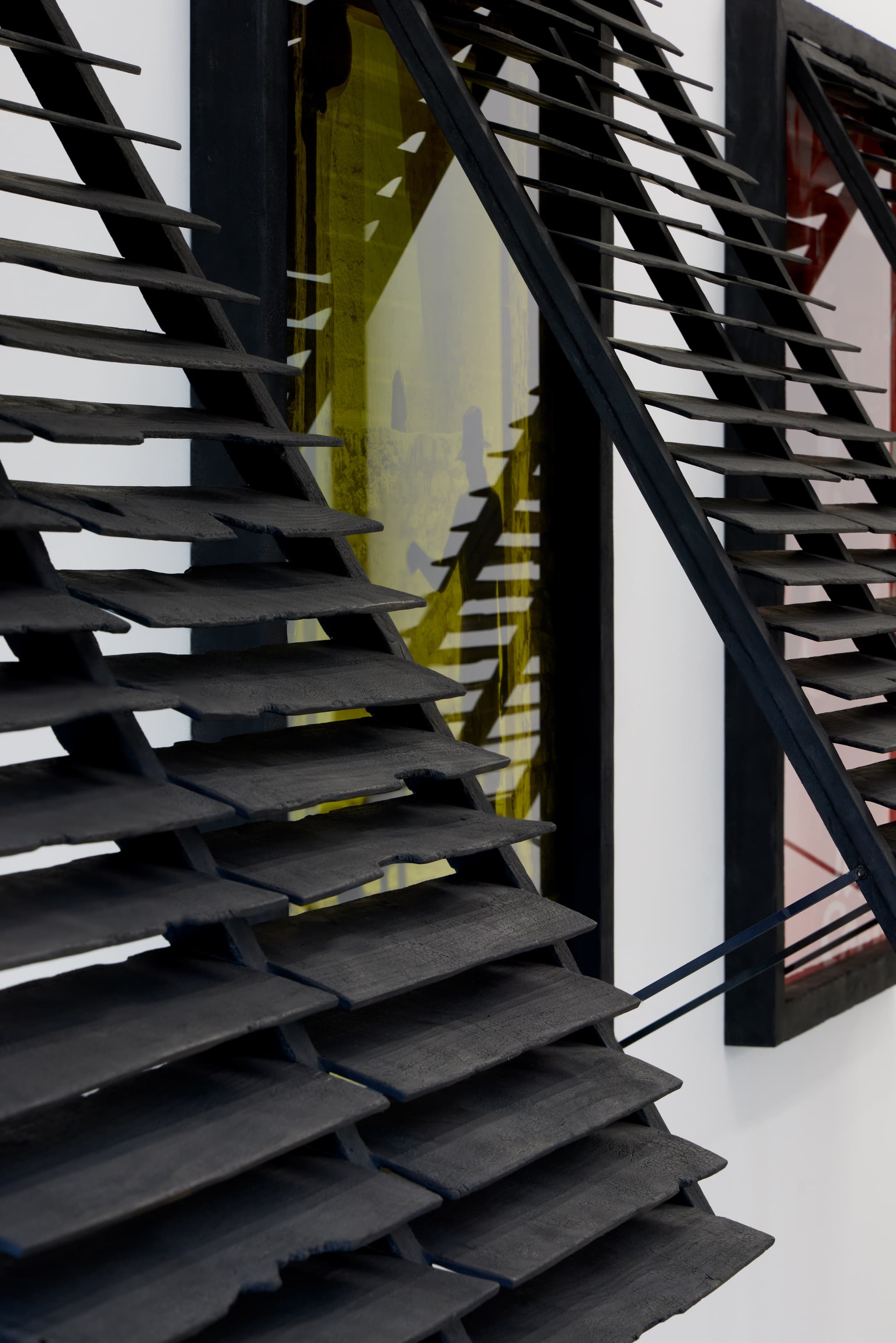 The derangement of scale (2) caused by the huge gap between the immensity of humanity’s global existence and the smallness of your own private everyday life (3) are like the post-its (4) strewn across the photographs. Thoughts so important we can’t forget, but not so important that we won’t toss them in the trash. Like a remnant of our egoistic apocalypse fantasies, the hurricane shutters that encase the images may have resisted the 2500°C flames they were subjected to, but not without getting burnt.
