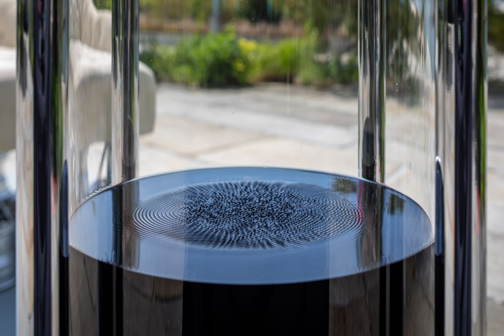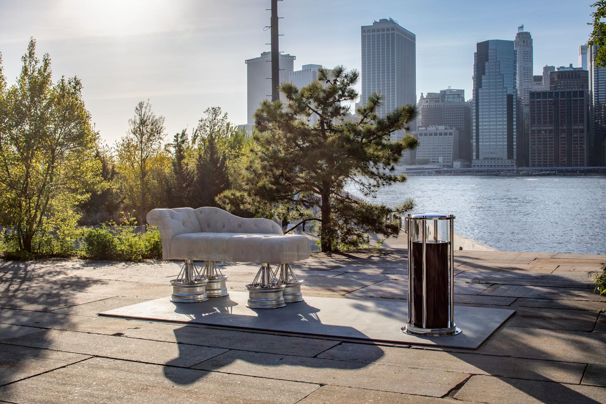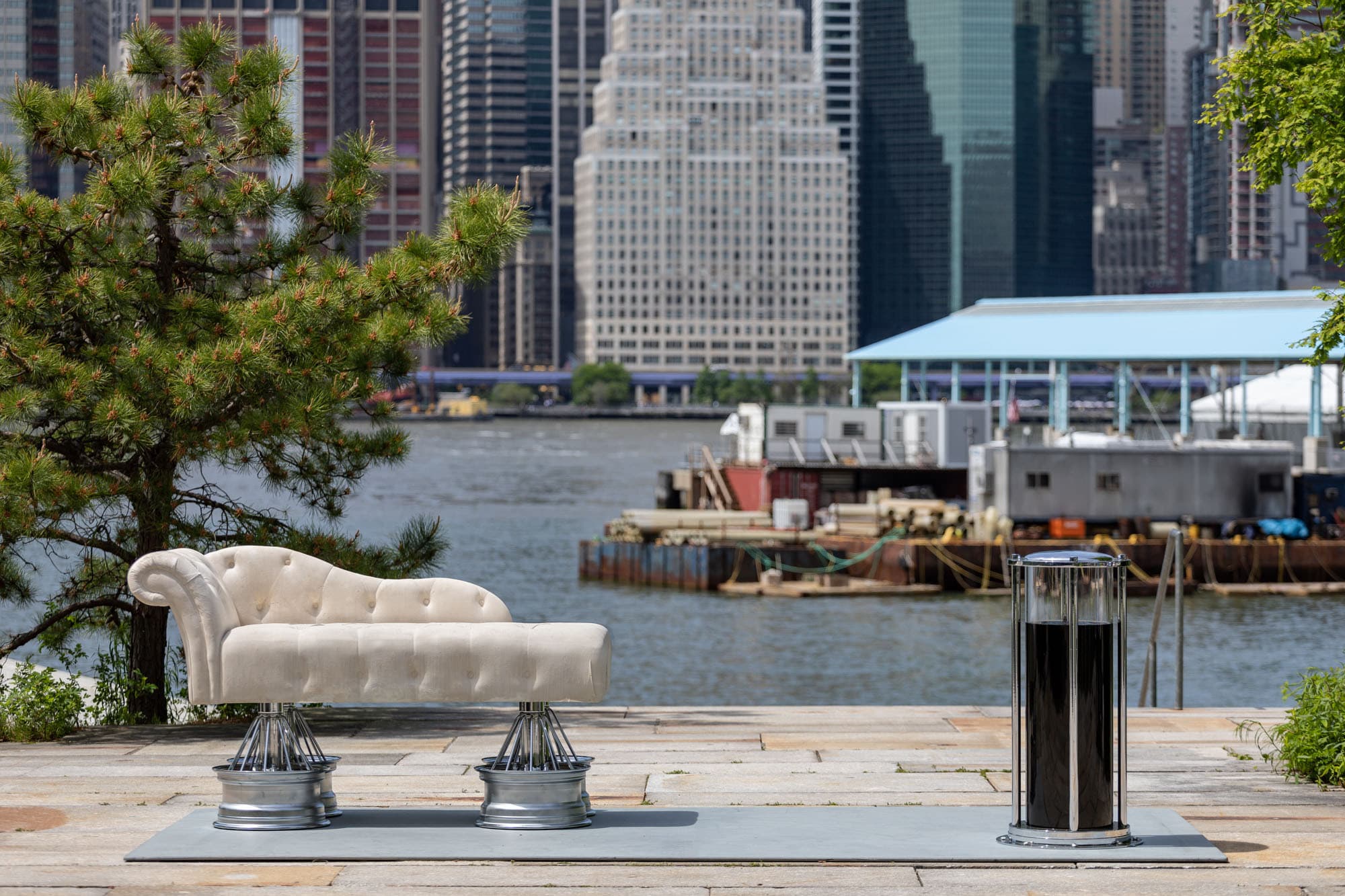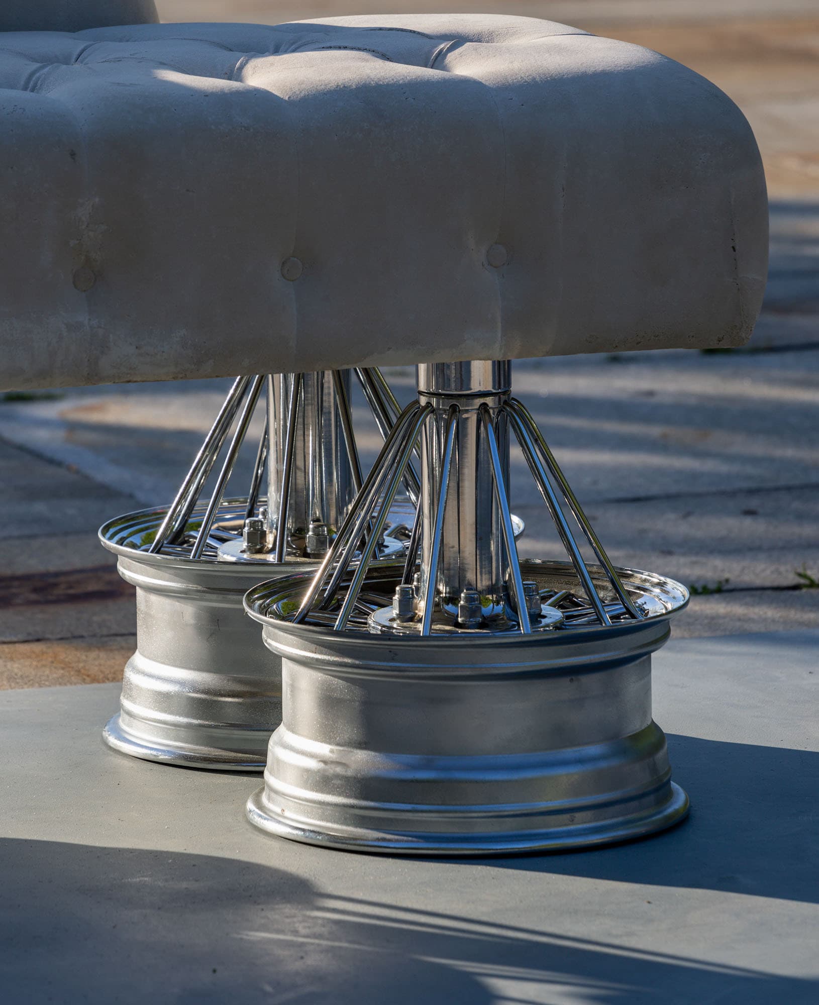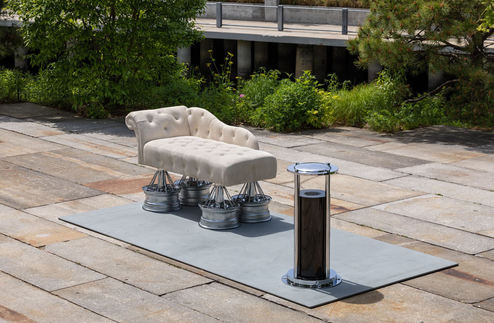 Dozie Kanu has created an ensemble of surreal objects that highlights the tensions between public and private aspects of the self, titled On Elbows. A vessel of black liquid that pulses at the rate of a human heartbeat and a chaise longue chair (typically associated with psychoanalysis) cast in concrete evoke self-reflection and also the murky depths of the individual and collective unconscious. The sofa’s “Texan Wire Wheels” rims (also referred to as “elbows” or “swangas”) reference the vibrant automobile “SLAB culture” of the artist’s native Houston. He describes the customization of cars within this tradition as a “free and playful fashioning of one’s own material property – gestures that I find deeply complex and layered given the relationship that Black Americans continue to navigate between ownership and agency.”