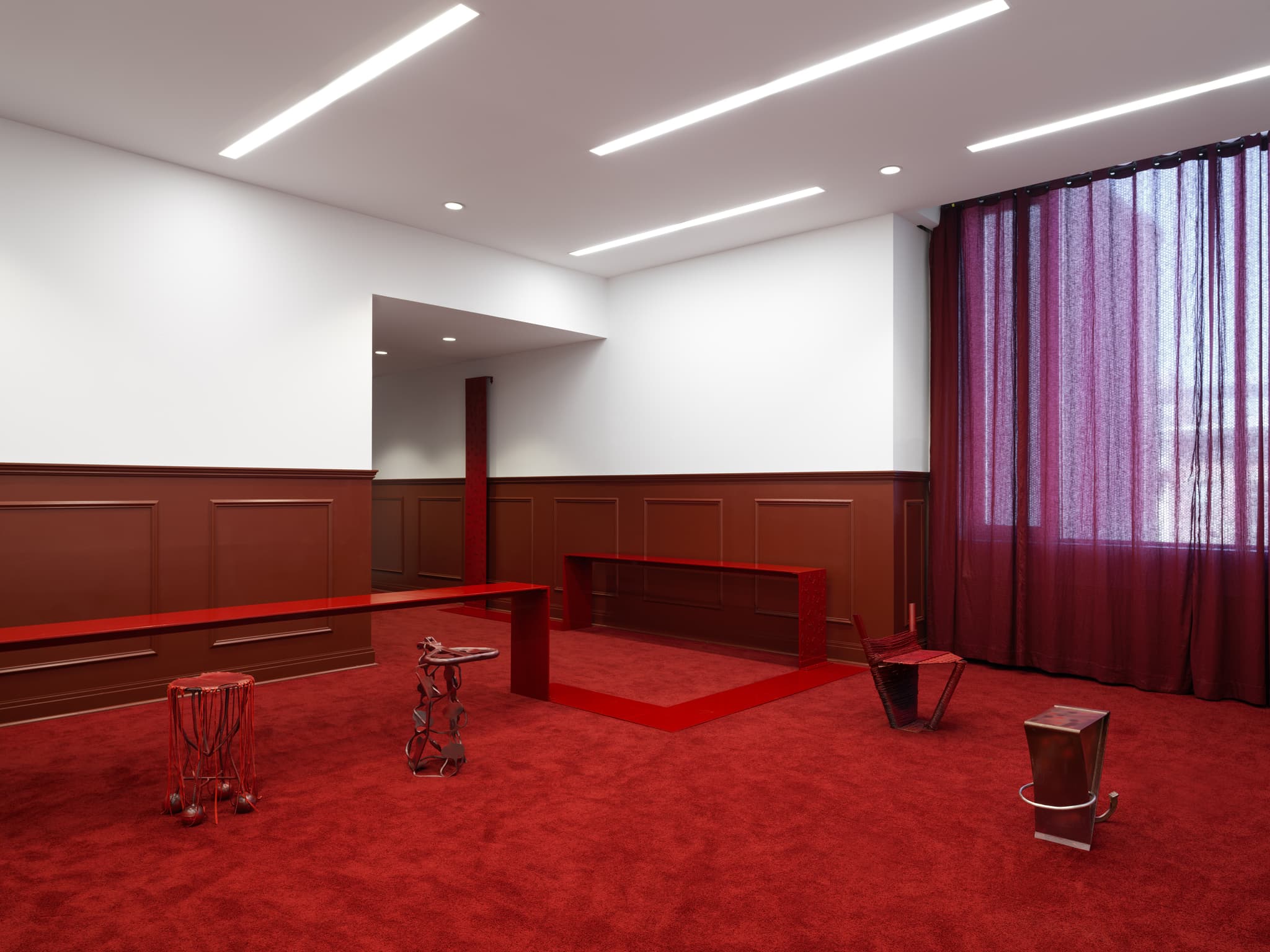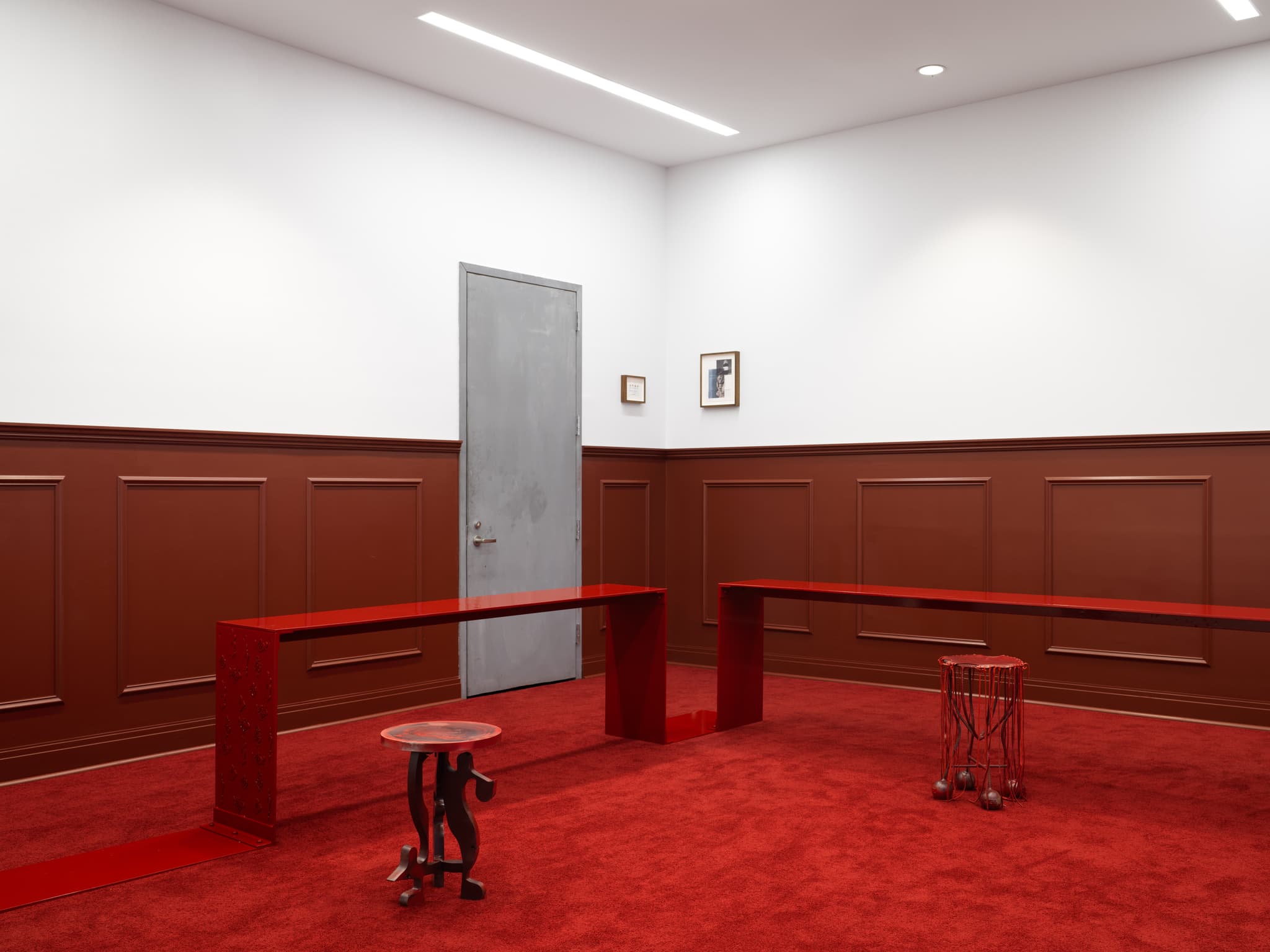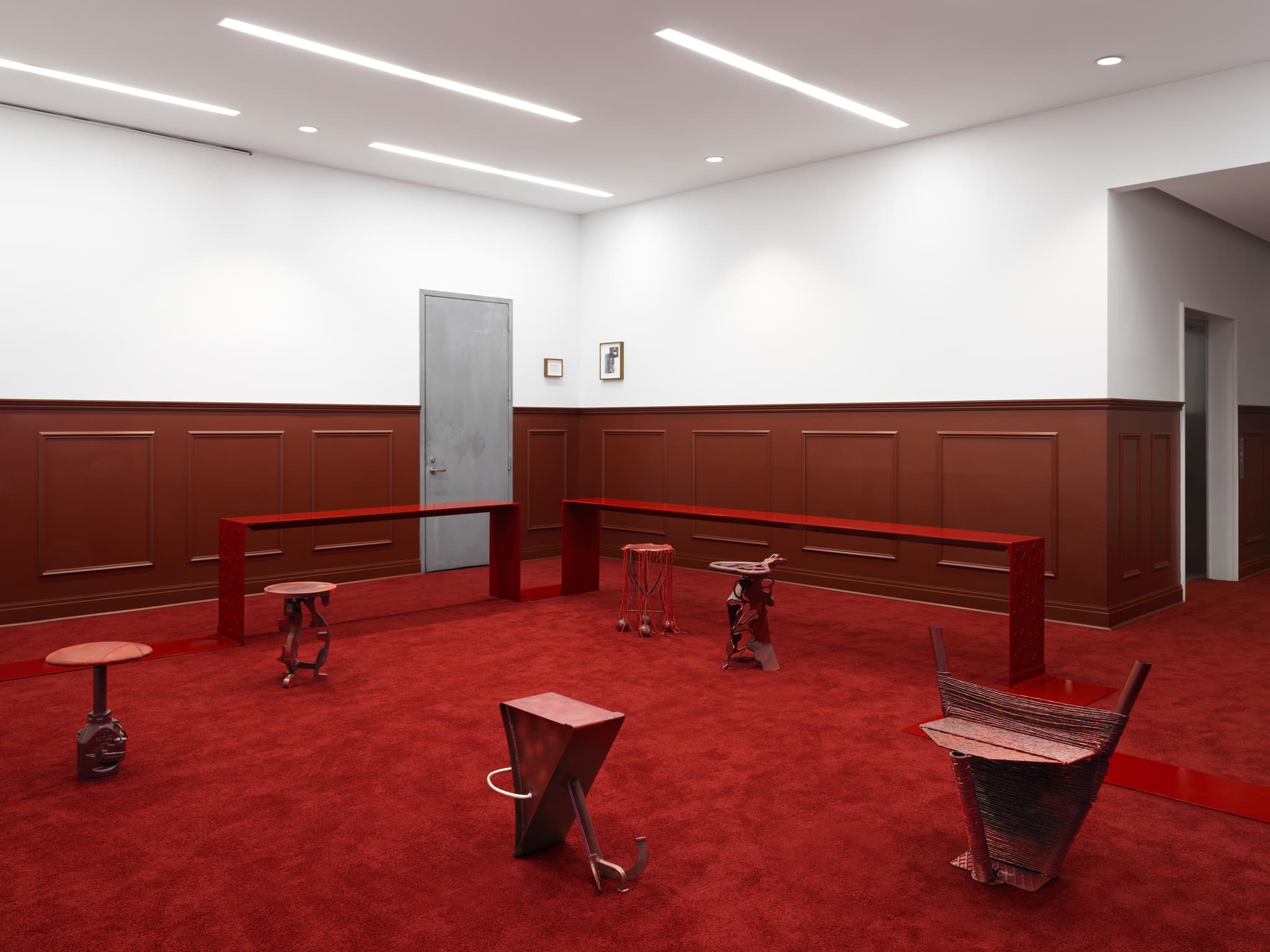 In his sculptural work Kanu often teases and disrupts functionality by juxtaposing the utterly familiar and domestic with jarring culturally evocative materials. In the case of Blood Typethe banal discomfort of a present day co-working space is undercut with anachronistic shapes from Portugal, Nigeria, and America that trace a darker entangled past. The artist—born in Houston, TX to Nigerian immigrant parents, and currently residing in a warehouse he converted in rural Portugal—offers up history and autobiography as a gathering space: to be filled with performances, visitors, and community members each bringing multitudes of interpretation to its charged surfaces.