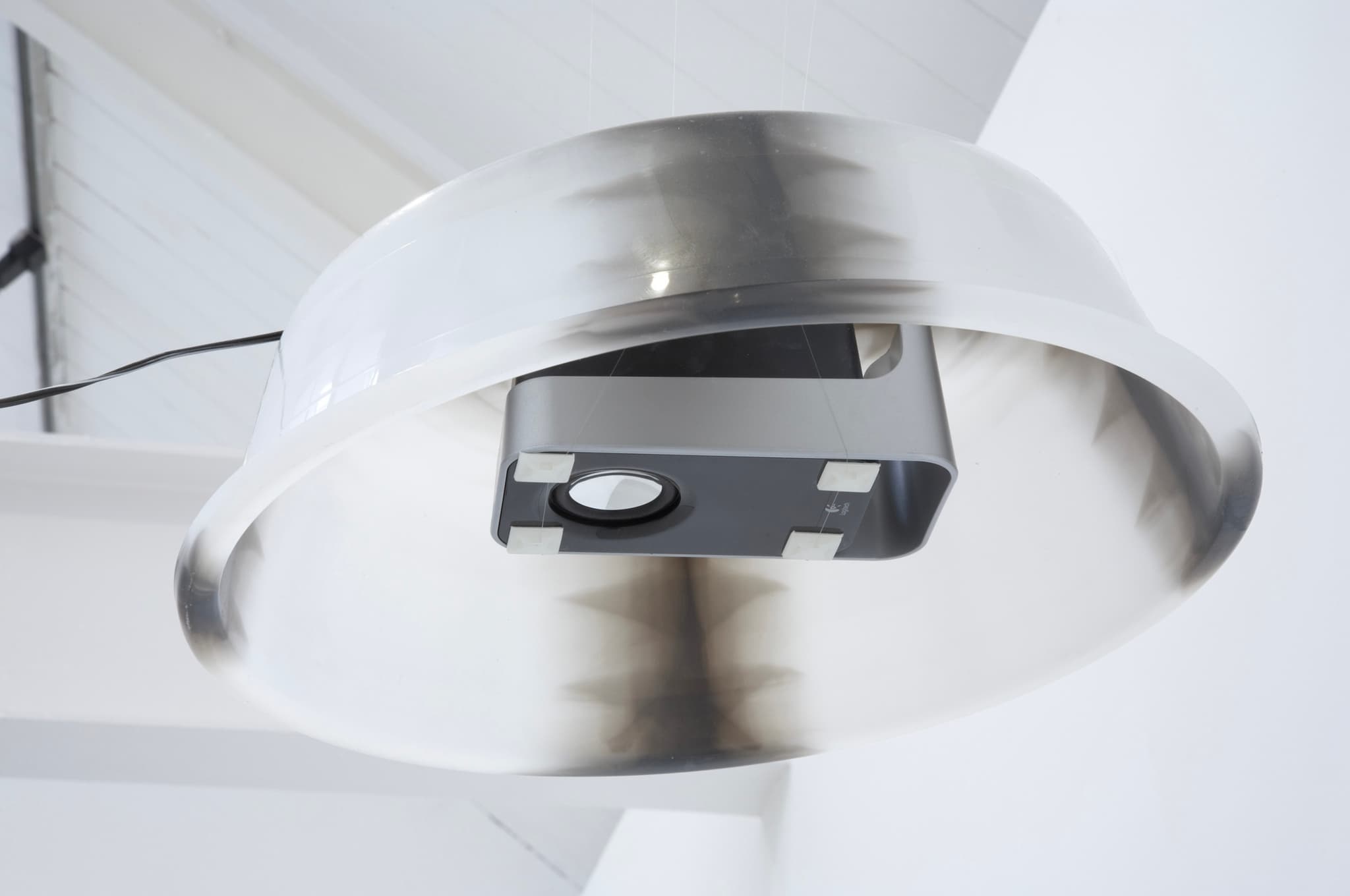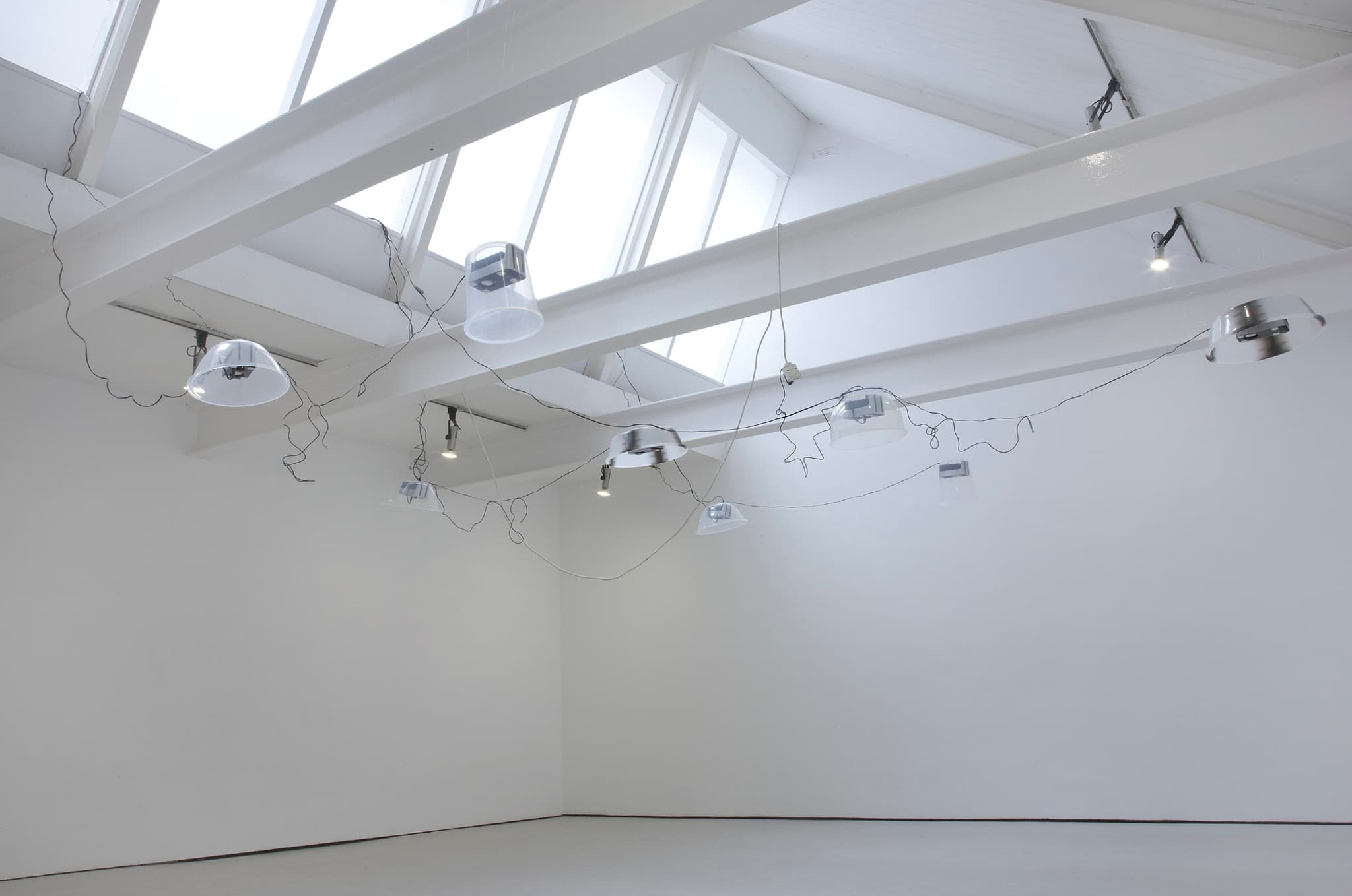 Incorporating the architectural features of the gallery, each of the eight speakers hangs above head height from one of four horizontal metal girders. They are suspended inside domes that direct these sounds into a human sized zone, allowing the viewer to tune into individual tracks by standing below these makeshift devices.