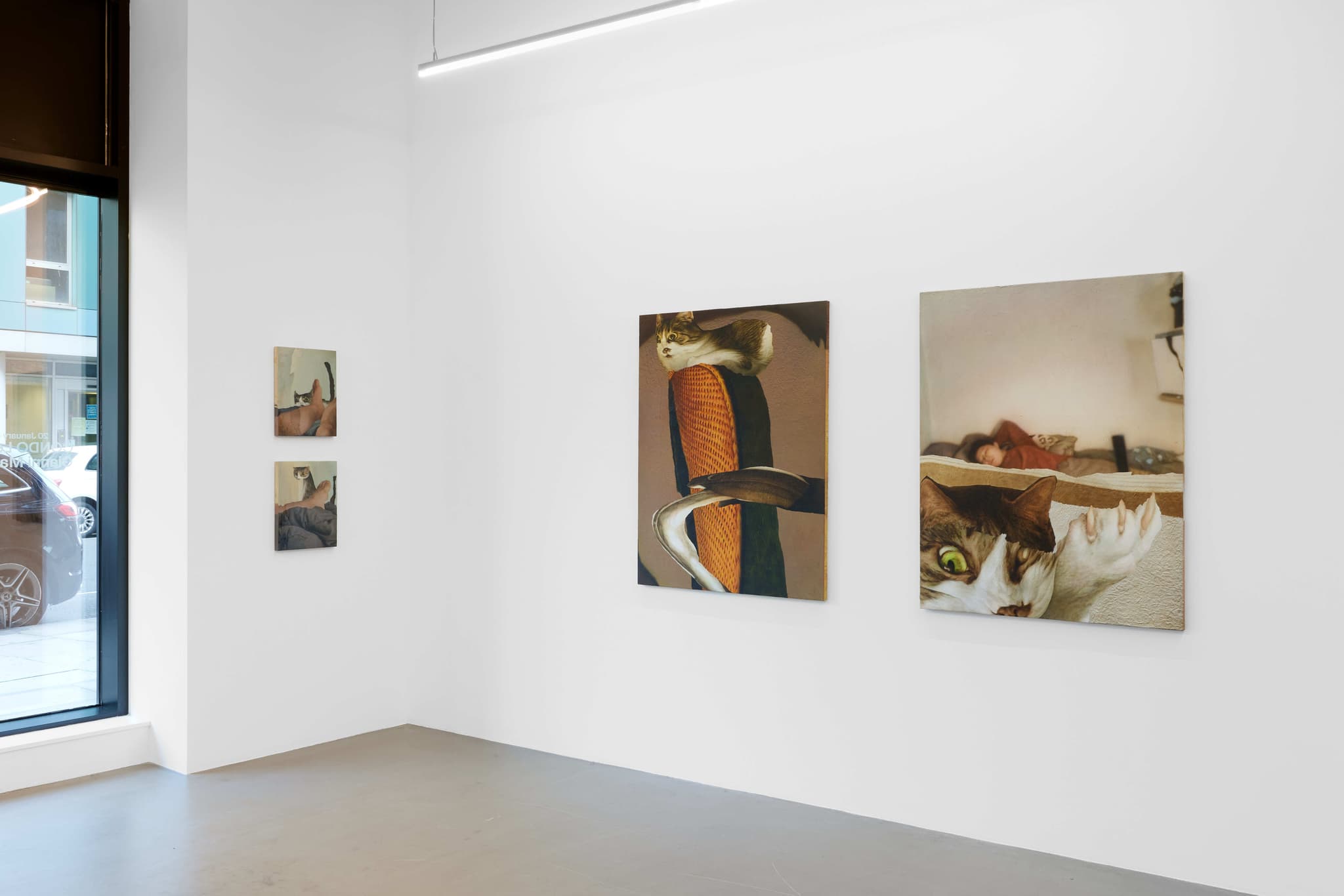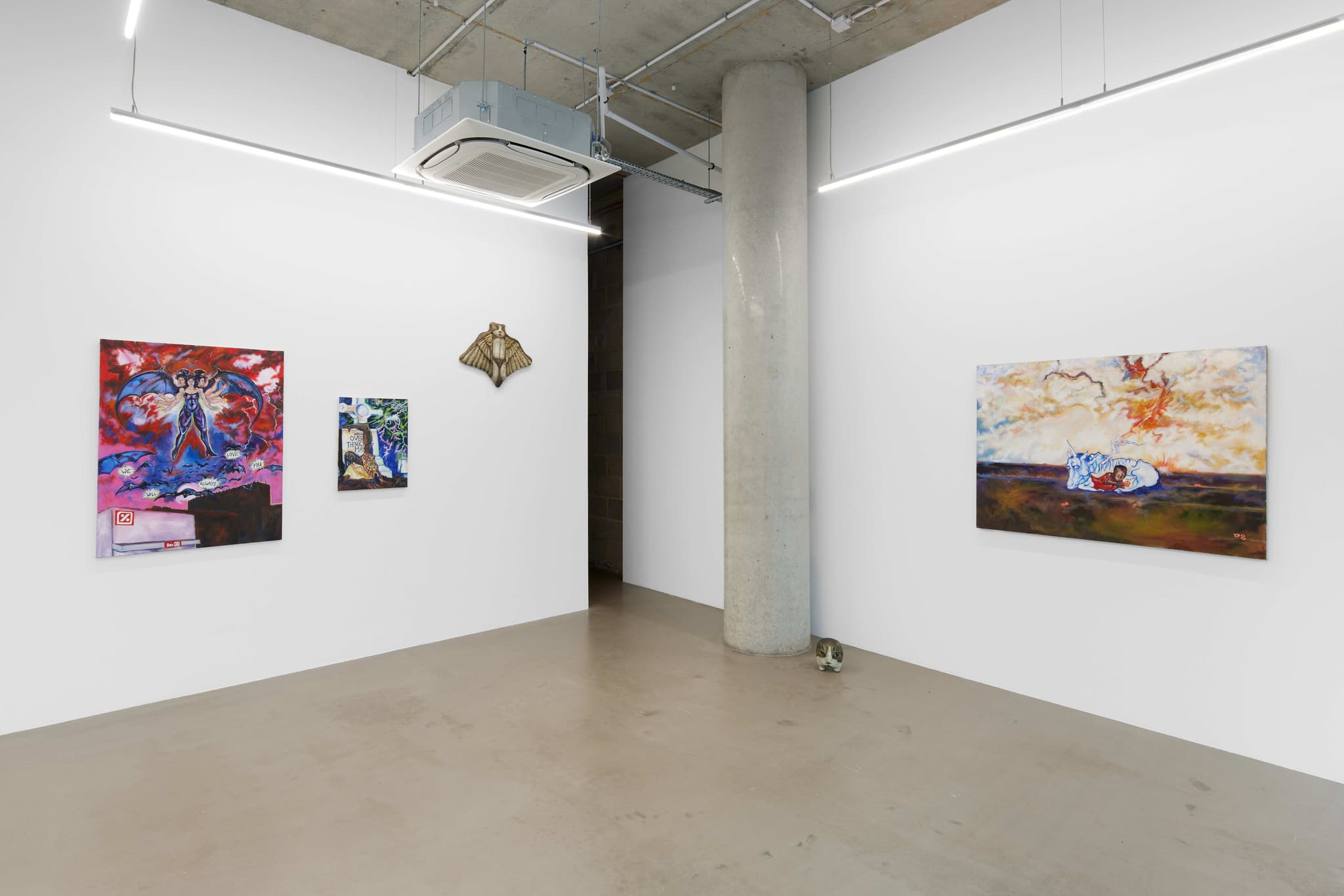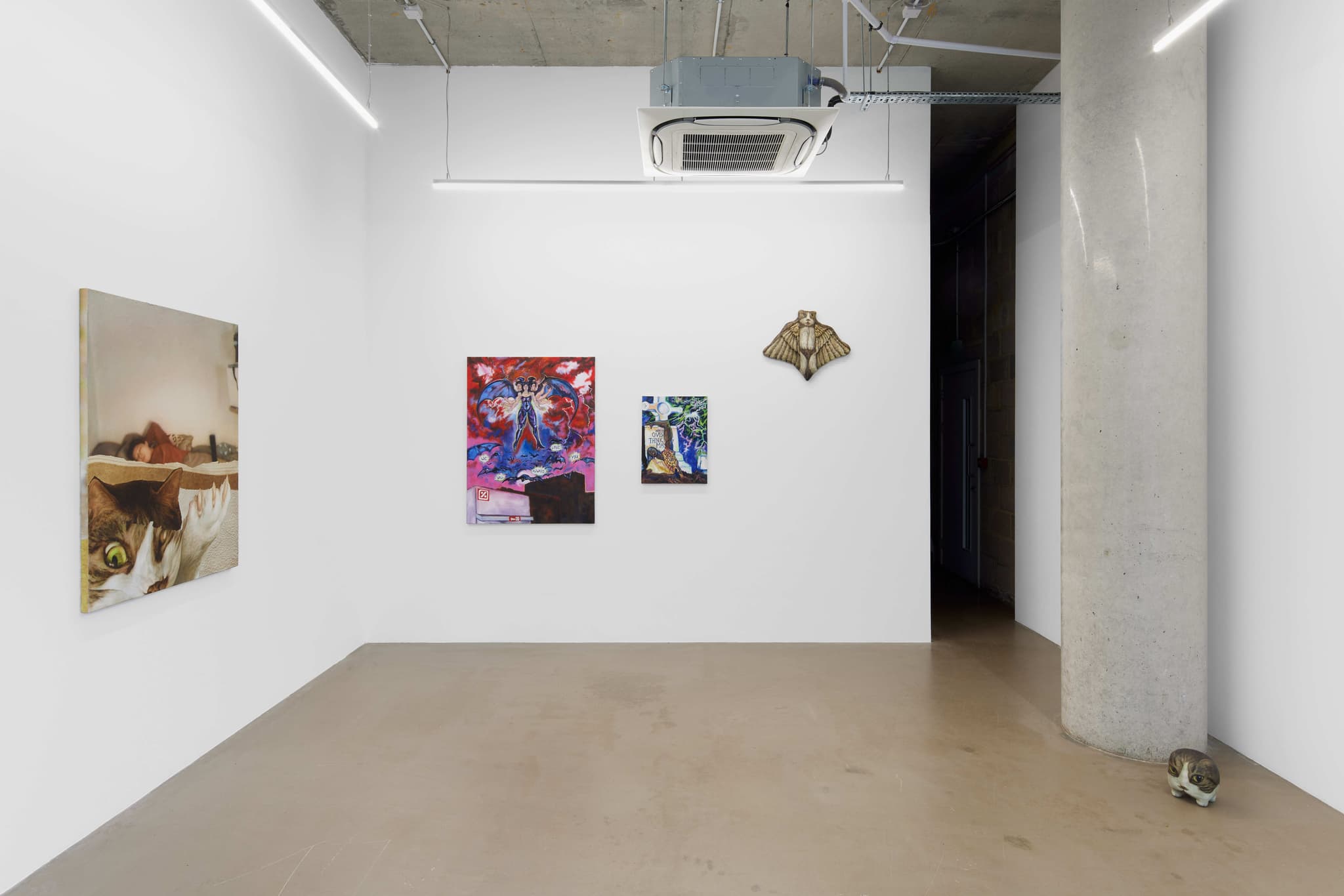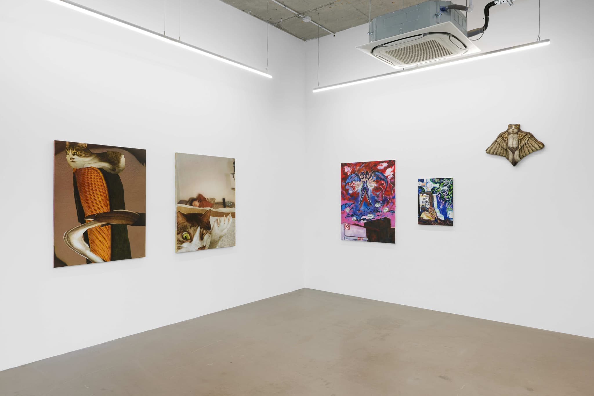 The central thesis of Heroes lies in the appropriation of digital imagery by both artists. Ahn’s meticulous contortions of his pet cat, Hiro, evoke the surrealist tradition through the contemporary lens and Sikely’s characters, while devoid of capes, subtly allude to superhero archetypes. In both instances the digital manipulation or translation becomes a form of revelation, bringing to the surface the hidden potential within the digital image. Ahn’s feline muse, Hiro, now adorned with wings, provides a bridge to Sikely’s domain of characters, gesturing towards the symbiosis of realism and fantasy. In both practices, vulnerability becomes a unifying force, blurring the lines between the abject and the empathetic.
