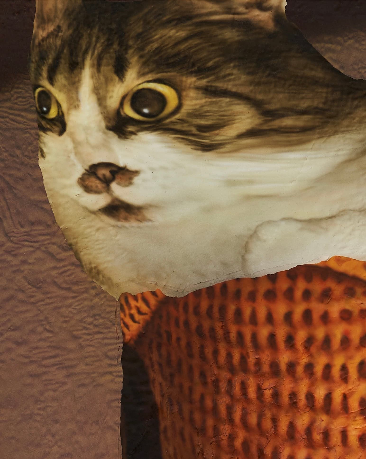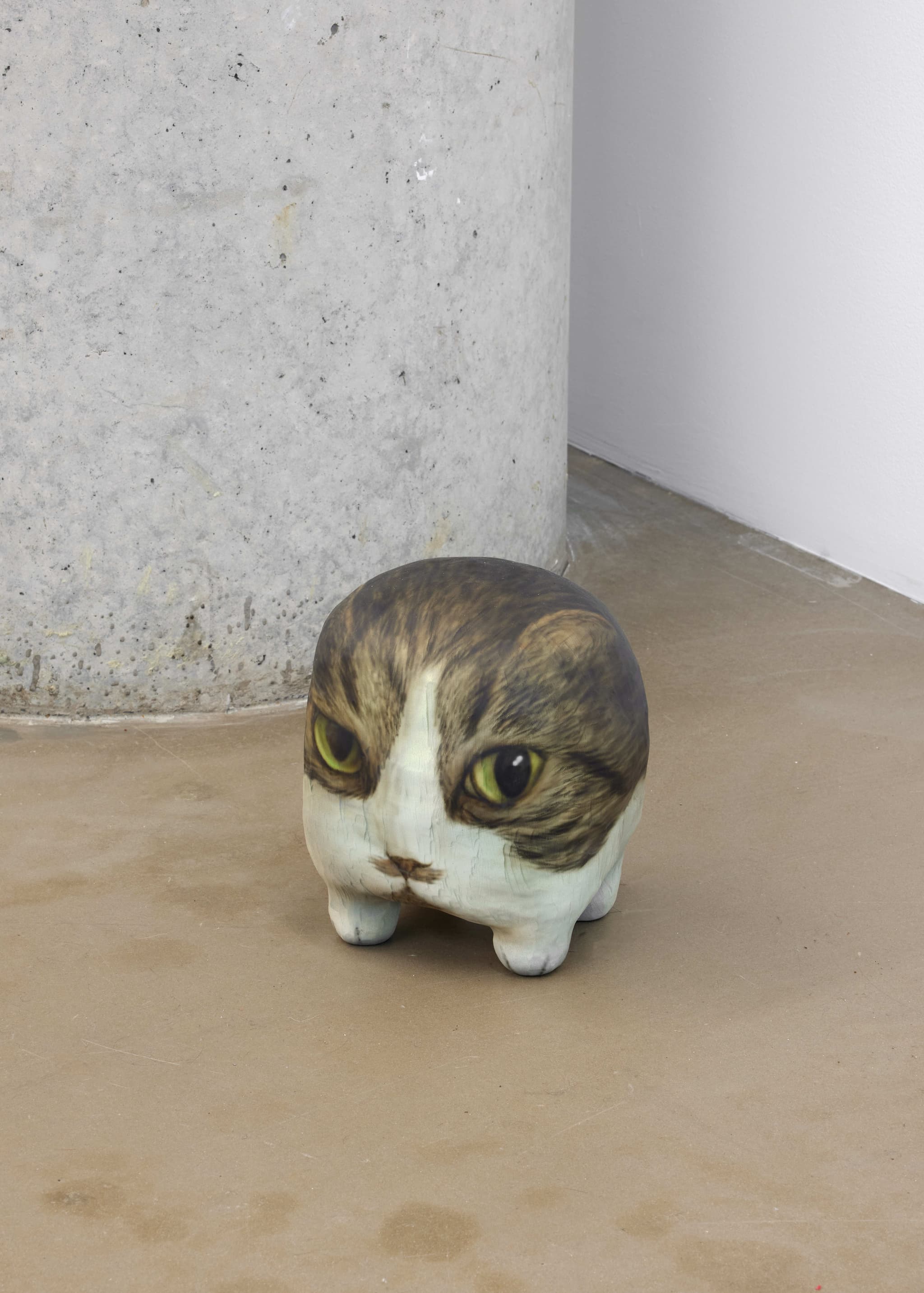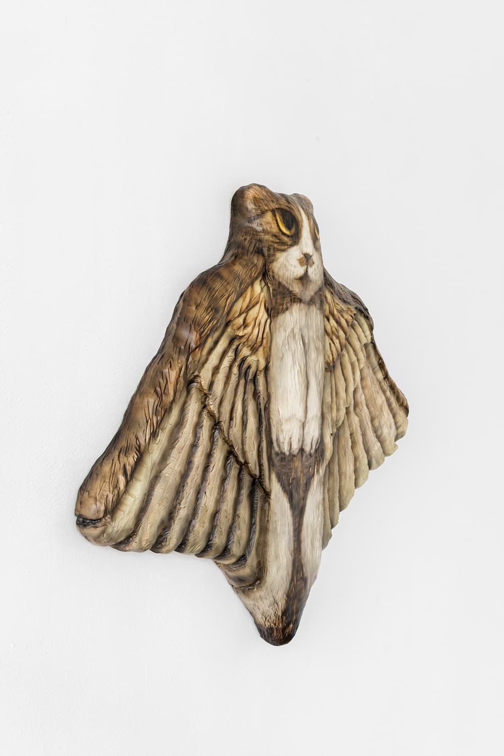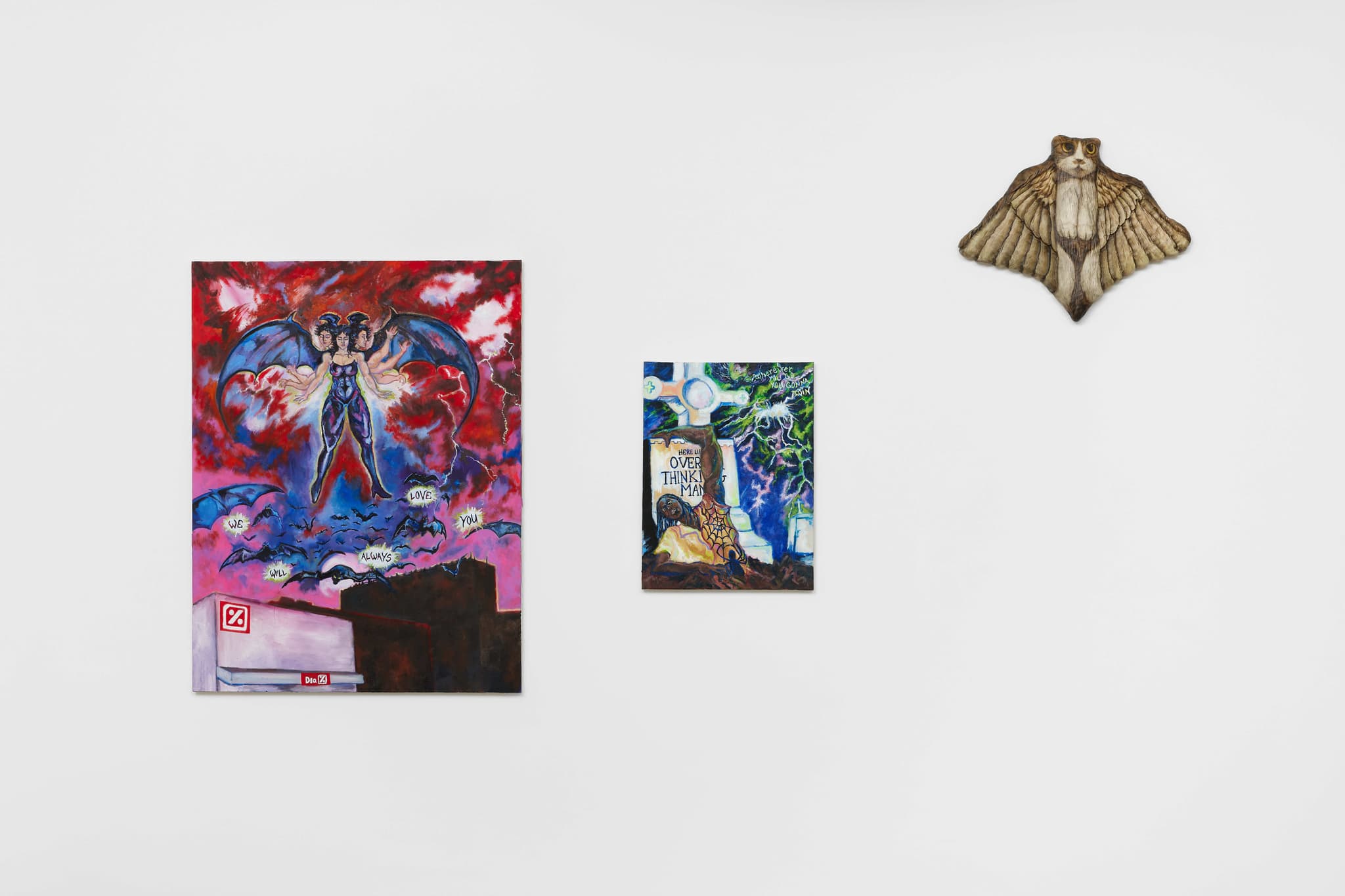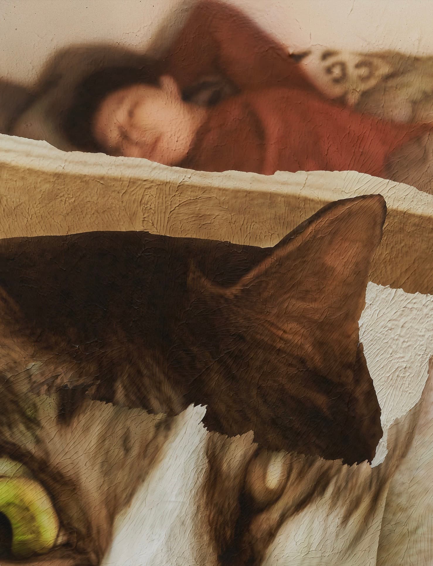 The central thesis of Heroes lies in the appropriation of digital imagery by both artists. Ahn’s meticulous contortions of his pet cat, Hiro, evoke the surrealist tradition through the contemporary lens and Sikely’s characters, while devoid of capes, subtly allude to superhero archetypes. In both instances the digital manipulation or translation becomes a form of revelation, bringing to the surface the hidden potential within the digital image. Ahn’s feline muse, Hiro, now adorned with wings, provides a bridge to Sikely’s domain of characters, gesturing towards the symbiosis of realism and fantasy. In both practices, vulnerability becomes a unifying force, blurring the lines between the abject and the empathetic.