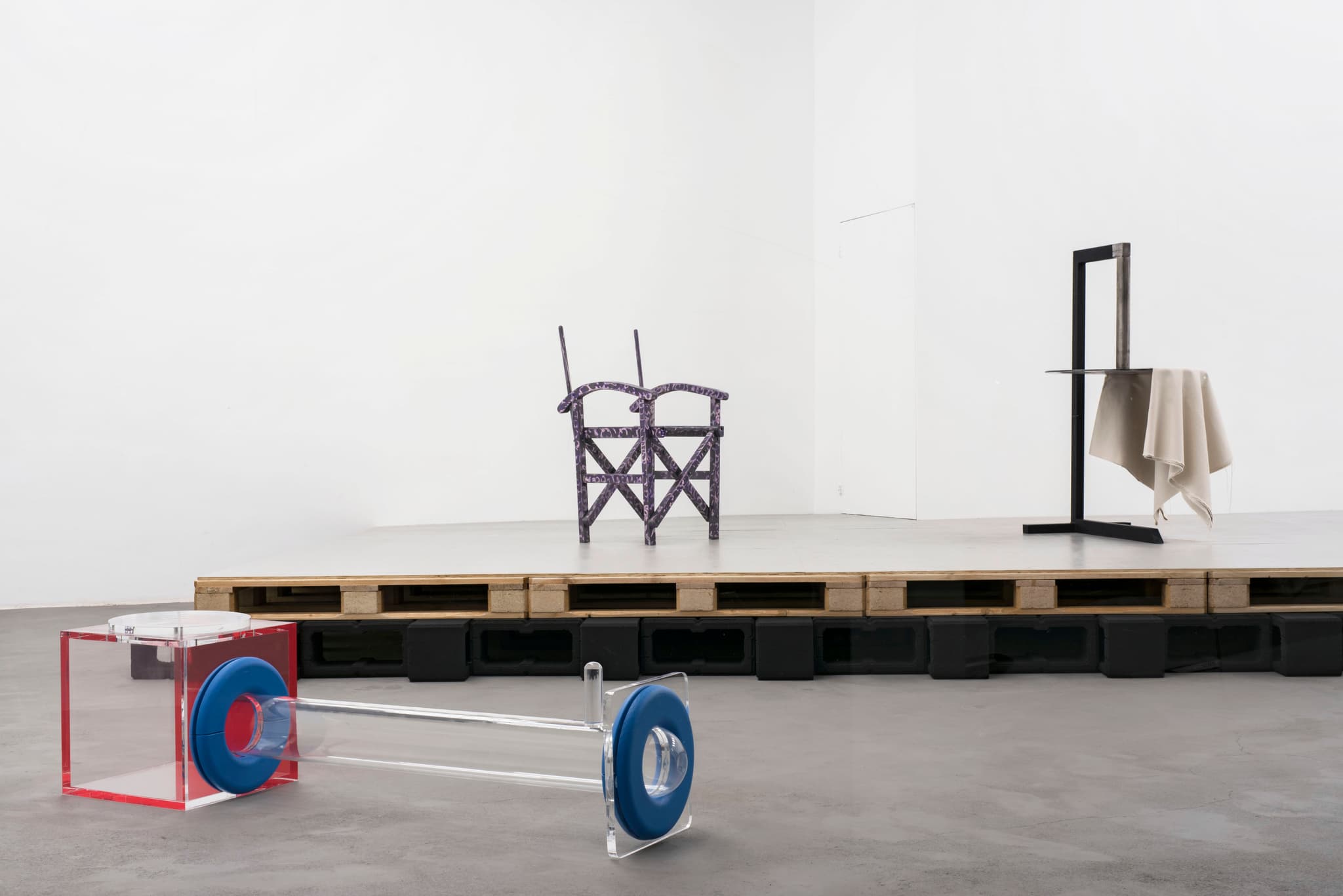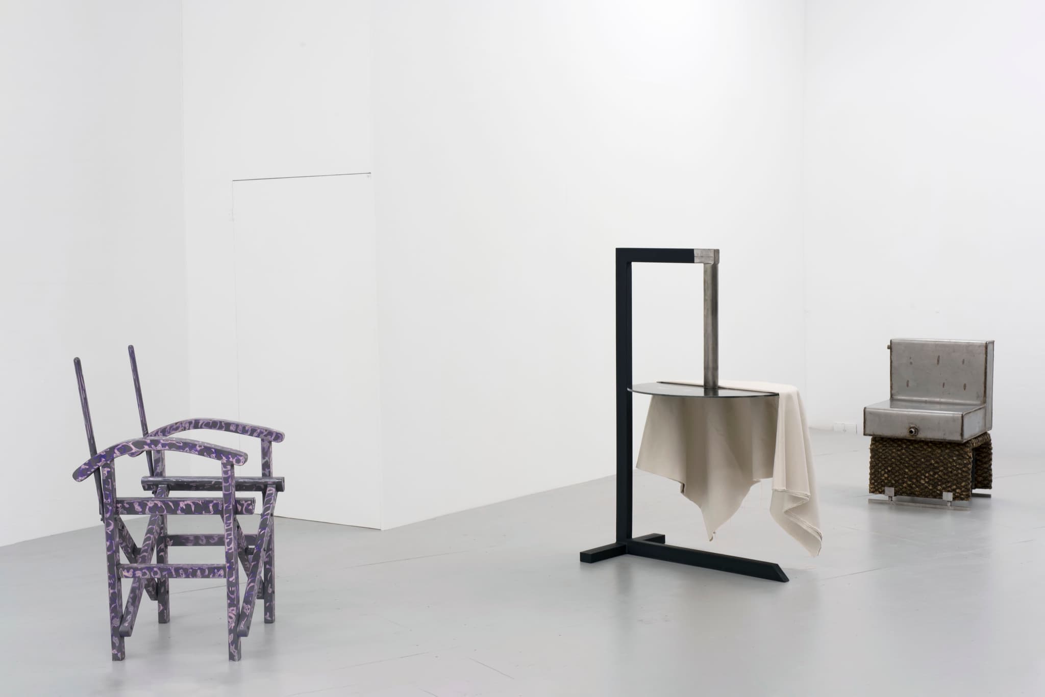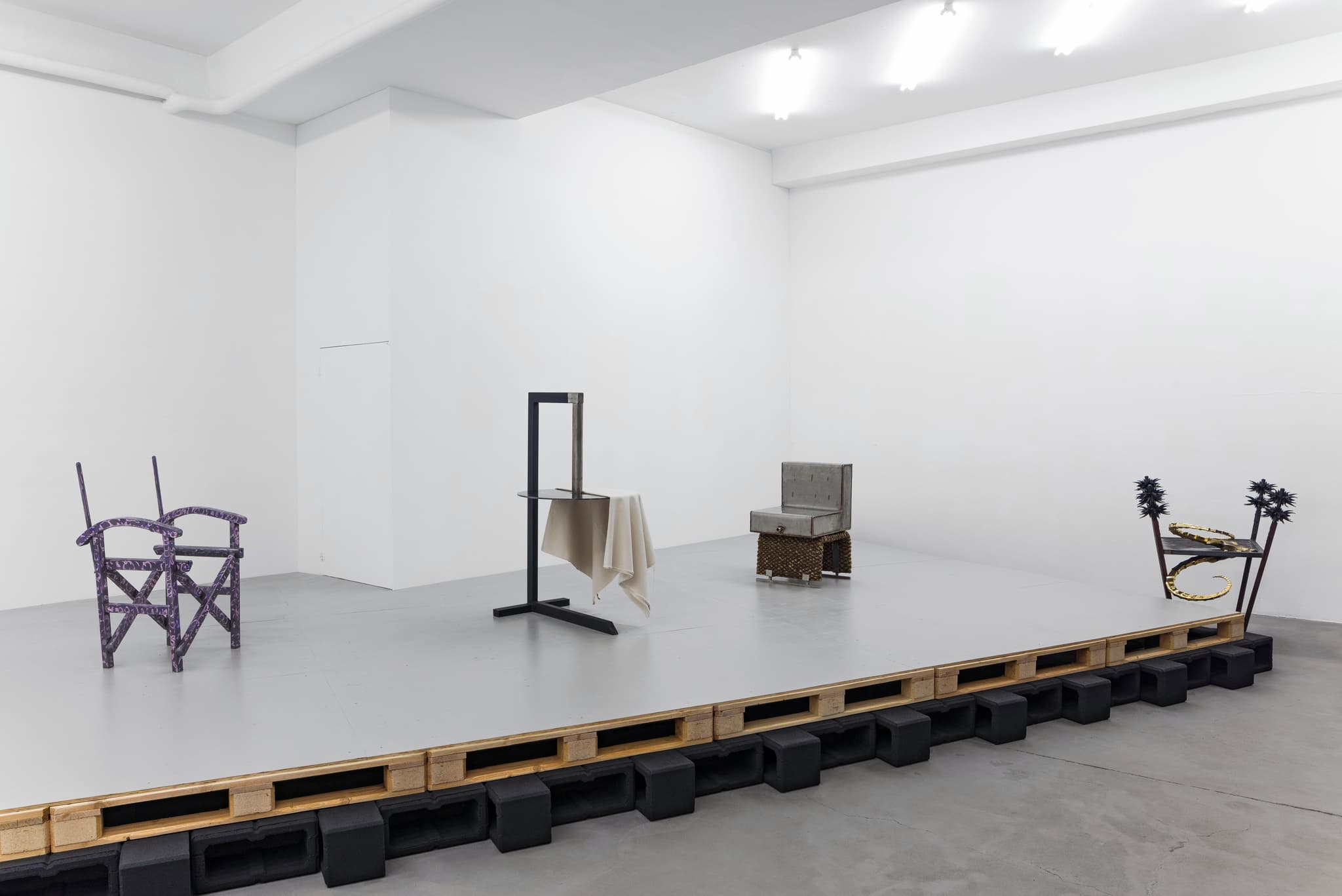 The exhibition "Cordyceps Gaud Adversary" places a strong focus on Kanu's efforts to undo the immobilization associated with art objects. Through a stage display, all of his sculptures are involved in a scene whose plot is left undefined. The objects' slippery status, somewhere between prop and actor, jolts the works from their dormant, accumulative order. Kanu further reinforces this tendency via the processing of discarded materials and functional values, each of which provides the objects with possible historical reference points while massively enriching their symbolic and fictional potential. More generally, Kanu intends an allusion to possible use values or the support of certain functions of objects, without excluding other possible oscillating forms of the objects. Underpinning this singular sculptural practice is the latently aggressive tension between the interrelated topoi of 'labor' and 'property' that is articulated in each of Dozie Kanu's works.
