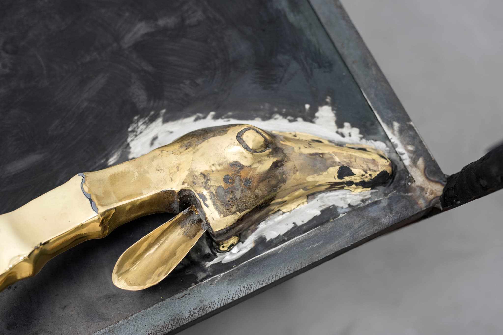 Found brass casted rams head, acrylic polyurethane enamel paint, steel, anti-climb raptor spikes, epoxy sculpting clay