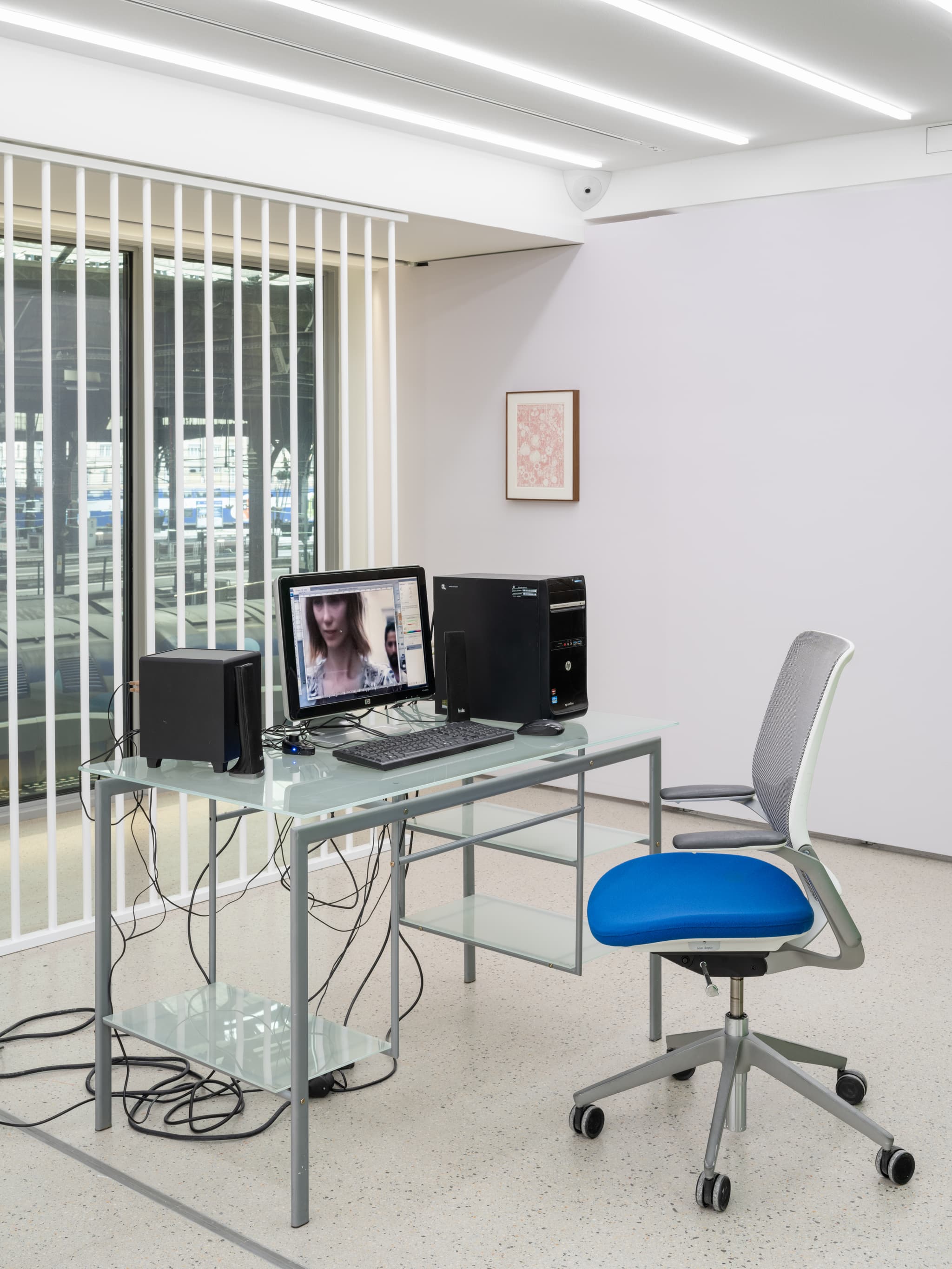 Website with video, computer desk, chair, computer, screen, speakers and business cards