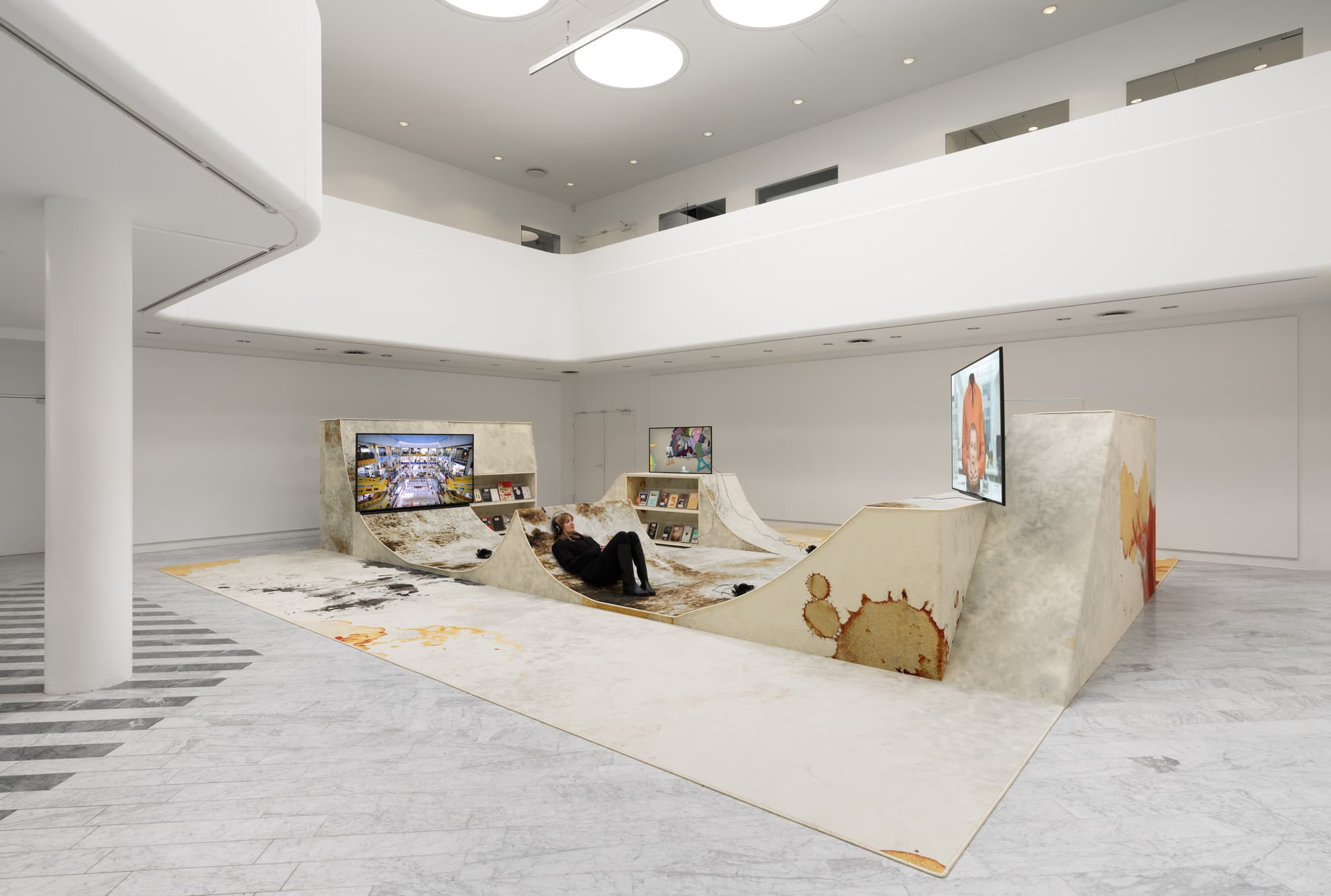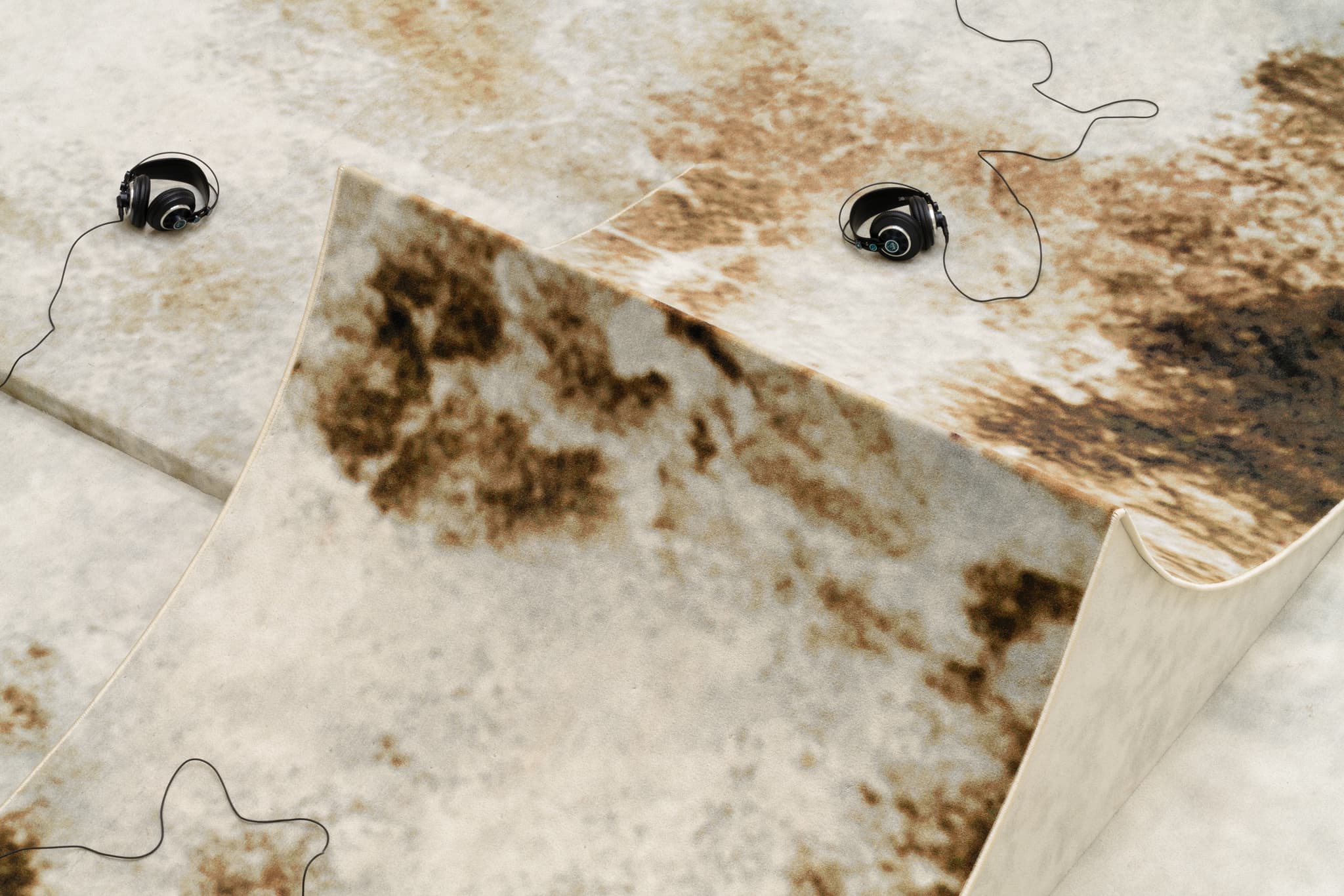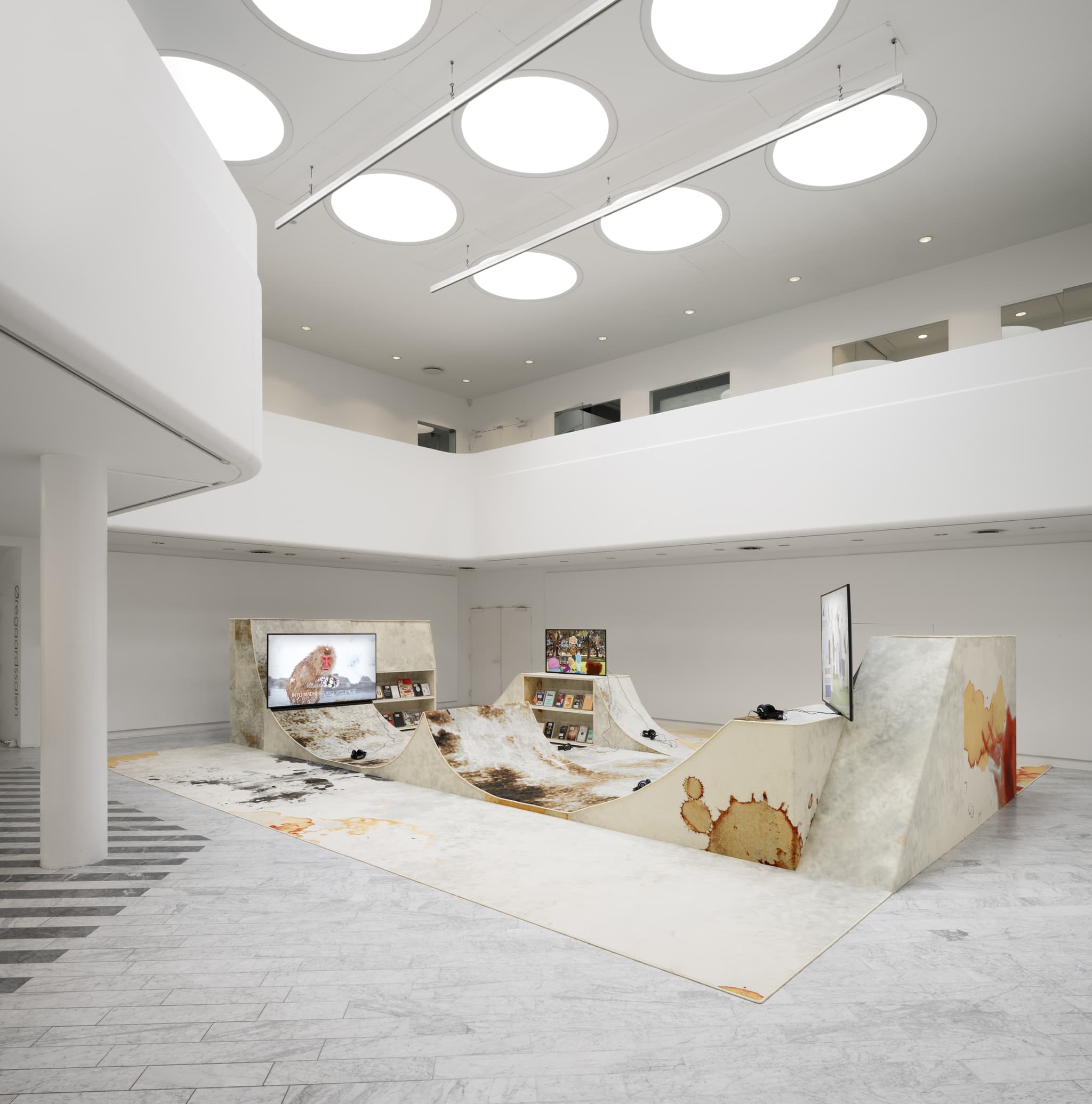 For the exhibition, DIS has designed an interior for Tranen’s space somewhere between a reading hall, half-pipe, and interactive classroom. Carpet and flat screens create a domestic and informal setting. The carpet is imprinted with traces of life — a canvas of accidents; the coffee stain, the wine stain, the pee stains, the dirty footprint but also of machines: the drips of oil, the skidmarks from tires. DIS does not simply want their content to be presented in cinemas and darkened gallery spaces but also on phones, computers and other devices of everyday life. At Tranen, the films are presented as a stream of information which you can tune in and out of as you please.
