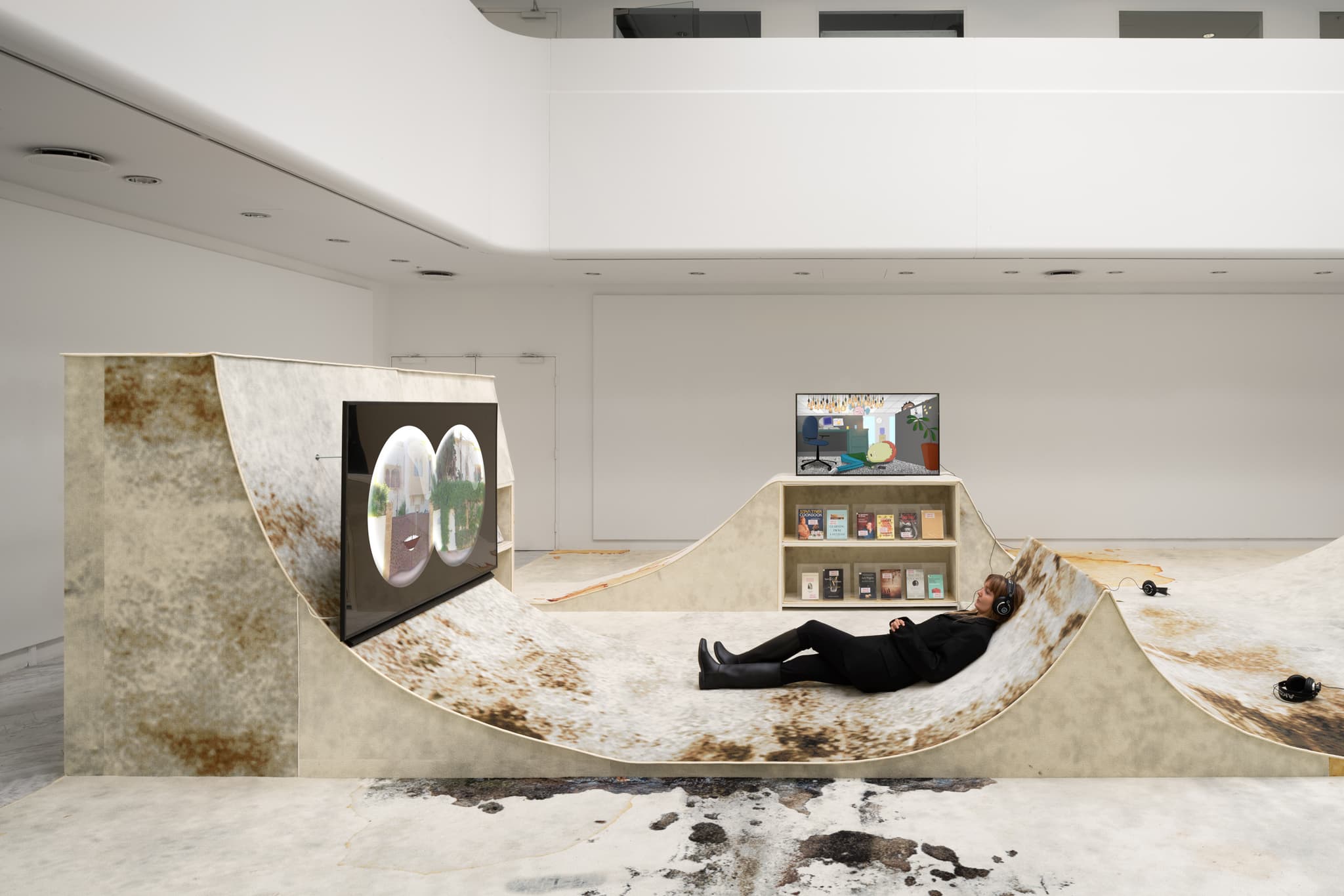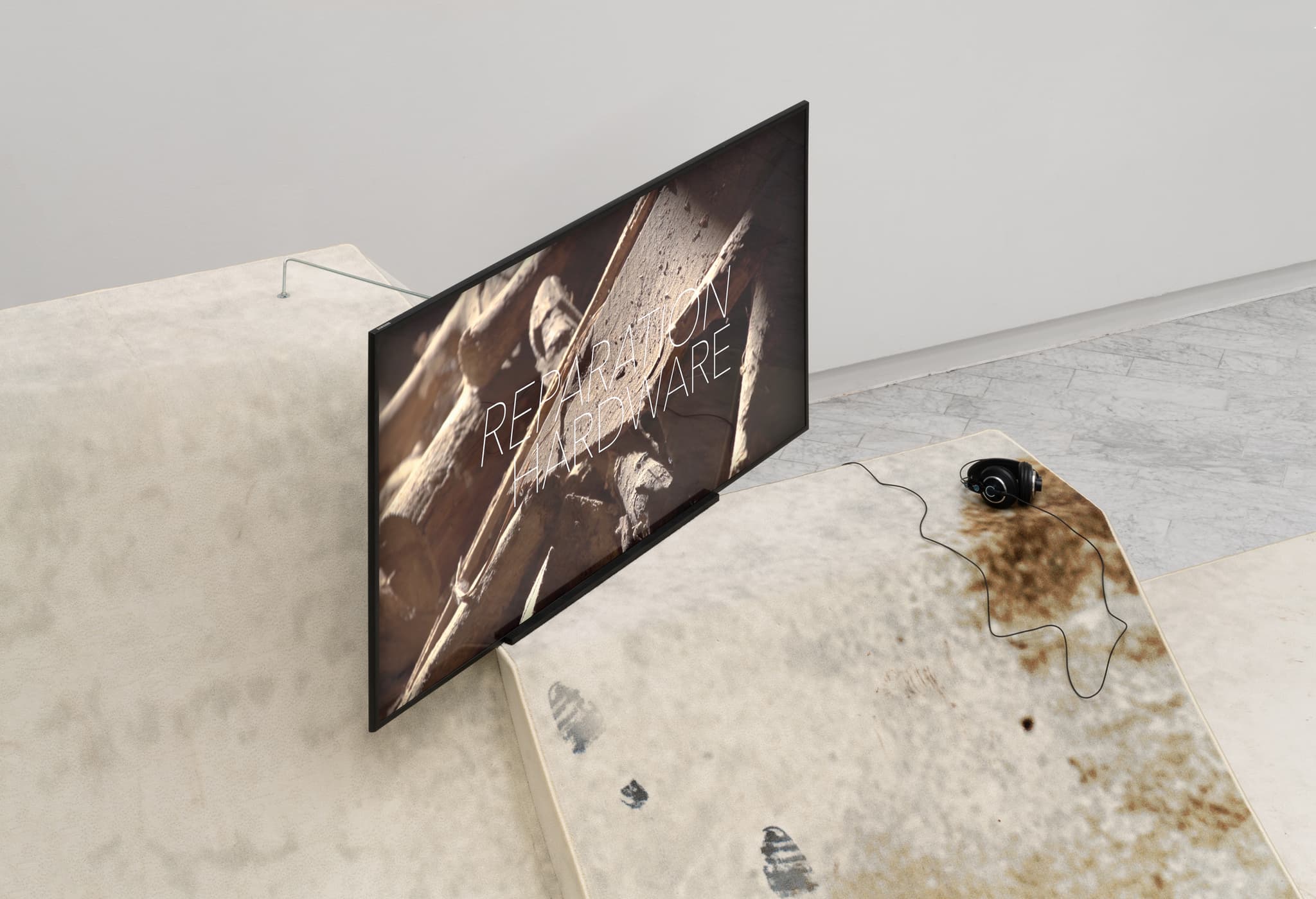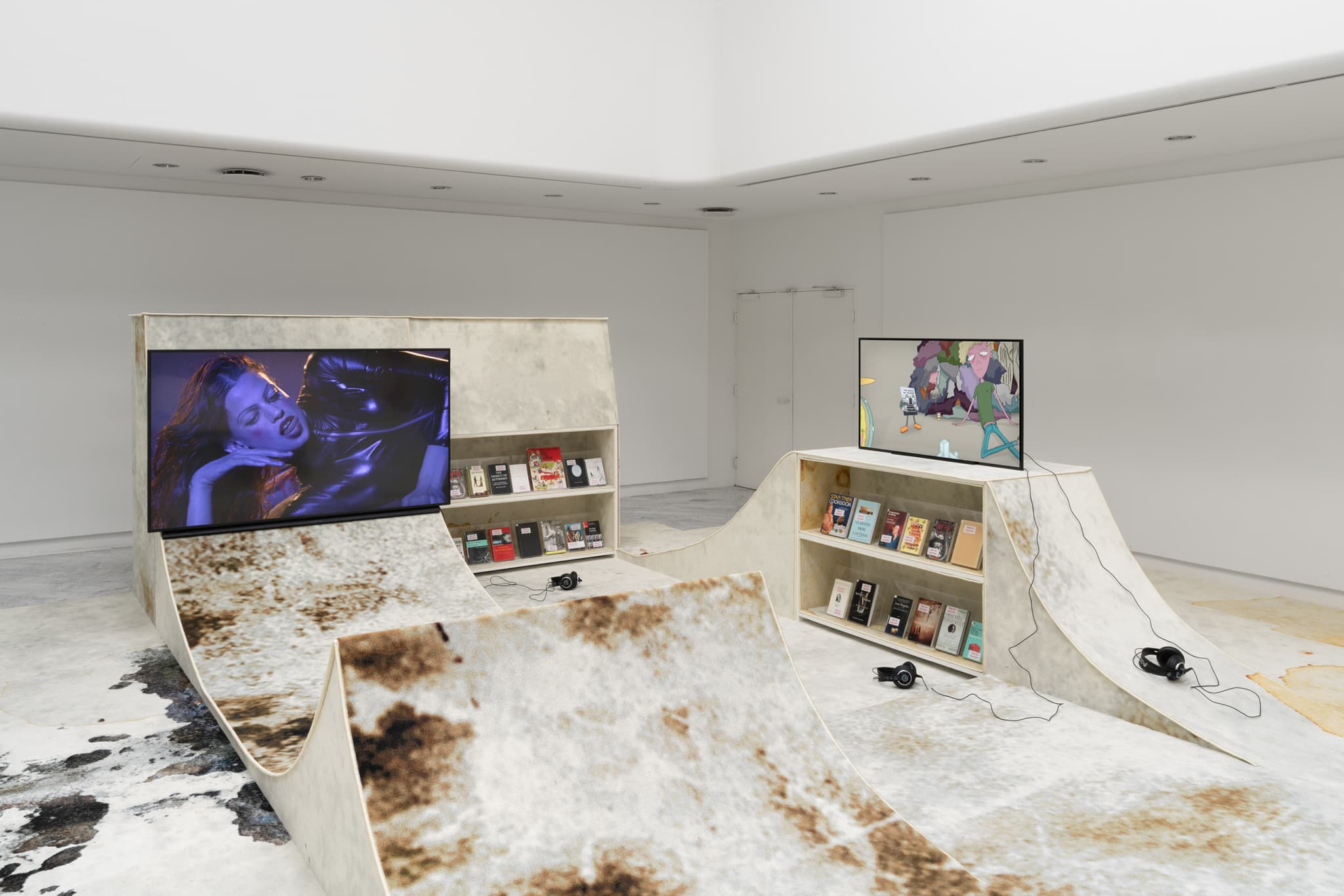 For the exhibition, DIS has designed an interior for Tranen’s space somewhere between a reading hall, half-pipe, and interactive classroom. Carpet and flat screens create a domestic and informal setting. The carpet is imprinted with traces of life — a canvas of accidents; the coffee stain, the wine stain, the pee stains, the dirty footprint but also of machines: the drips of oil, the skidmarks from tires. DIS does not simply want their content to be presented in cinemas and darkened gallery spaces but also on phones, computers and other devices of everyday life. At Tranen, the films are presented as a stream of information which you can tune in and out of as you please.