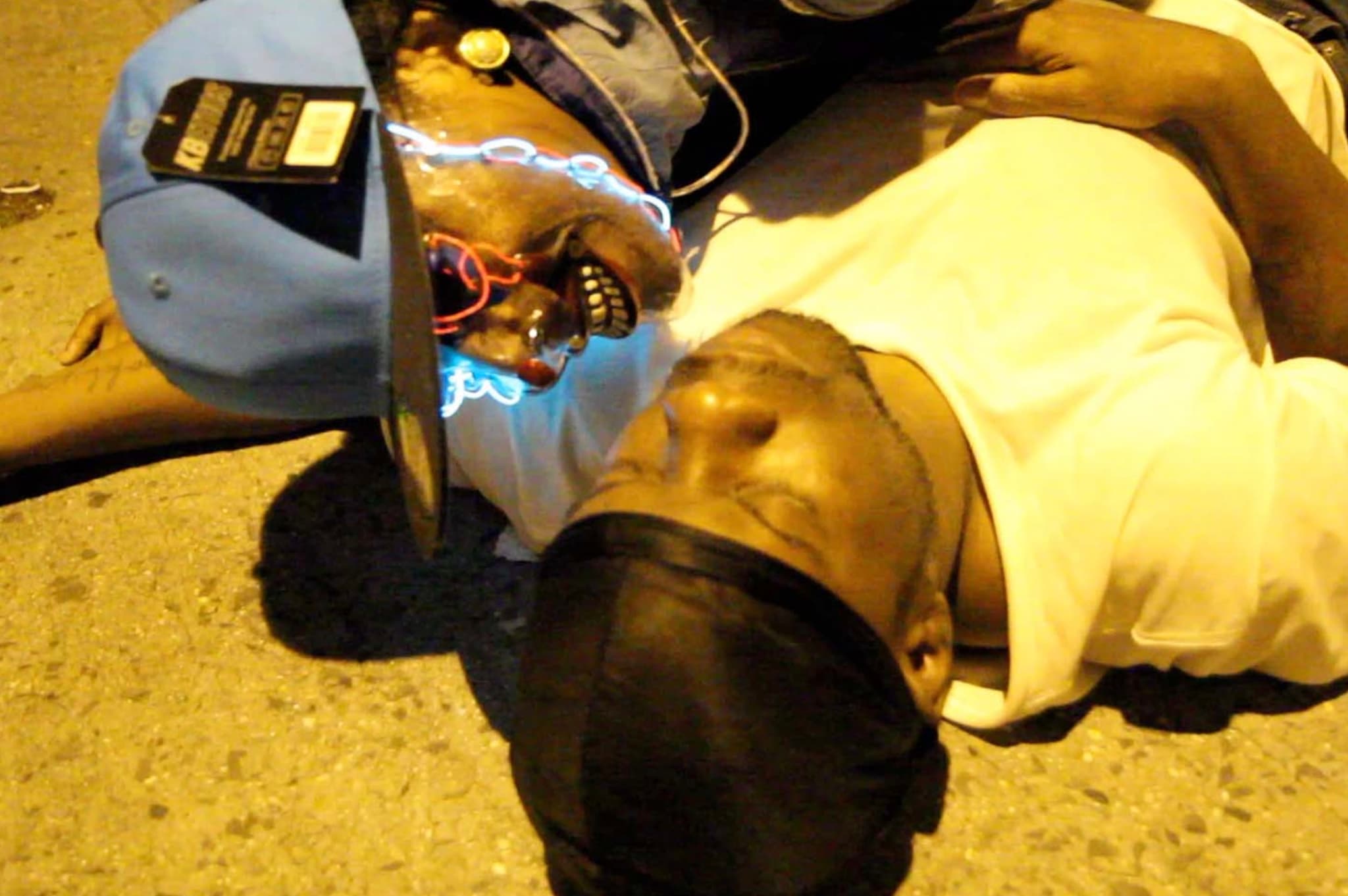Like avatars running the levels of an apocalyptic video game, Ringmasters Corey, Jay Donn and Marty McFly invoke the city and its networks as a space of terror, mutation and magic. Meanwhile, documentary shots of Far Rockaway show the city’s attempt to manage disaster in real life: police patrol the shattered flood zone as citizens line up with jerry cans. Scenes on iPhone screens play like distress signals transmitting in a blacked-out world where no survivors or friends can receive them.