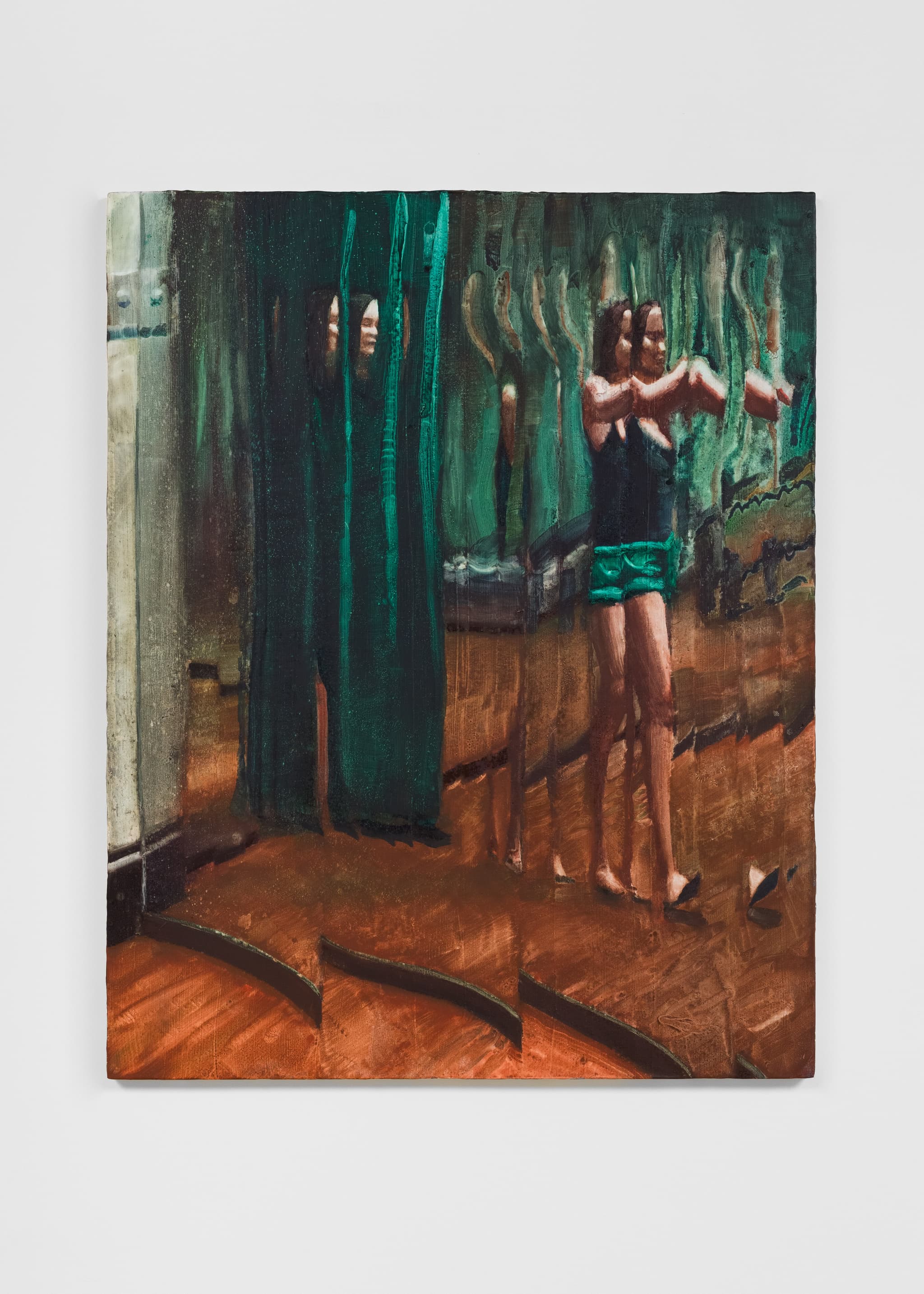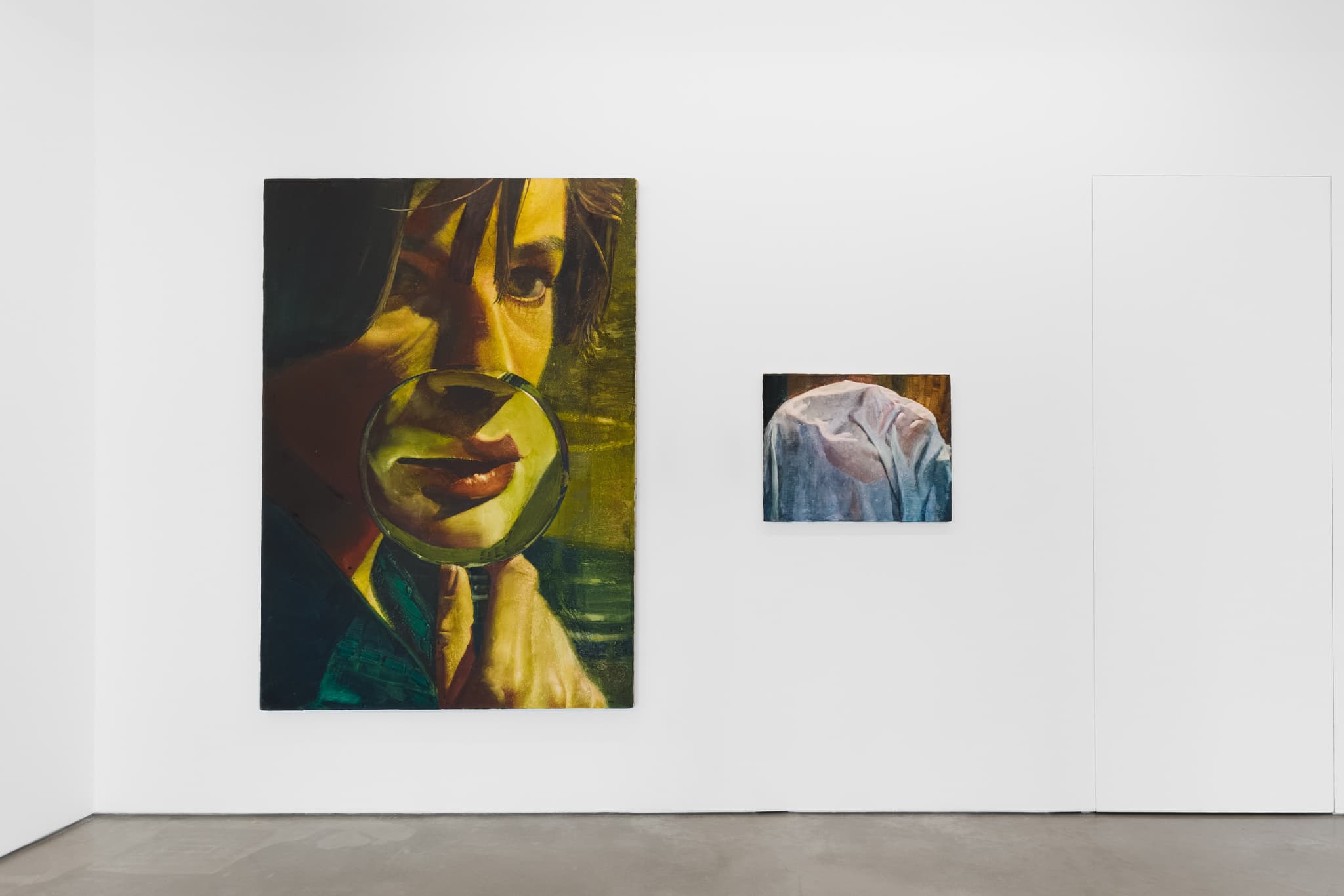 For the artist’s first solo show, Doublespeak, at Project Native Informant, he has produced a new body of paintings that all take glass as a guiding visual metaphor for the distorting qualities of language. “Like language, glass can be transparent and reflective at once, conceal while revealing, it can distort, it can mirror, and then consider what happens in one’s mind when encountering these distortions. For me this is not so unlike assigning language to an interior feeling. Language doesn’t encapsulate or really even begin to describe the goings-on within, but it does communicate.” 3 A woman gazes into a mirror, her agonised expression reflected, a figure is fractured into pieces by a hall of mirrors, a face is distorted by a magnifying glass held up towards the lips. These enigmatic paintings appear to contain obscured meanings, unrevealed to the viewer.