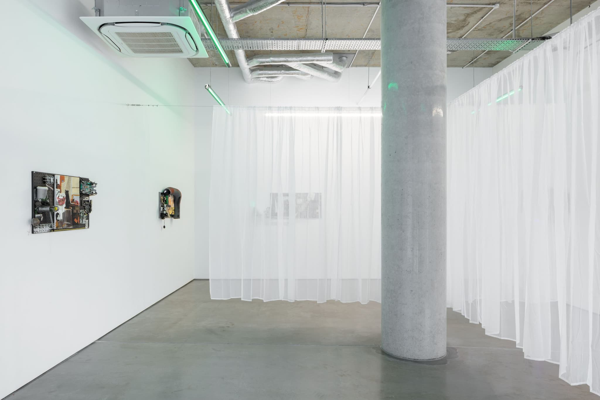 "The exhibition consists of 9 paintings, screwed onto metal pegboards that are used to host a variety of tech junk, discarded belongings and machine parts. The junk frames the paintings which, on the whole, are of domestic animals known to the artist: Casper the rabbit, Pepsi the cat, Delphine the cat and owls wearing graduation caps - a common motif where the owl represents wisdom and an eagerness to learn.