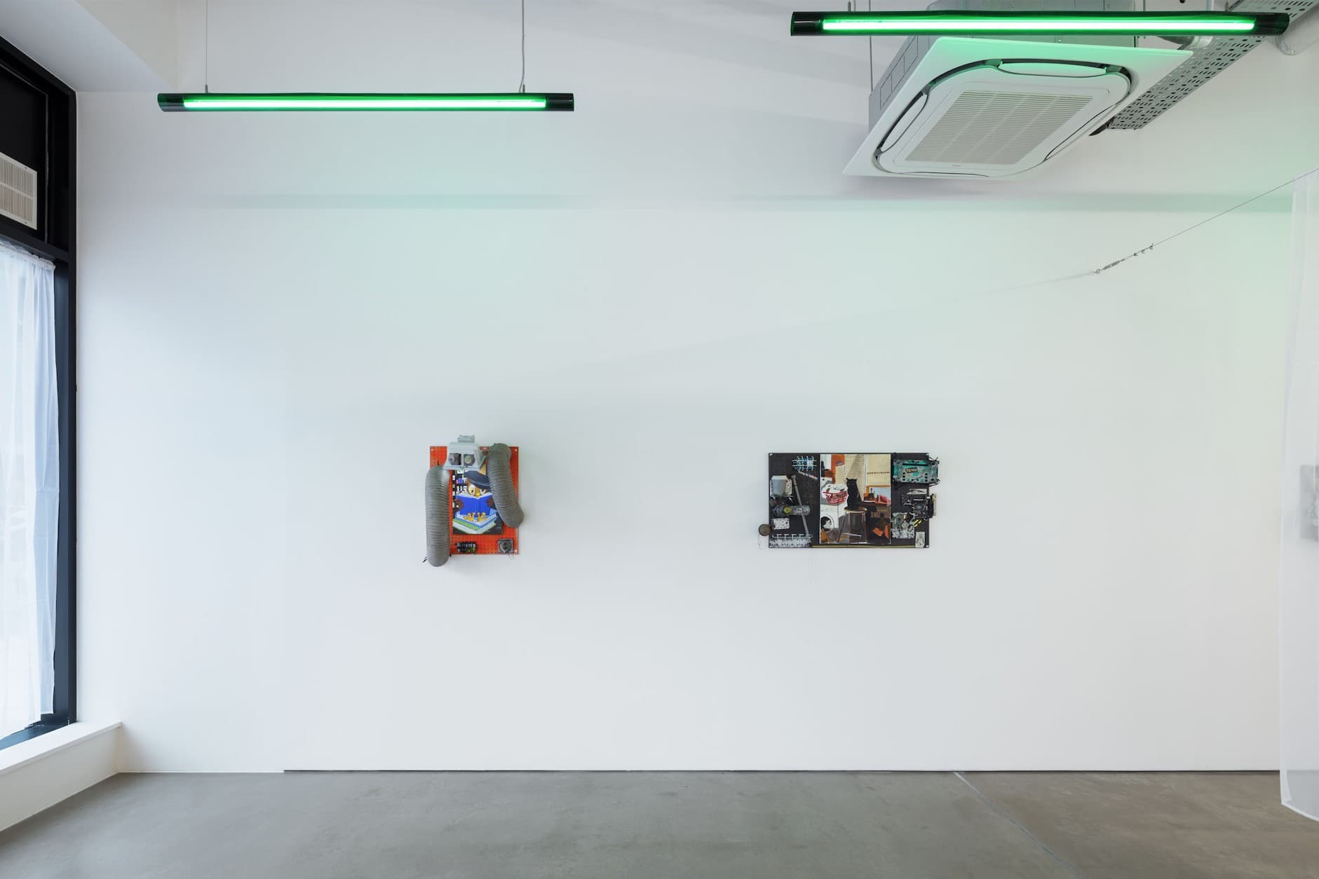Acrylic on canvas, light, artificial moss, mobile phone, ventilation pipe and plastic on steel pegboard