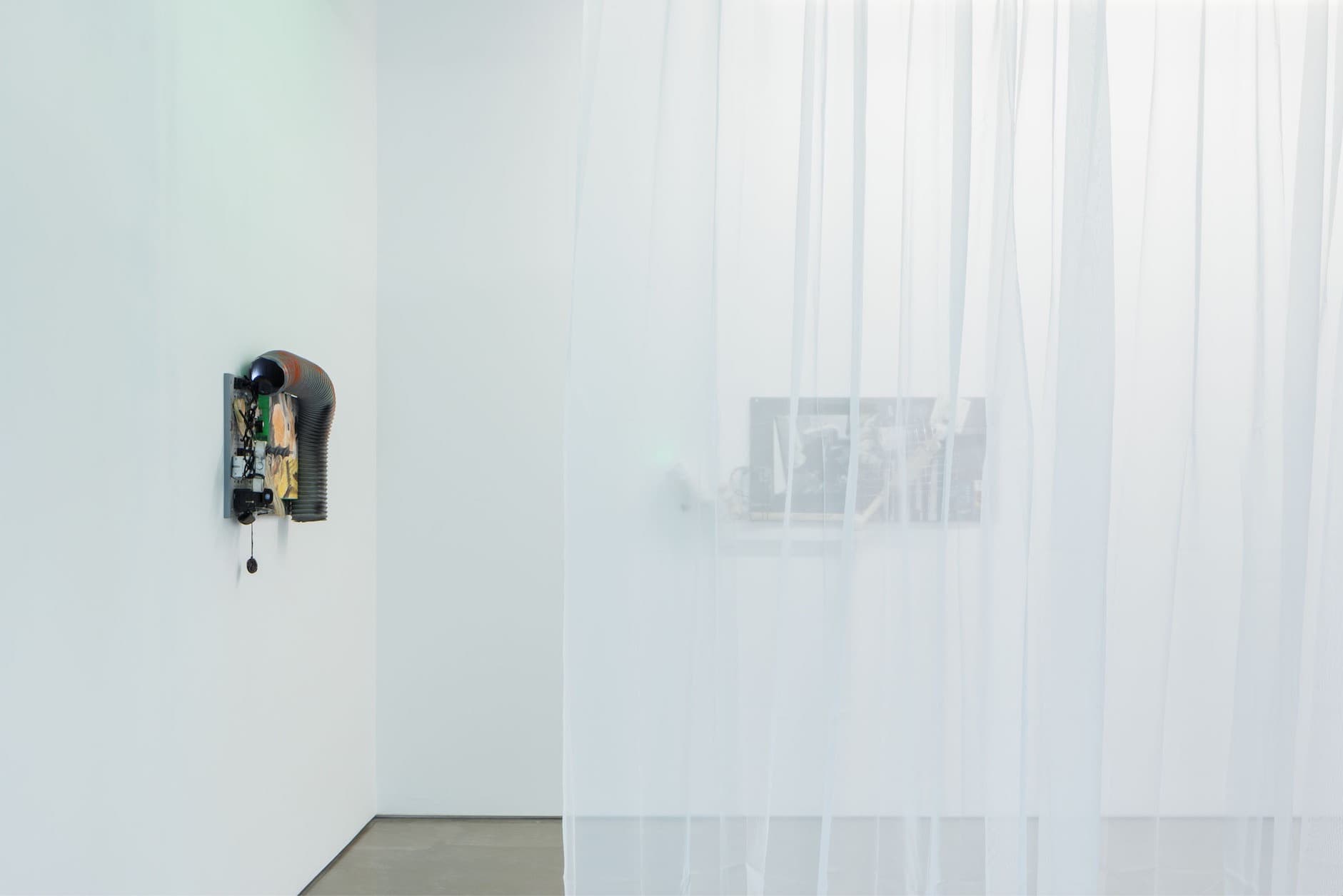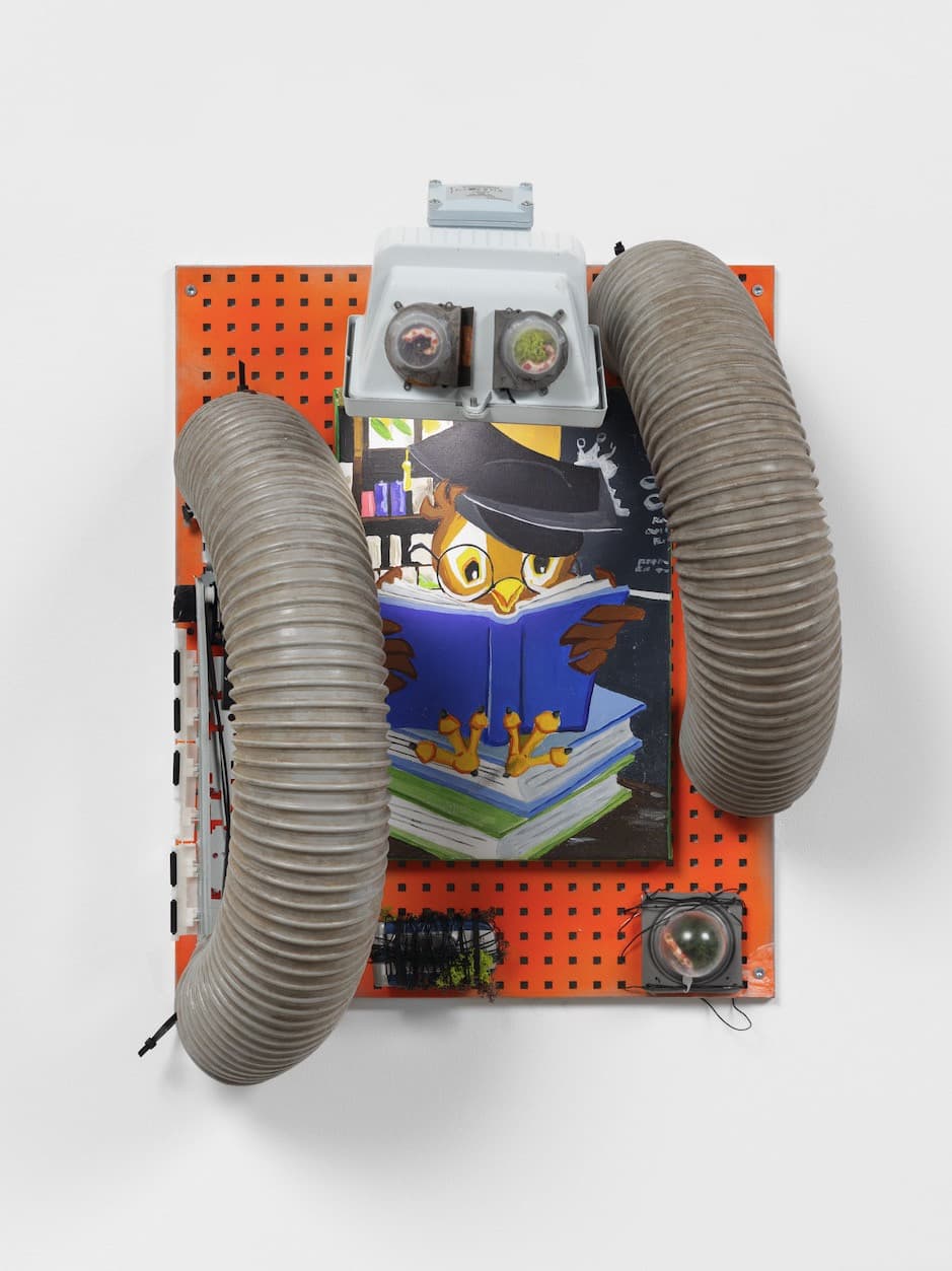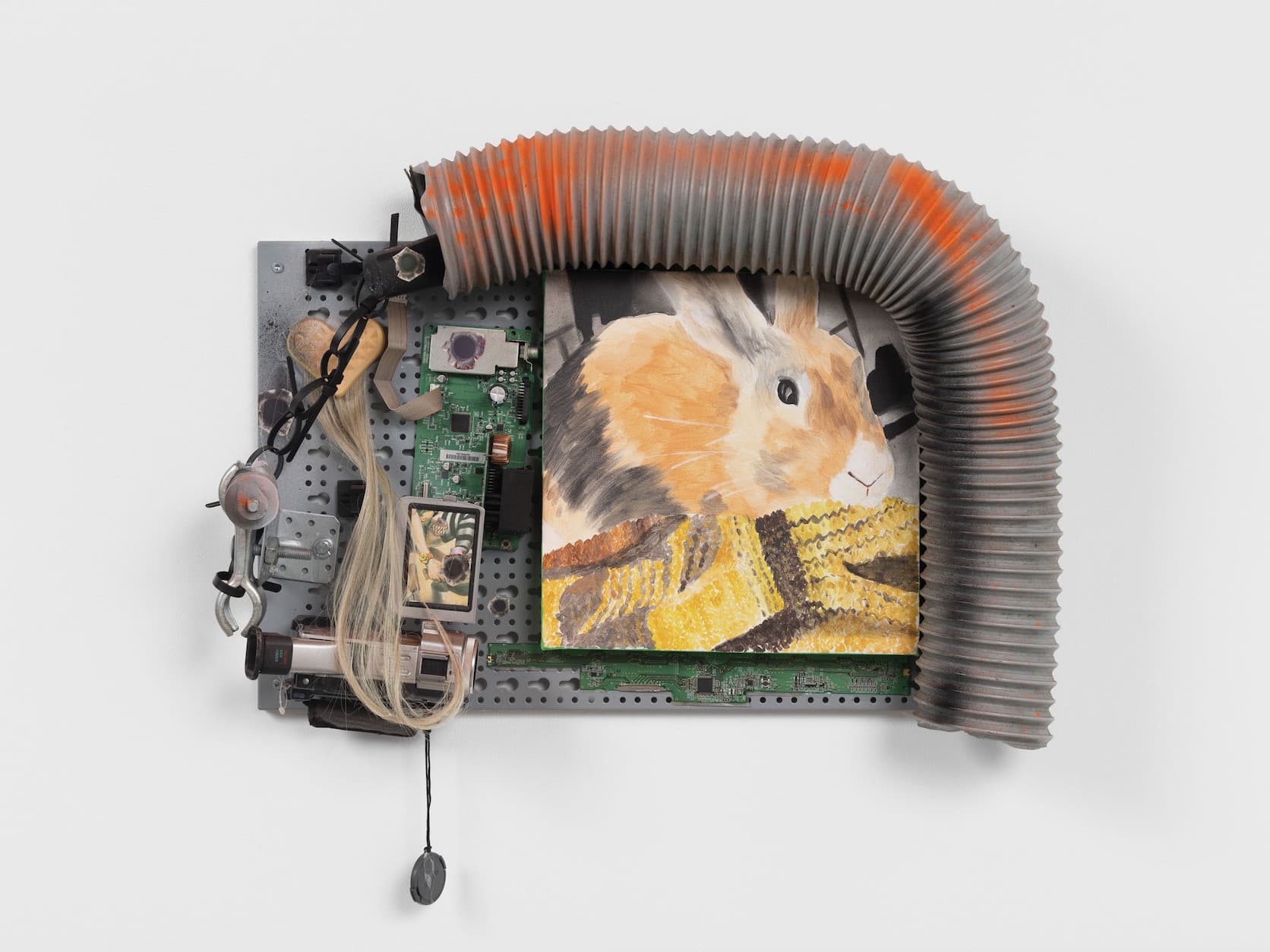 Acrylic on canvas, bike light, camcorder, circuit board, steel, hair extensions, ventilation pipe and found material on steel pegboard