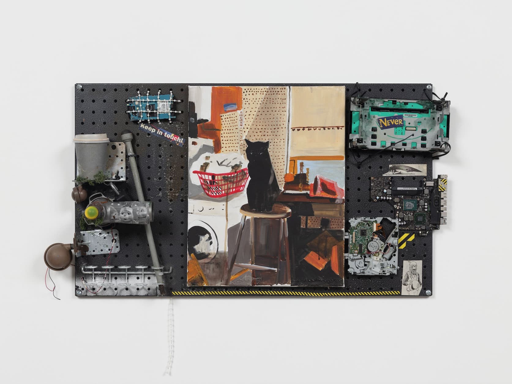 Acrylic on canvas, coffee cup, circuit boards, collage, wheels, steel, artificial moss, padlock, mobile phone and found material on steel pegboard