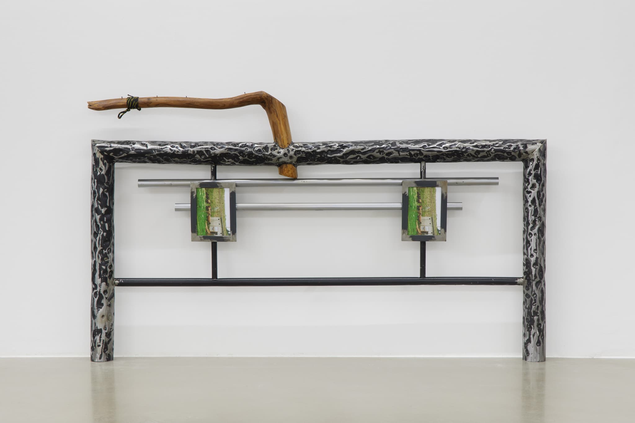 Steel, oil, c-type print, found wood, nails and shoelace