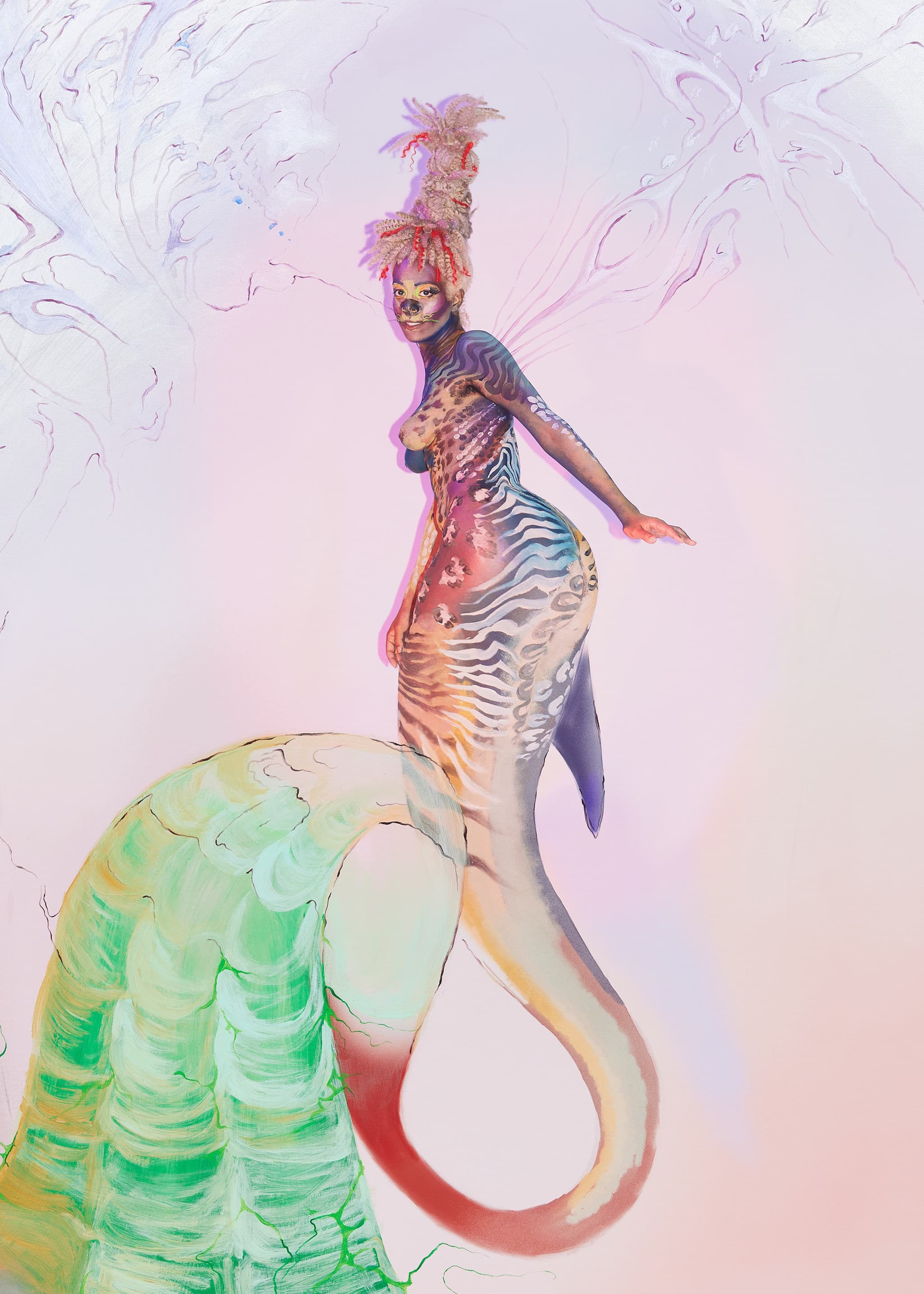 Artist, writer, musician and performer Juliana Huxtable (b. 1987) excels in probing dormant and marginalised histories, narratives and technologies to challenge discourses around contemporary perceptions of identity, futurity and politics. Through painting, photography, text and video, she has defined a singular aesthetics of language that often plays into a digital, Tumblr-ised visual identity, a kind of collaged rap and visual rapture. Huxtable’s practice offers a key critical voice on identity, as well as, specifically, her own identity as a black trans woman. Her works and performances have been presented internationally in solo and group exhibitions, including Centre d’Art Contemporain Genève, Hayward Gallery, London, Walker Art Center, Minneapolis, Brooklyn Museum, New York, Institute for Contemporary Art, Boston, MOMA PS1, New York and Whitney Museum of American Art, New York. Her work can be found in the collections of Solomon R. Guggenheim, New York and The Studio Museum in Harlem, New York and Magasin III Museum for Contemporary Art, Stockholm. In 2017, Huxtable published Mucus in My Pineal Gland, a celebrated volume of poems, performance scripts and essays. Huxtable will present her third solo exhibition at Project Native Informant to coincide with Frieze London 2024. We will be showing new paintings as well as a historical self portrait photograph.