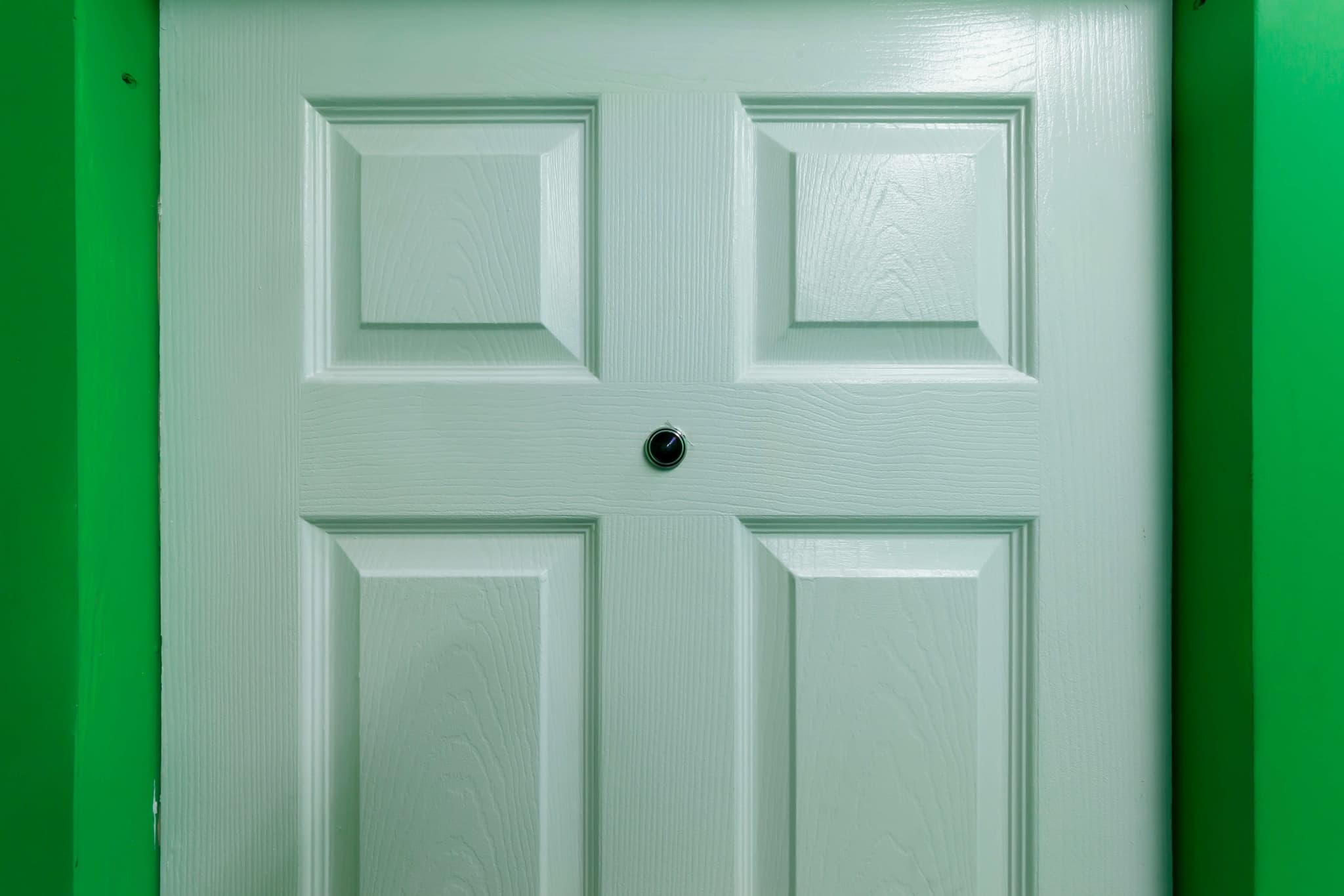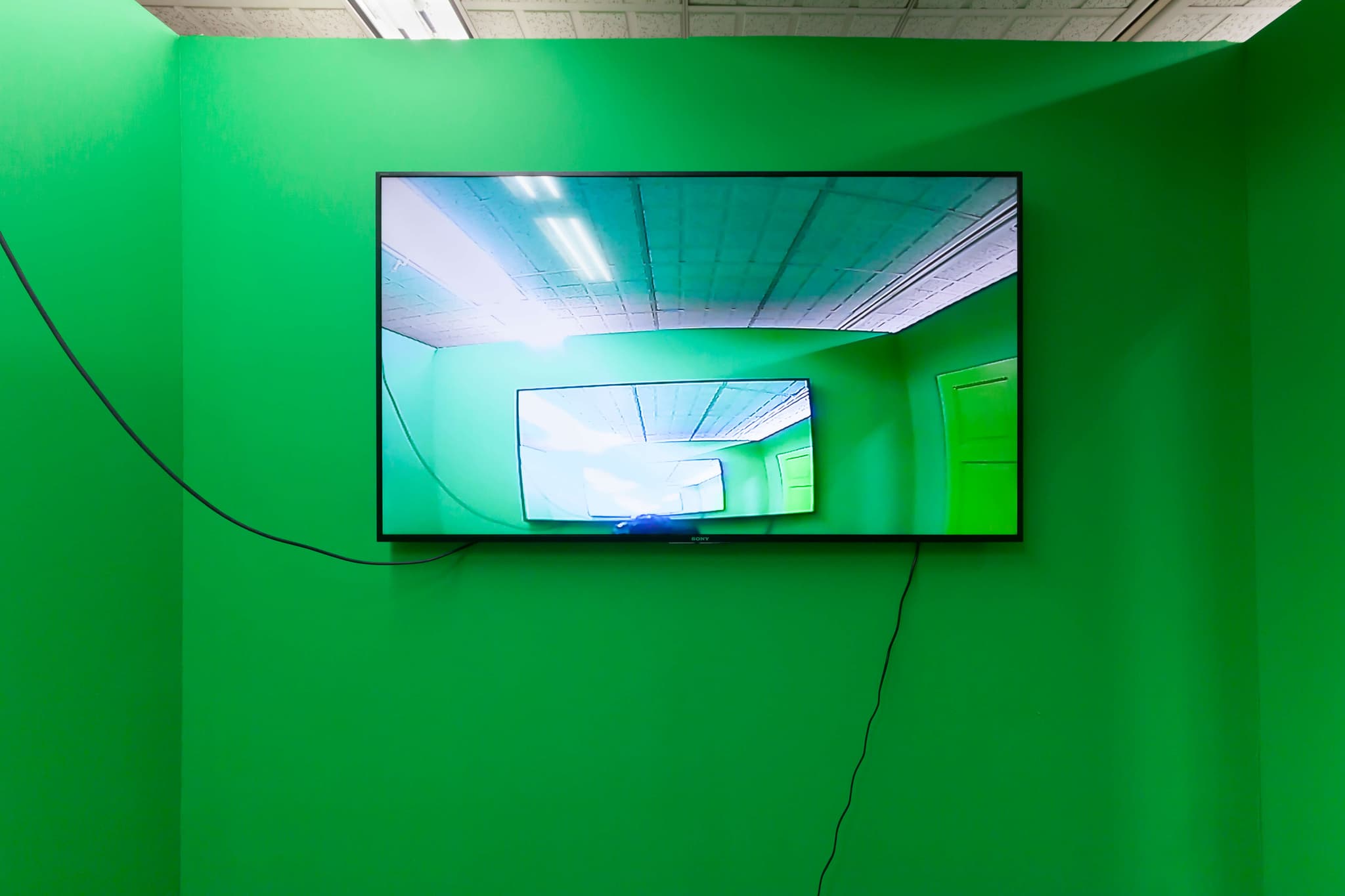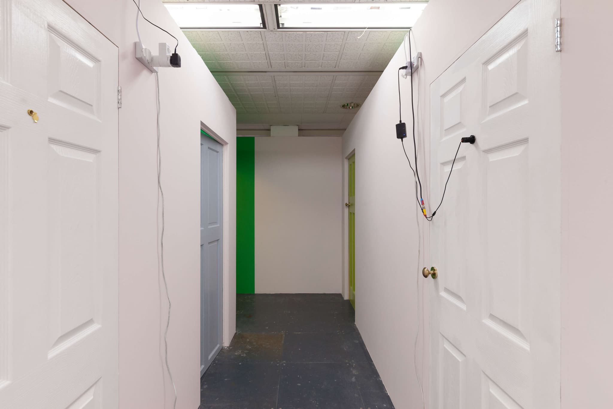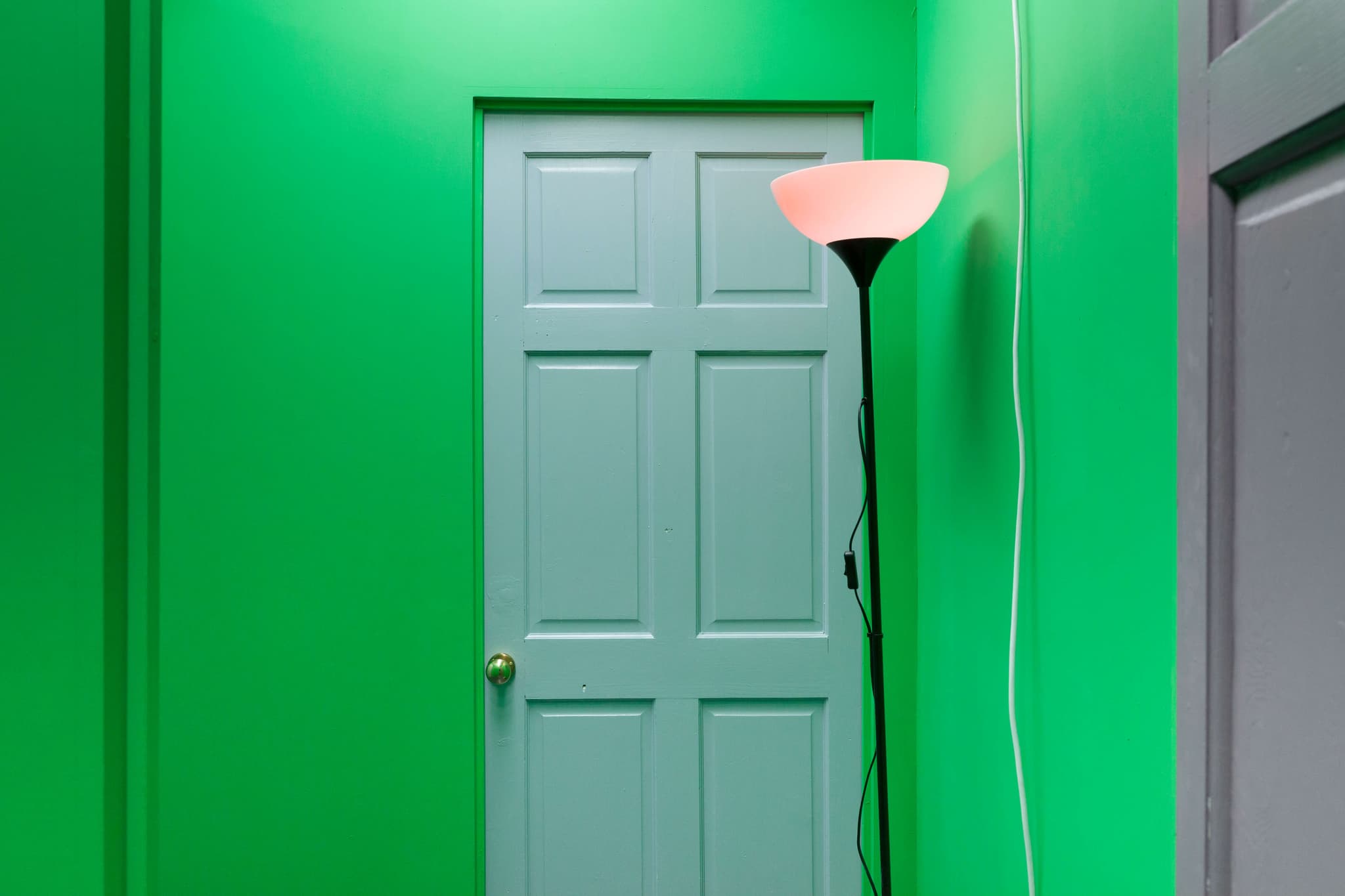 Walking into the corridors, the walls are painted the color of green screen, akin to Hollywood cinema when the special effects have yet to be uploaded. The viewer is invited to provide the content by trying each door and looking through each peephole, activating the sound and lights via the motion sensors.