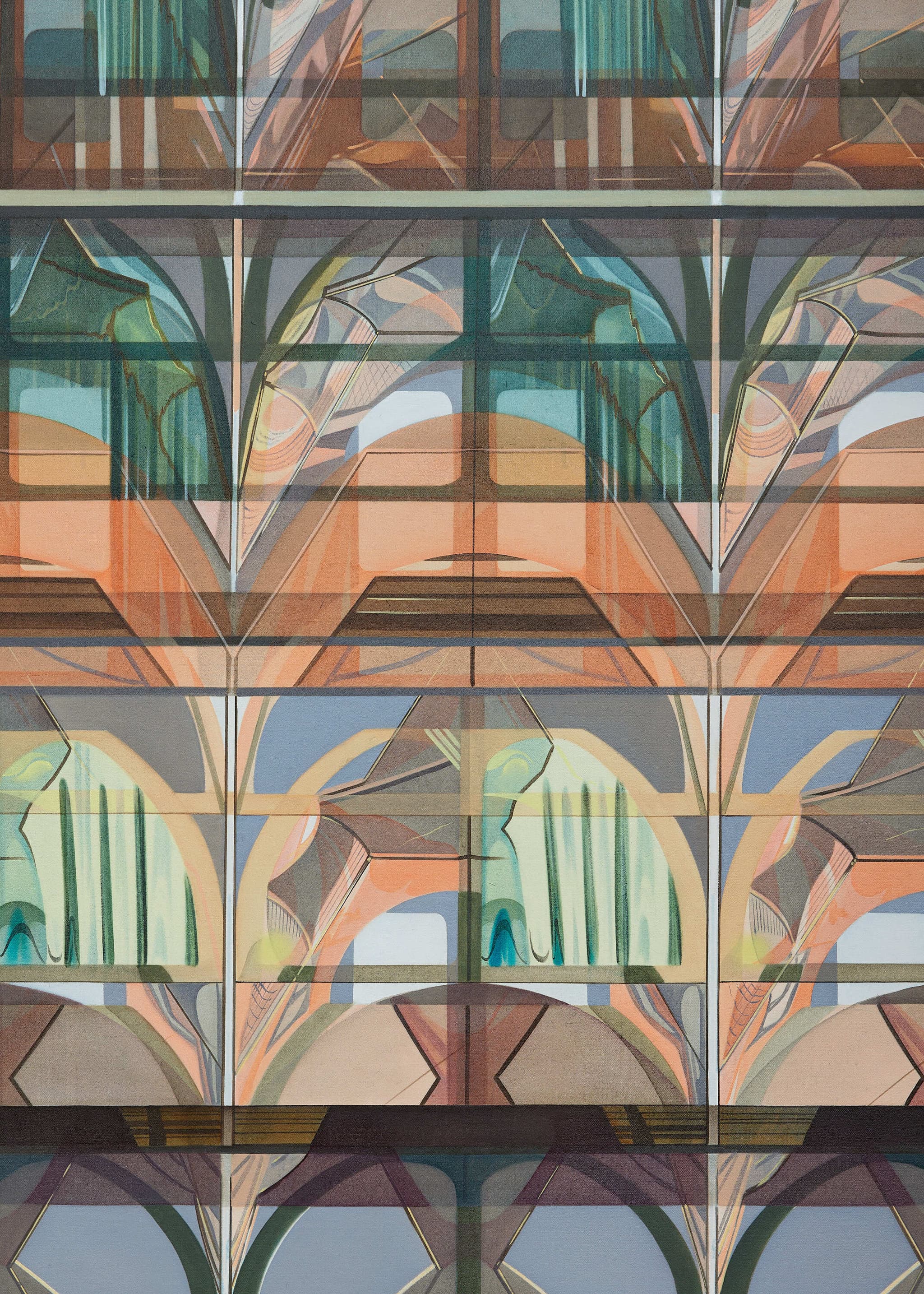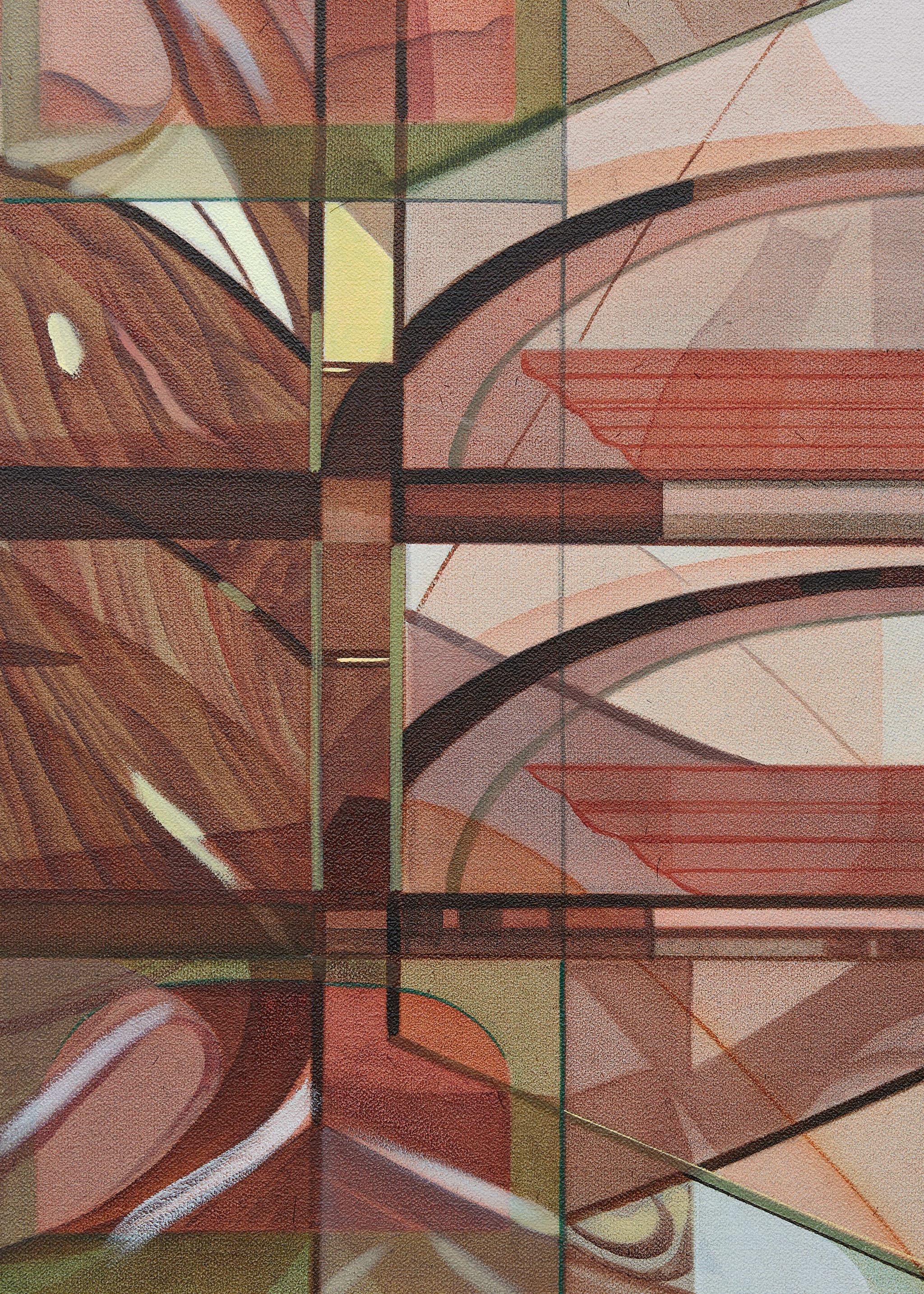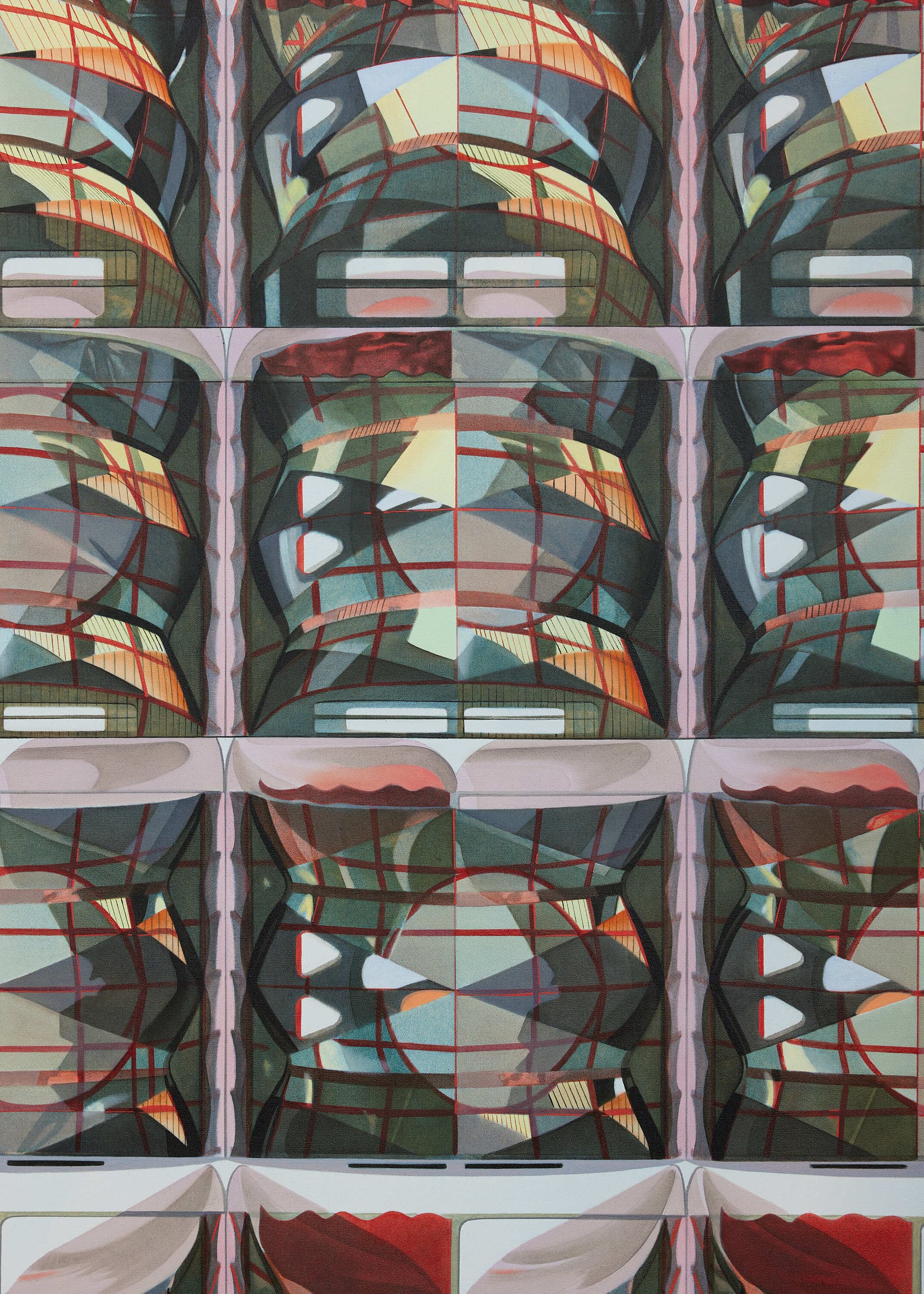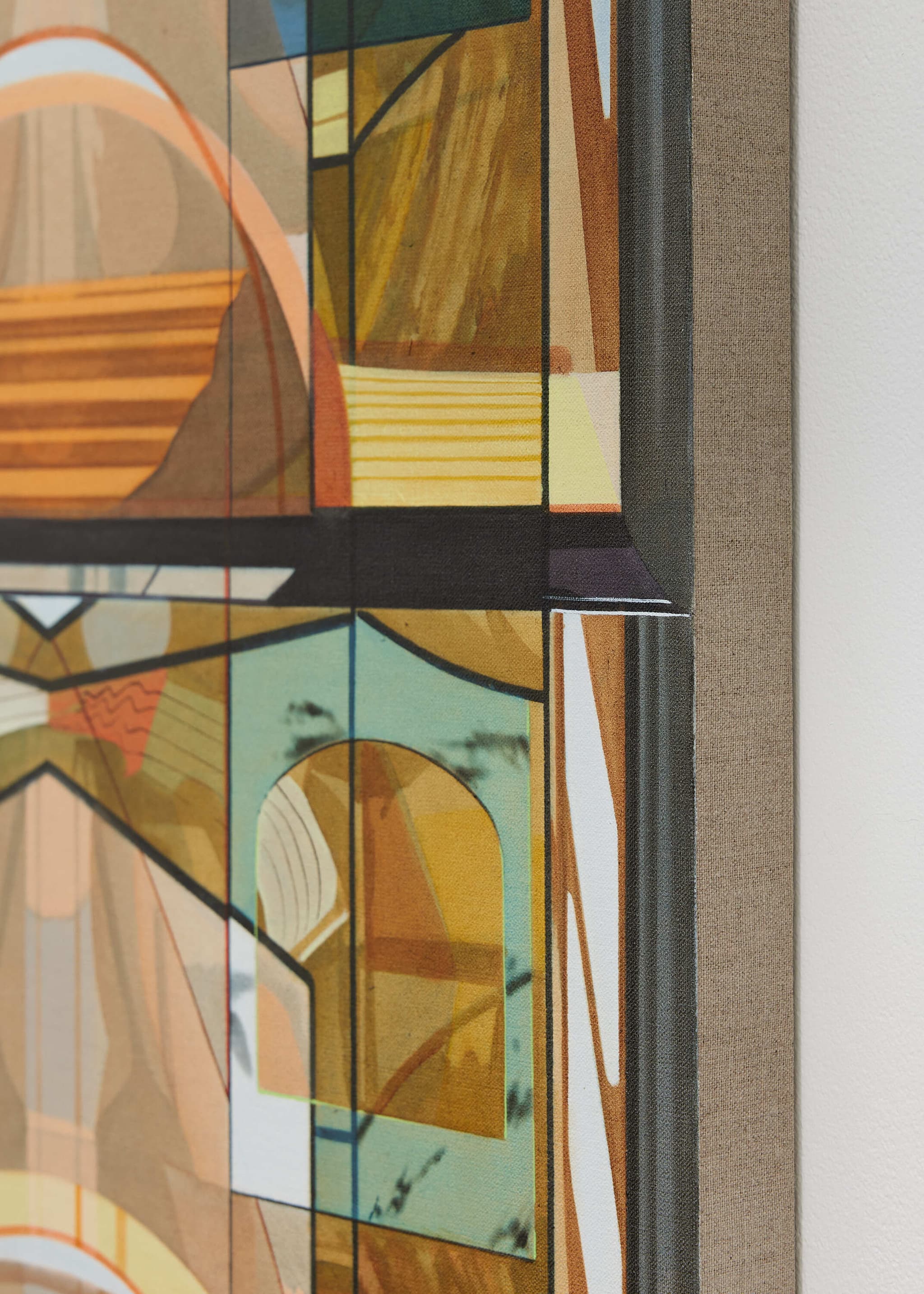 In Bivvy 23, the architectural framework seems initially apparent, however as your eye moves down and across the pictorial plane, the composition seems to dissolve and collapse in on itself. On first glance, the repetitive geometric structure seems unwaveringly precise and mechanical, yet, upon closer inspection the painterly gesture reveals itself in the transparent layers, where form gives way to contemplative abstraction.