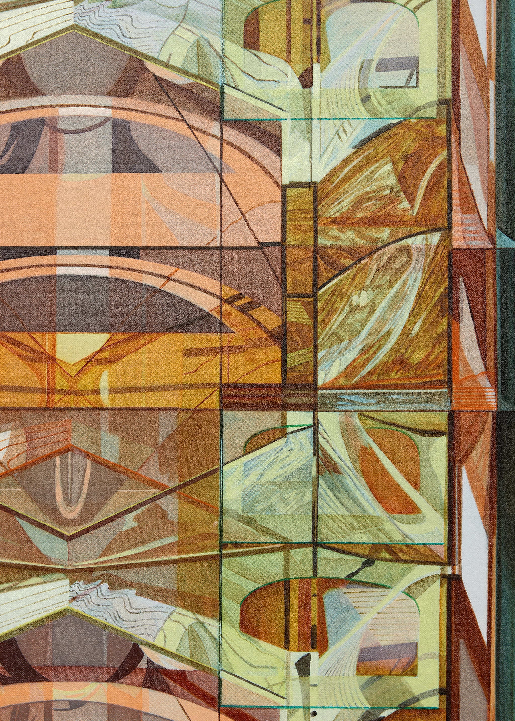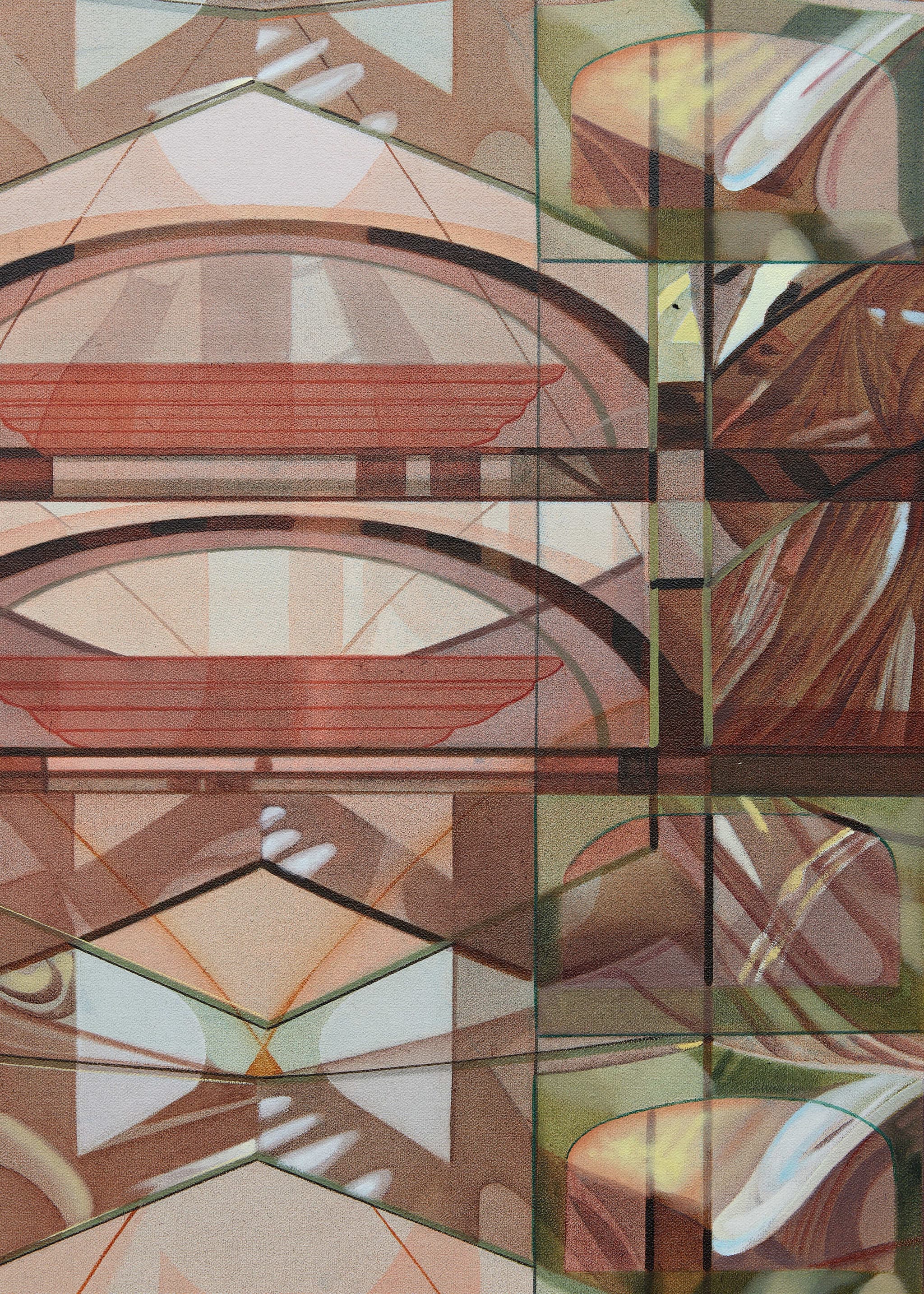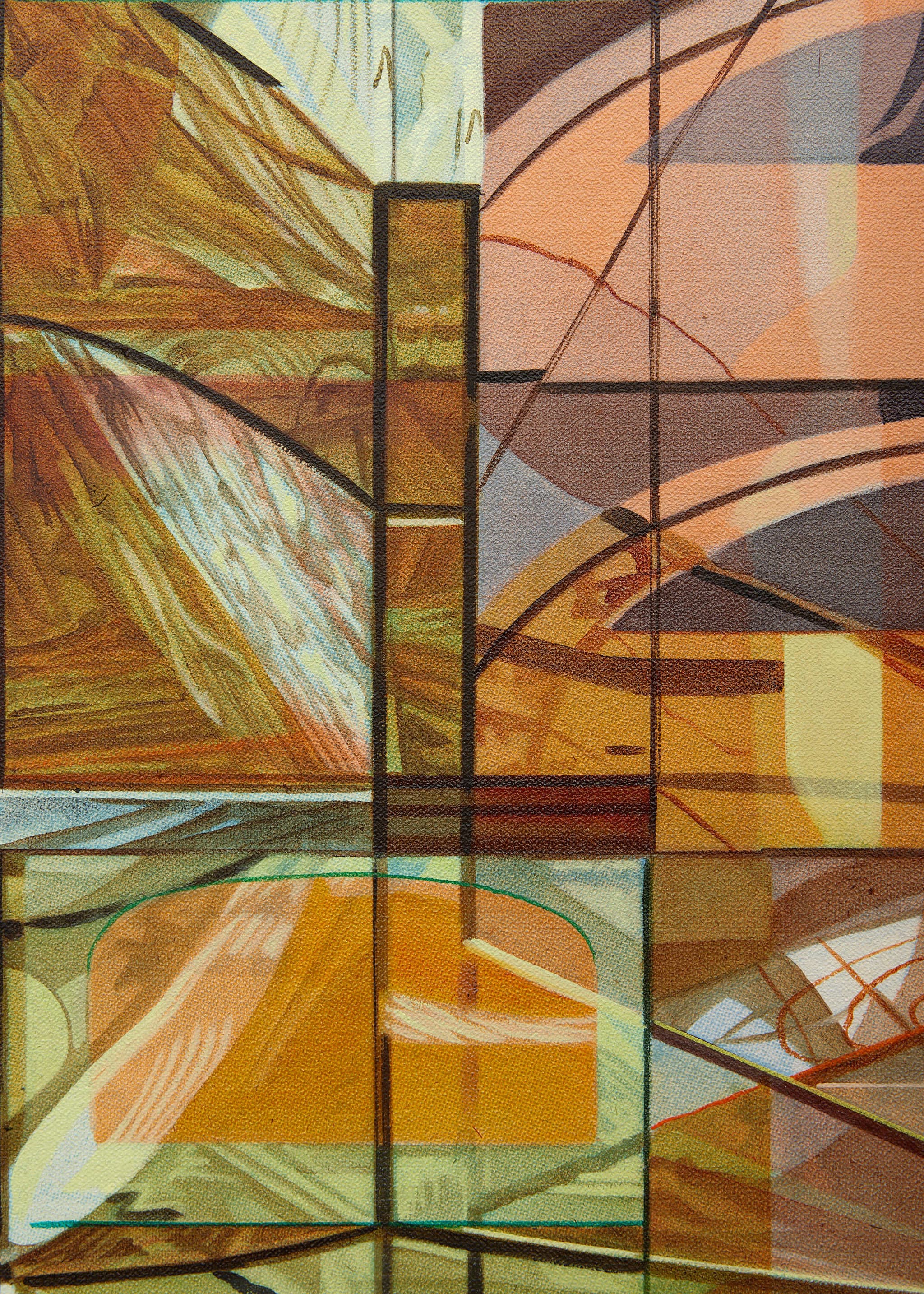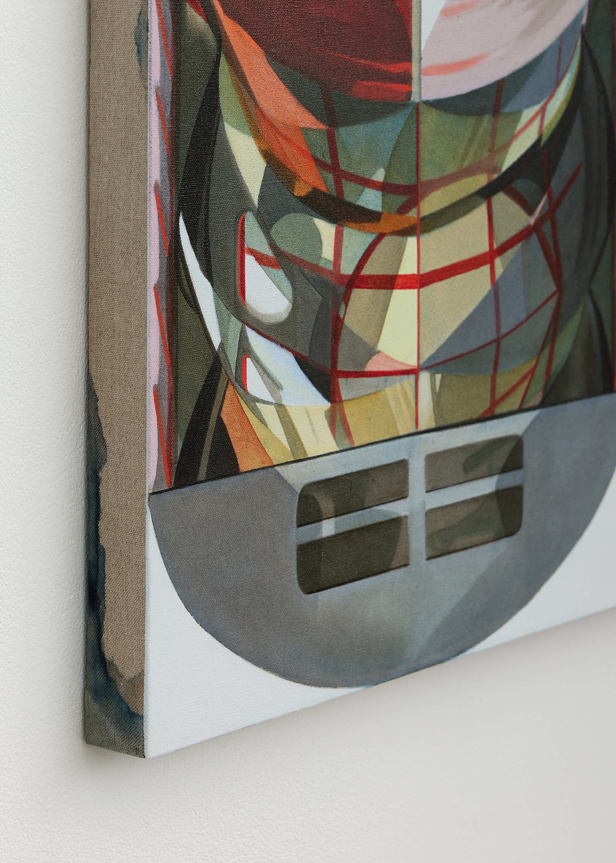 In Bivvy 23, the architectural framework seems initially apparent, however as your eye moves down and across the pictorial plane, the composition seems to dissolve and collapse in on itself. On first glance, the repetitive geometric structure seems unwaveringly precise and mechanical, yet, upon closer inspection the painterly gesture reveals itself in the transparent layers, where form gives way to contemplative abstraction.