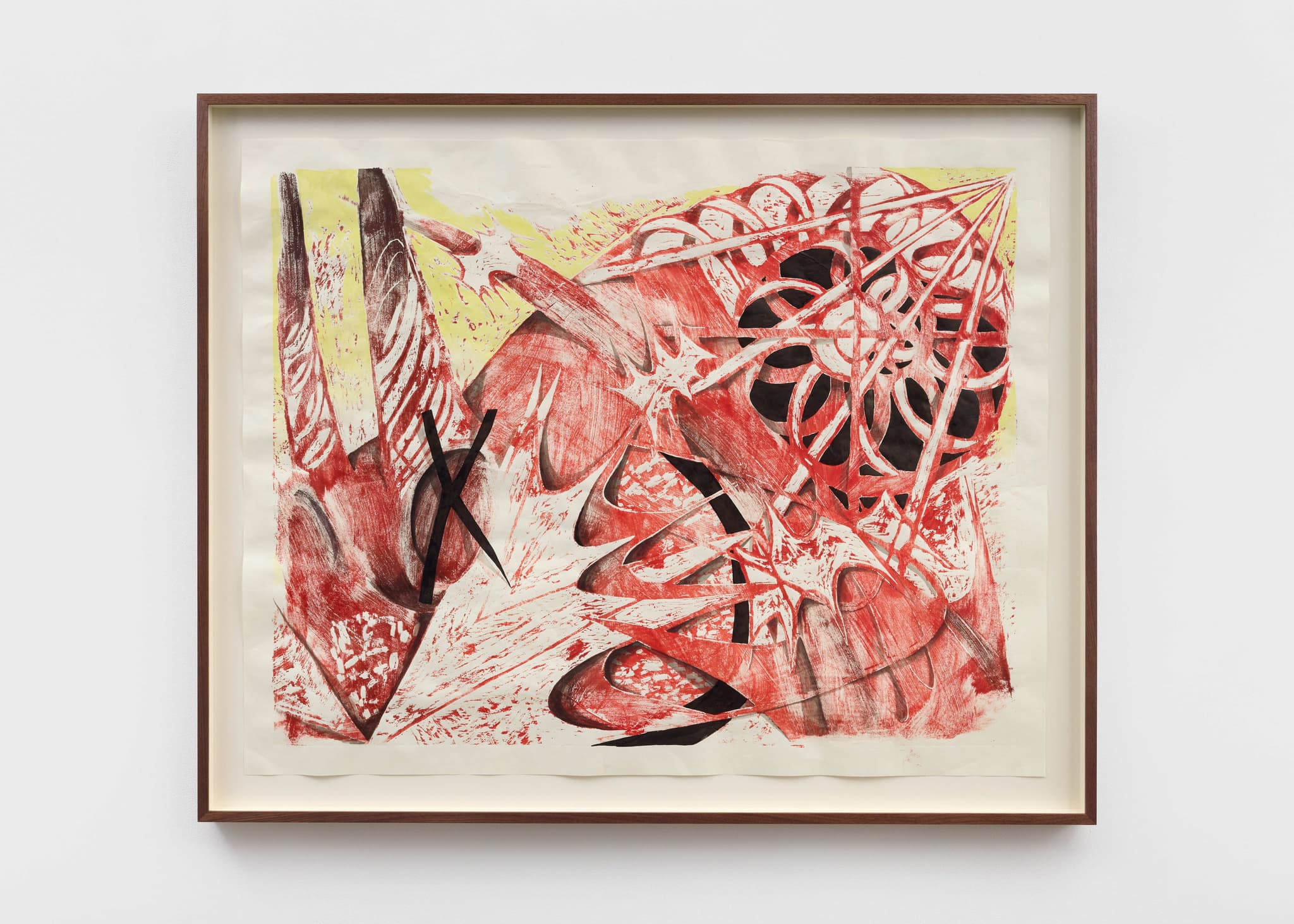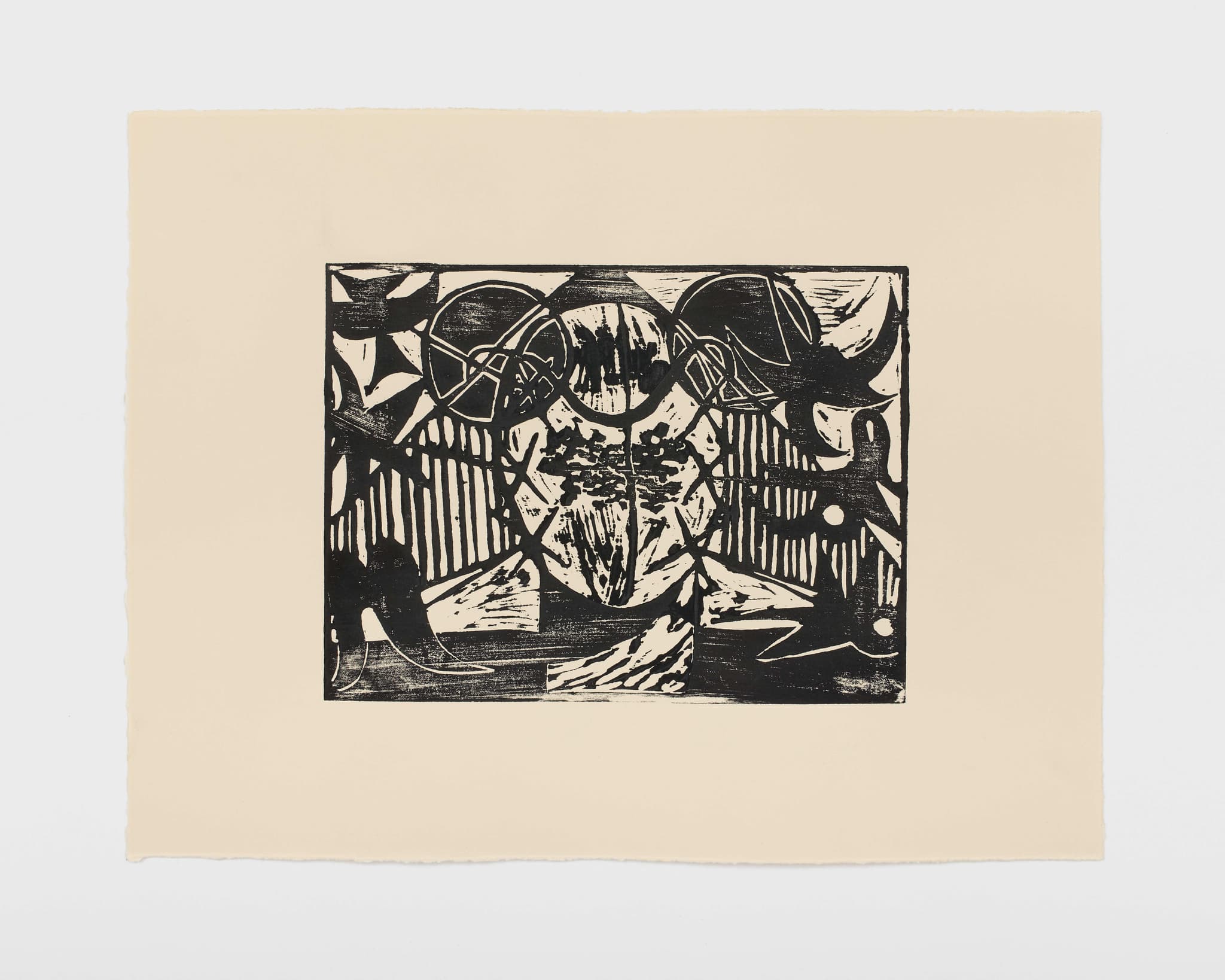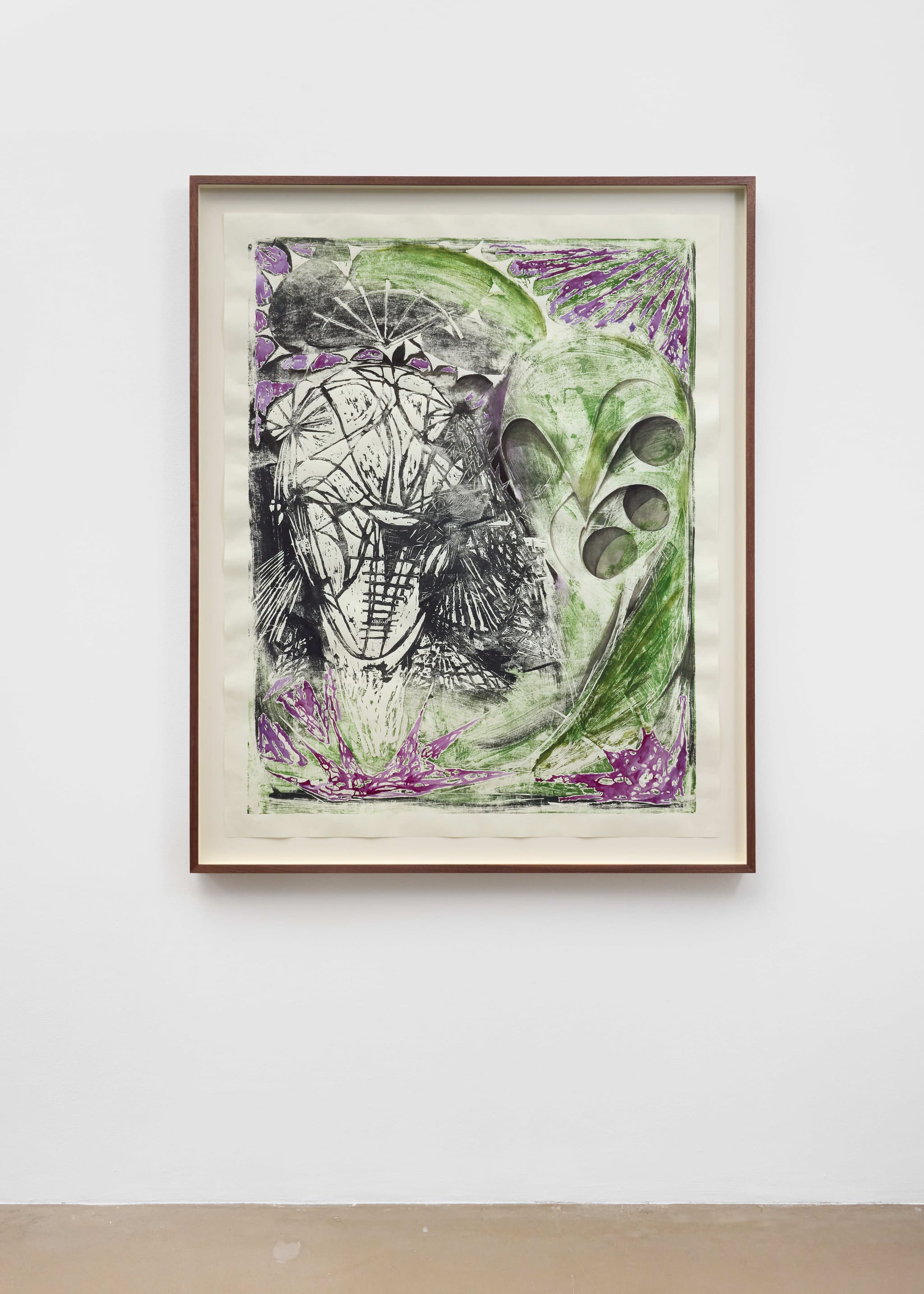 GIANT ATOMS features woodcut prints made this year using blended European and Japanese techniques. Each print is comprised of multiple layers, starting with a foundational wood block which is hand-printed using a barren, applying an ink made of starch paste and watercolour. This systematised yet hand-coloured process creates subtle unique variations in each print. Steadman views these works as bridging his painting and printmaking practices, achieving painterly marks and complexity of surface while maintaining the repeatability of composition from the underlying carved blocks.