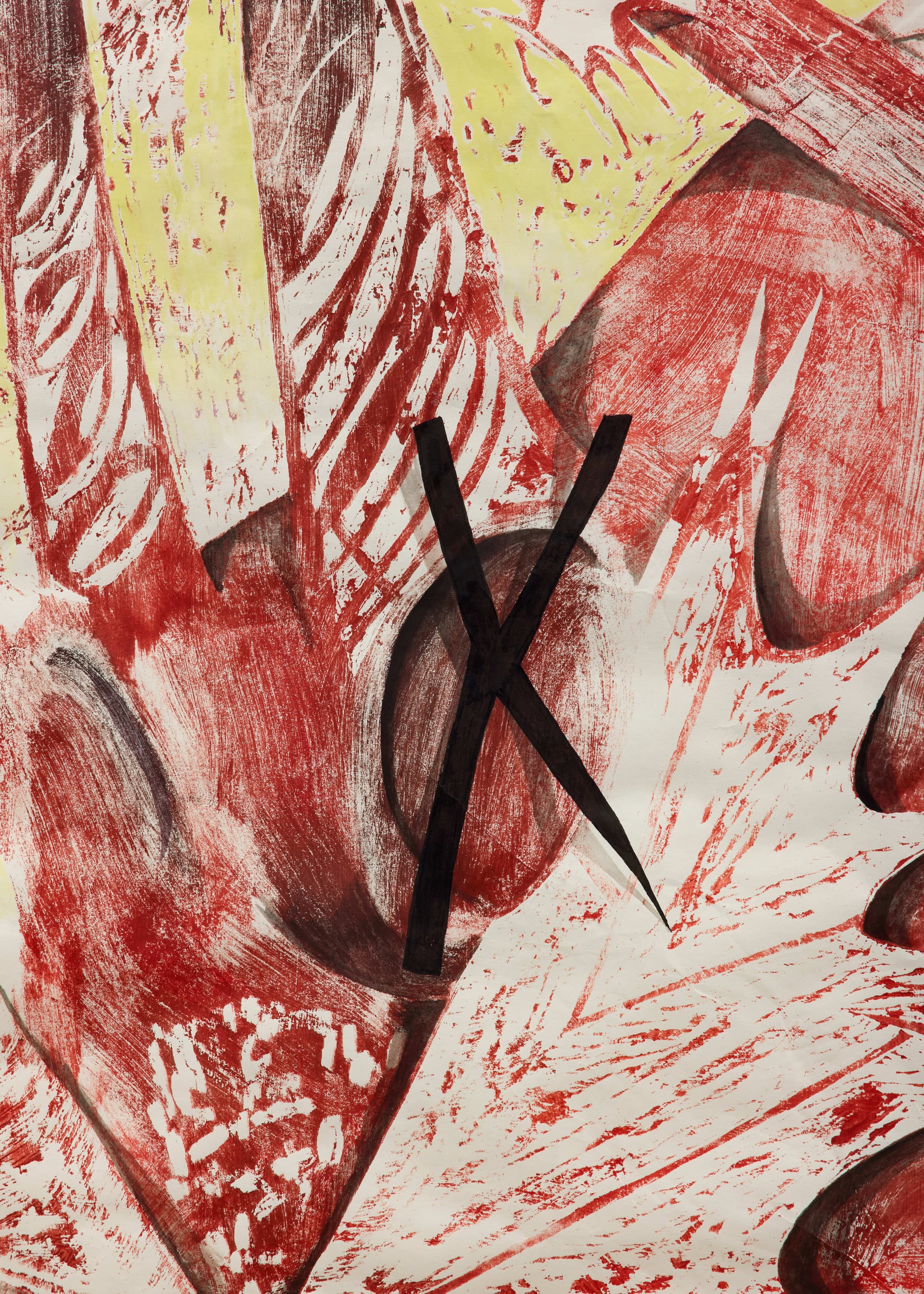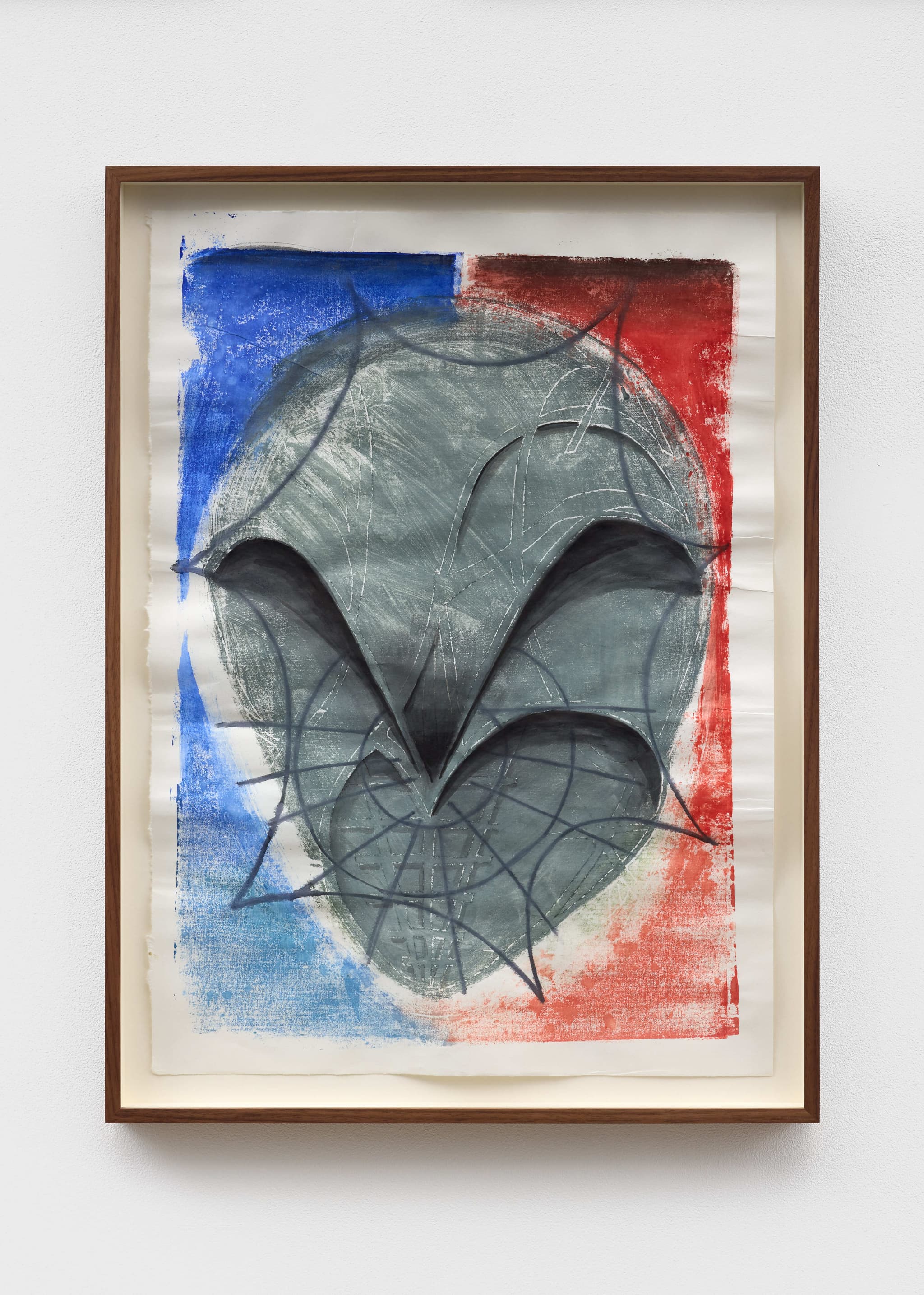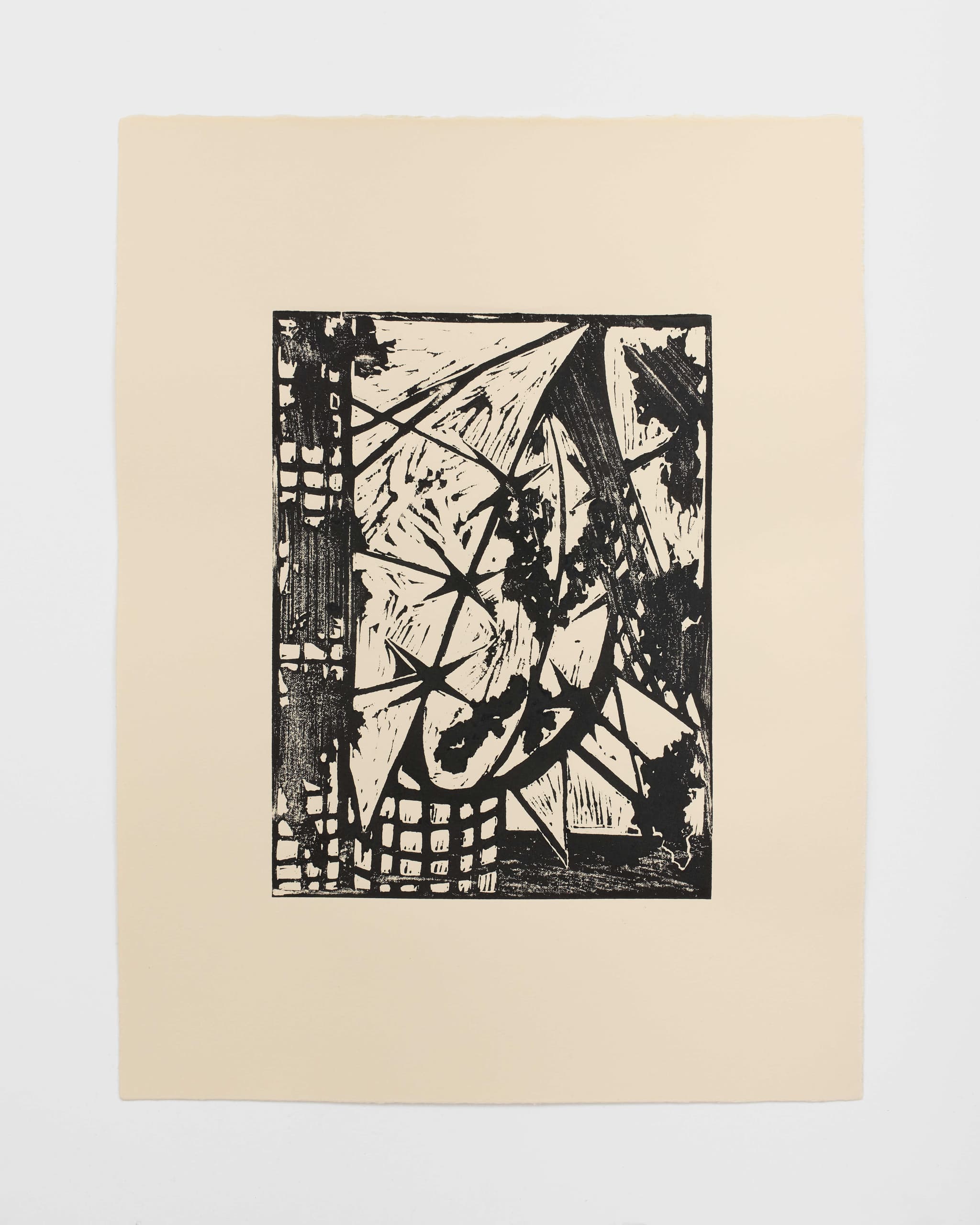 GIANT ATOMS features woodcut prints made this year using blended European and Japanese techniques. Each print is comprised of multiple layers, starting with a foundational wood block which is hand-printed using a barren, applying an ink made of starch paste and watercolour. This systematised yet hand-coloured process creates subtle unique variations in each print. Steadman views these works as bridging his painting and printmaking practices, achieving painterly marks and complexity of surface while maintaining the repeatability of composition from the underlying carved blocks.