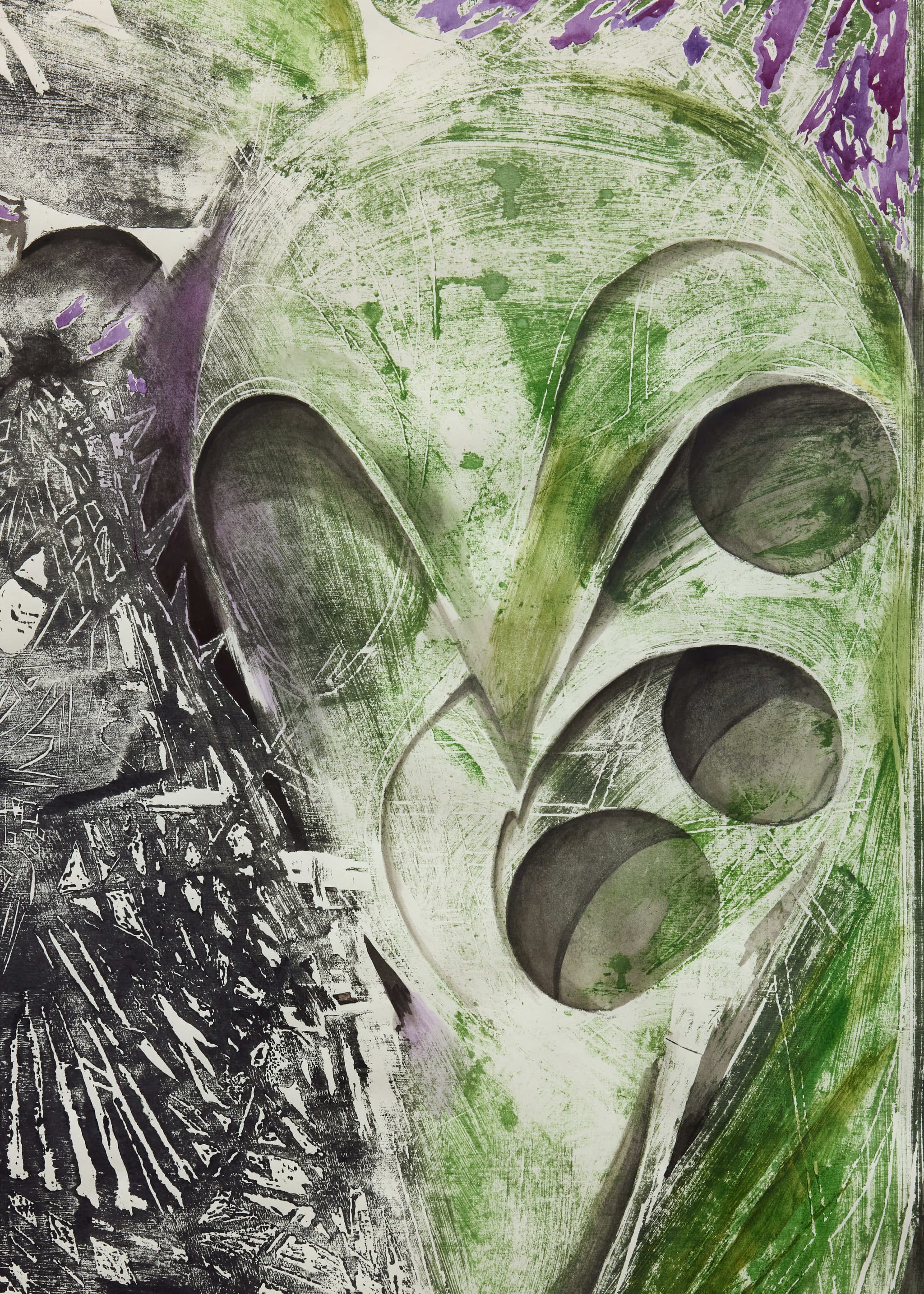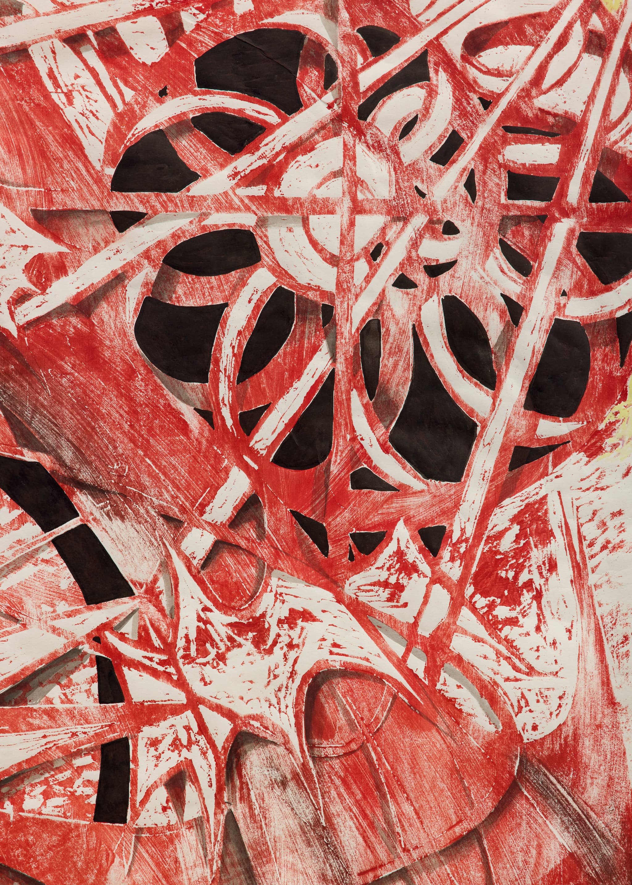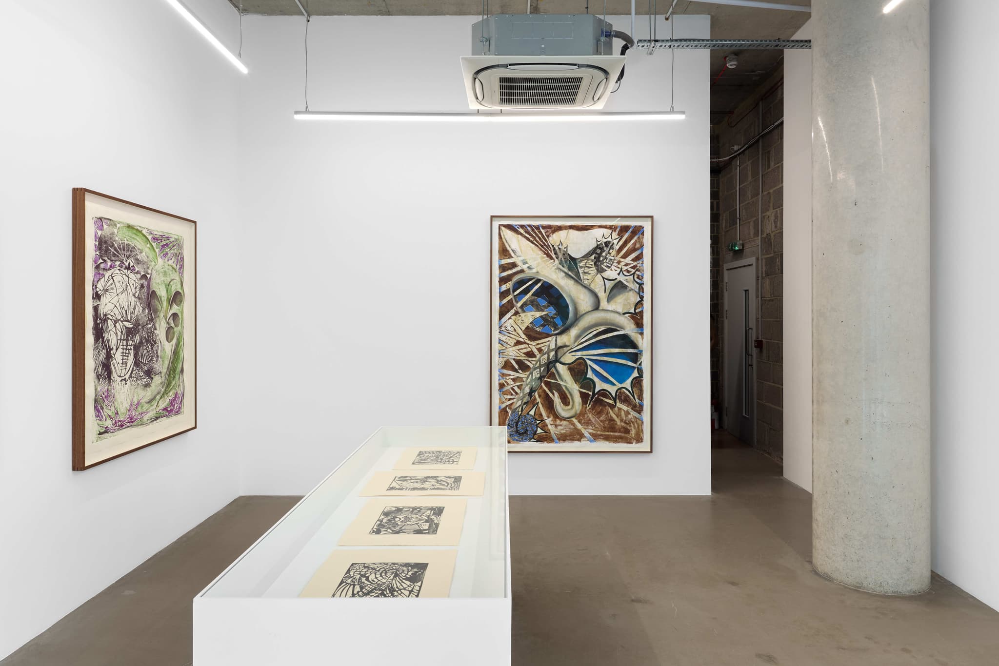 Labelling the origin of each work’s forms is difficult because they are worked on intuitively and iteratively, not from source material. However, animal and bird-like figures, spirals, lattices, and heads have absorbed a plethora of influences—occasional family resemblances to the pastoral, vague hints of Samuel Palmer, fragments of esoteric or medieval printmaking, futurism, and Japanese Ukiyo-e.
