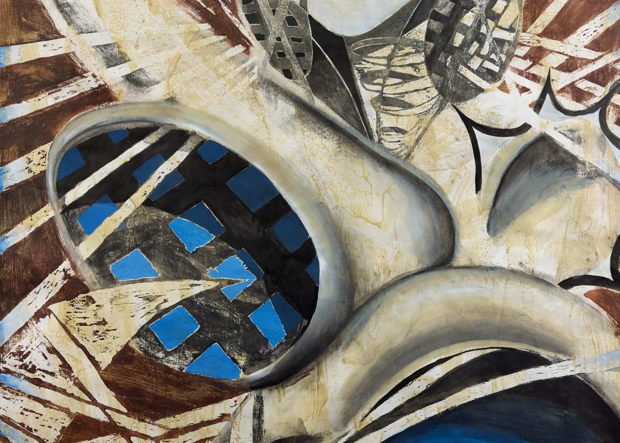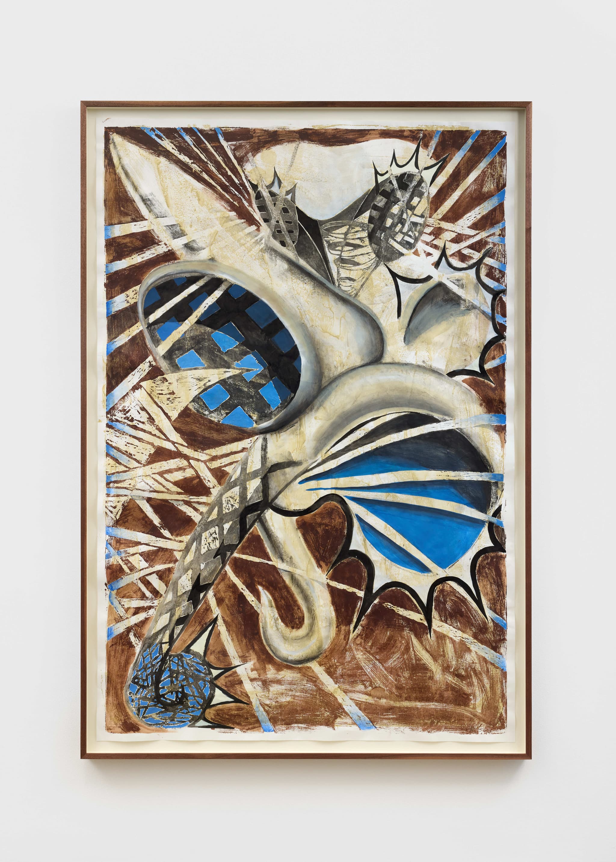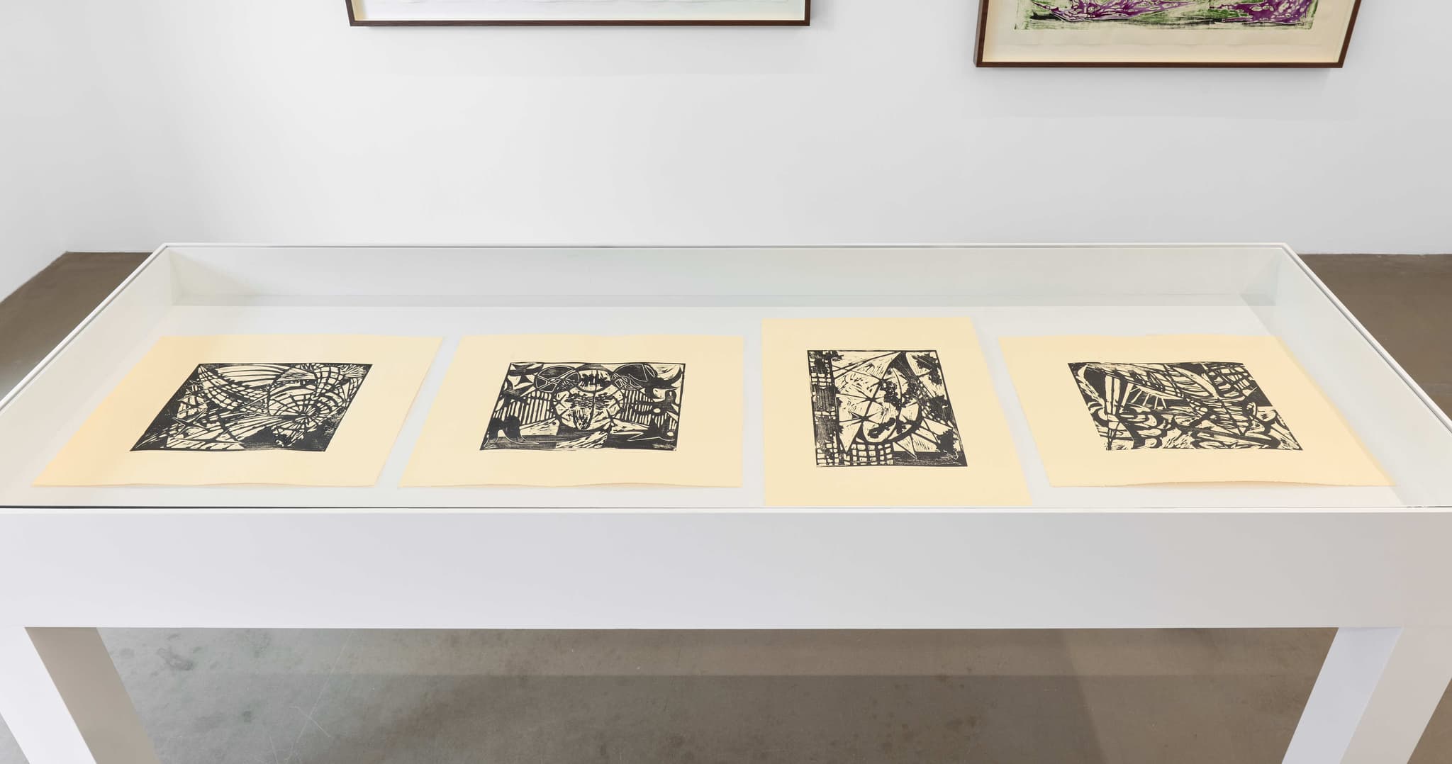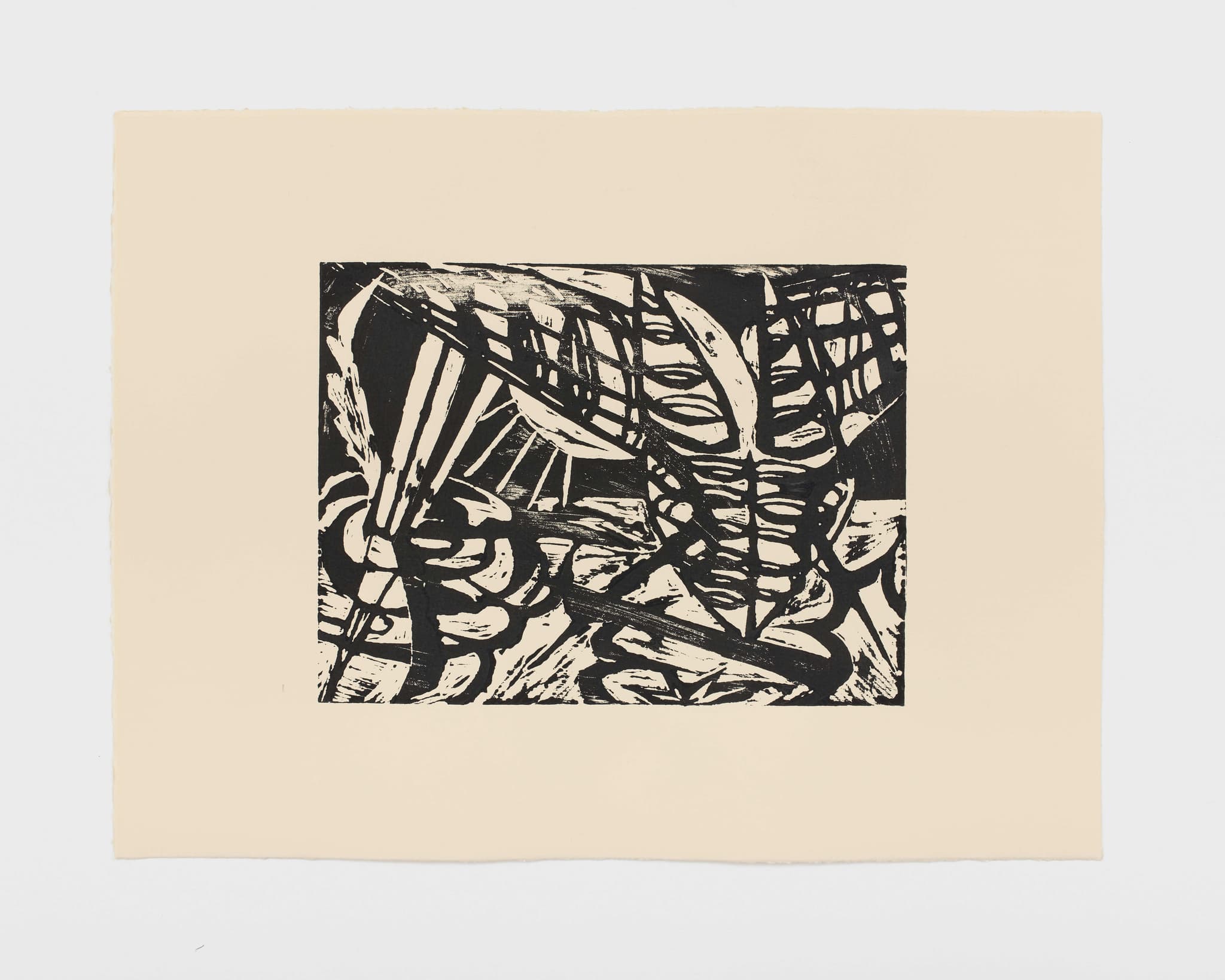 Labelling the origin of each work’s forms is difficult because they are worked on intuitively and iteratively, not from source material. However, animal and bird-like figures, spirals, lattices, and heads have absorbed a plethora of influences—occasional family resemblances to the pastoral, vague hints of Samuel Palmer, fragments of esoteric or medieval printmaking, futurism, and Japanese Ukiyo-e.