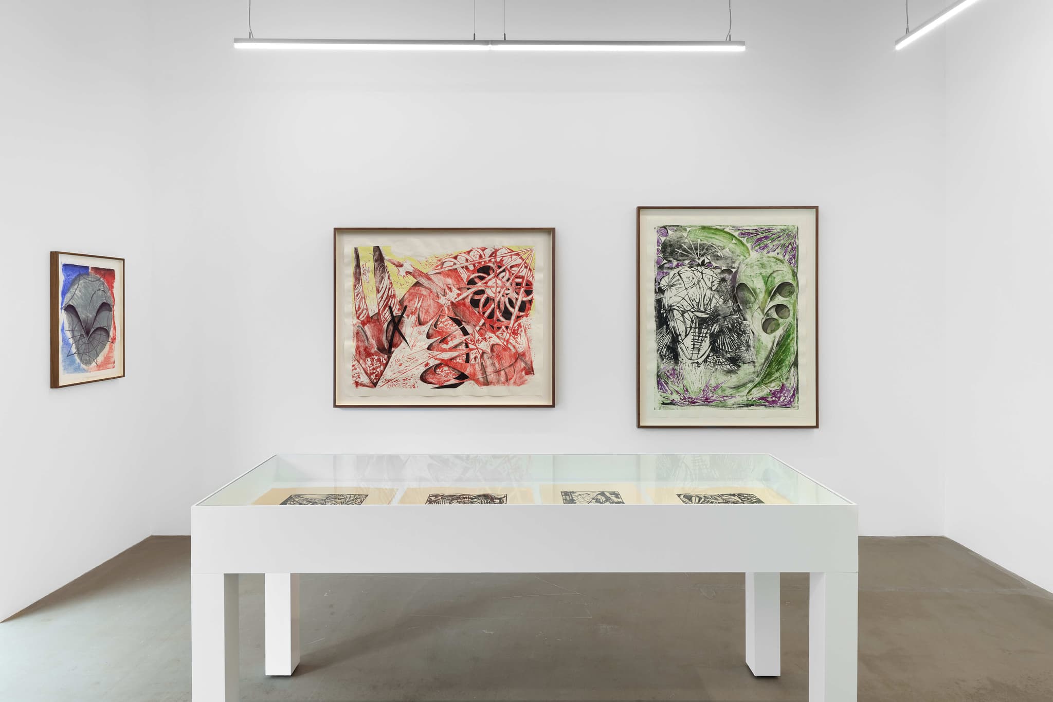 The physical process is demanding, particularly for larger works, requiring action painting-style ink application on the floor at speed to outpace drying times. Steadman employs intuitive, adapted techniques to achieve his desired touch and precision. All works were printed by the artist alone in his studio without conventional printing studio assistance, resulting in a DIY methodology that defines this body of work.