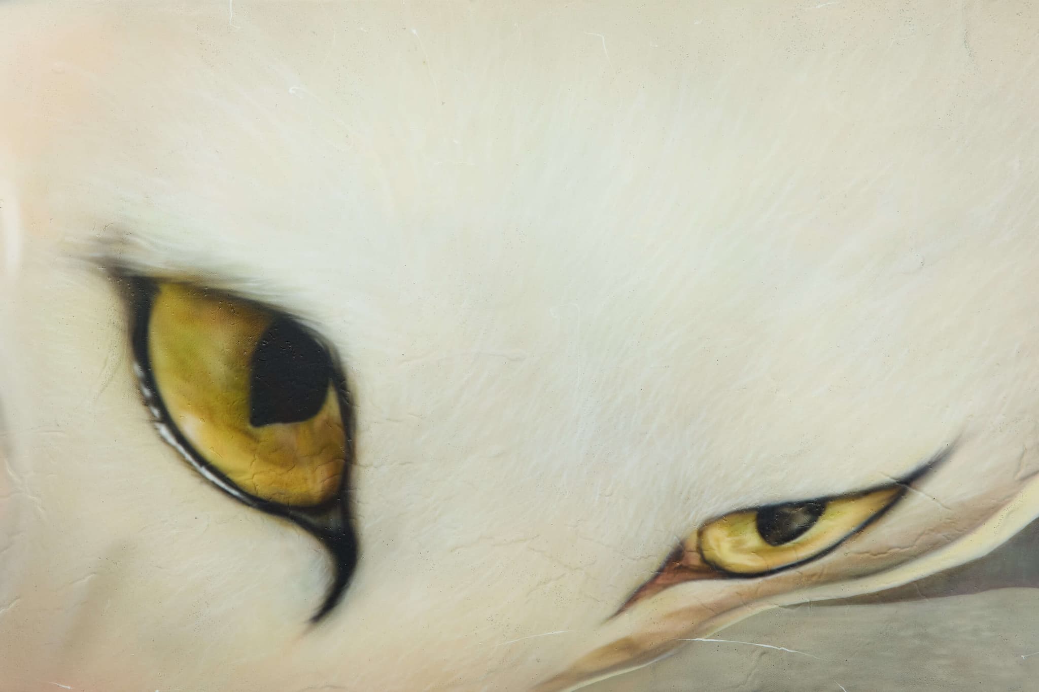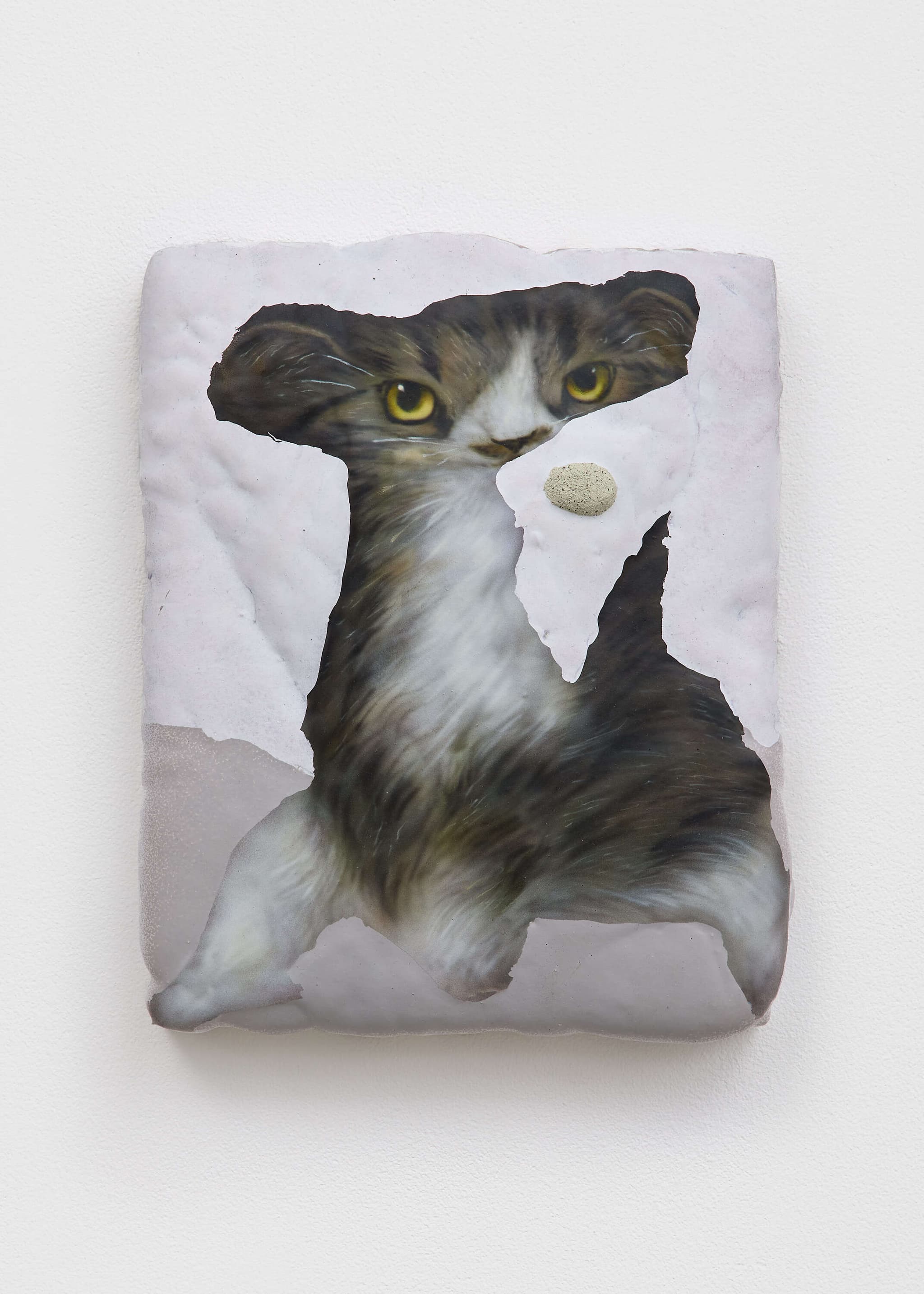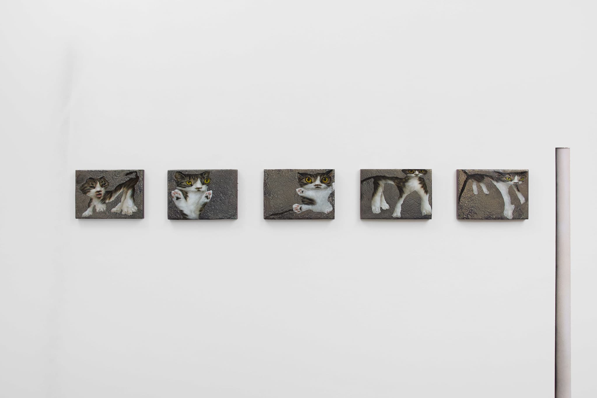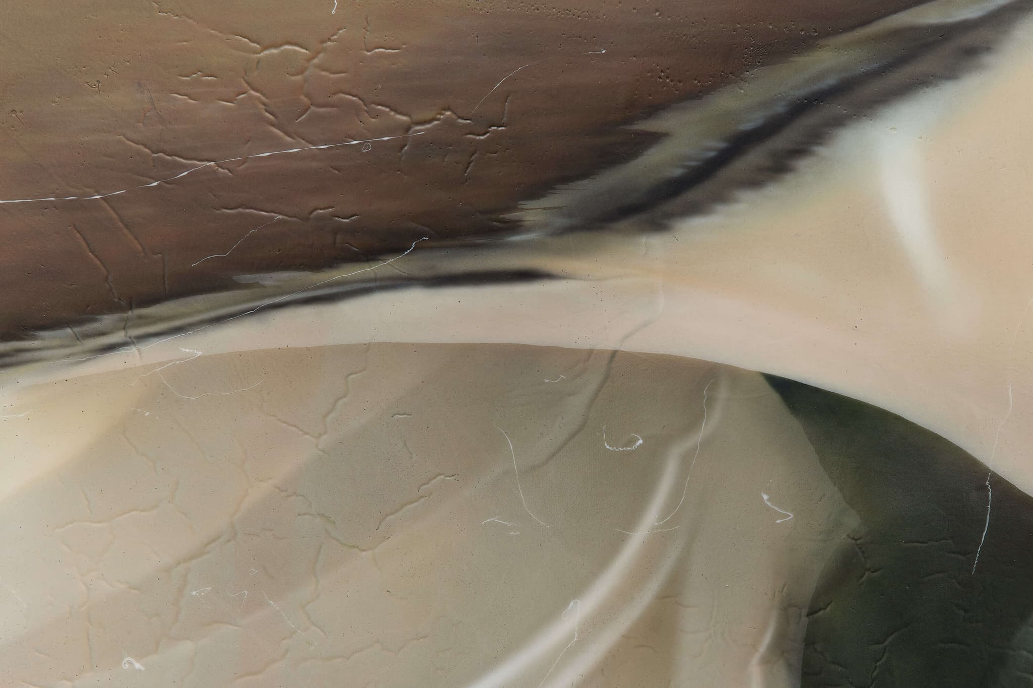 The process of translating the image of the real Hiro into paintings and sculptures is similar to capturing the materiality of the image. It begins with photographing and then distorting the texture, curvature and appearance of the image, similar to the process of making a meme. Hiro can indeed be ‘anywhere’. The layering of the image onto the surface of the object is primarily done using an airbrush. Here, ‘object’ refers to a real target of specific width, volume, and weight, and ‘surface’ refers to the exterior face of that object, encompassing various categories from canvas to wooden panels, epoxy, and urethane foam. However, while past works transformed Hiro into a two or three dimensional object, with the form following the image, the new works capture Hiro’s appearance whilst incorporating integrated accidents. For example, in the new series, Hiro 1-14, Ahn utilises soft urethane foam, which has a varied expansion rate, and builds up multiple layers of thin acrylic paint. The surface naturally forms an undulating flow-like texture as it dries, where the artist then lays Hiro’s appearance like a veil over the accumulated surface shapes.³ Each artwork’s finished result is dependent on the time it took for layers of urethane foam and paint to dry, each layer mixing or separating in different ways.