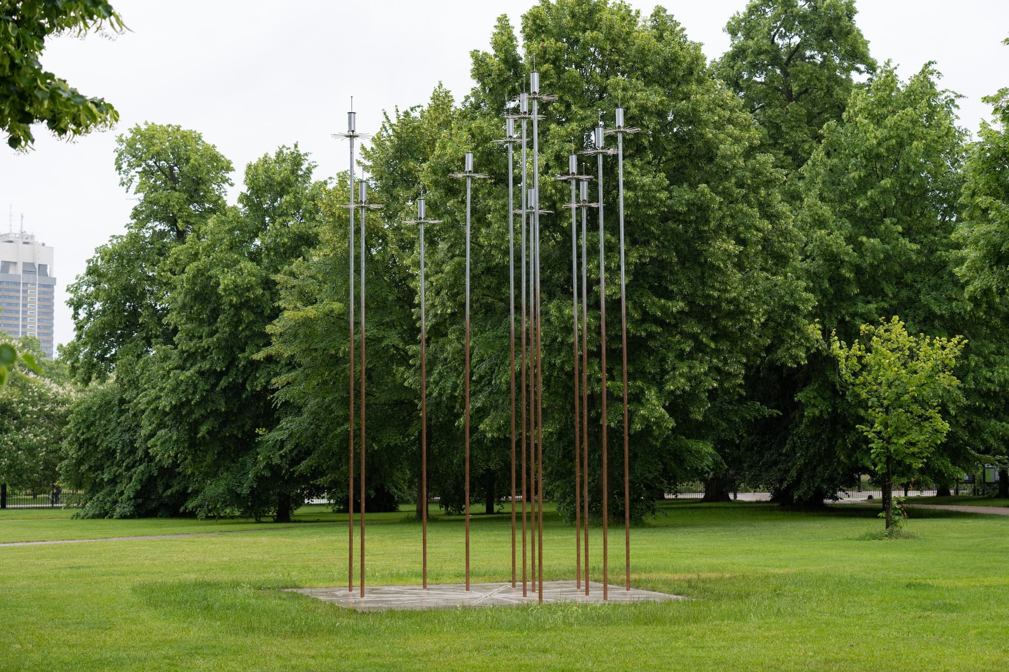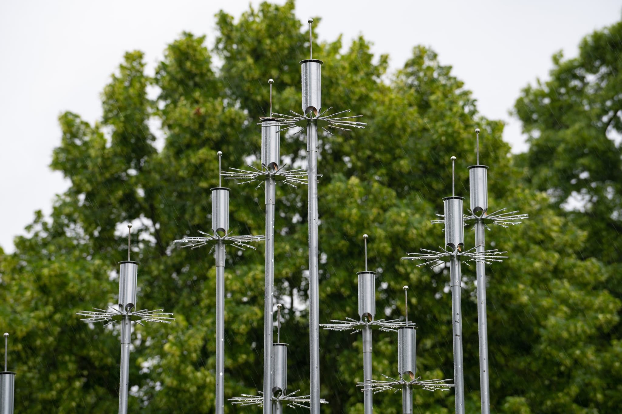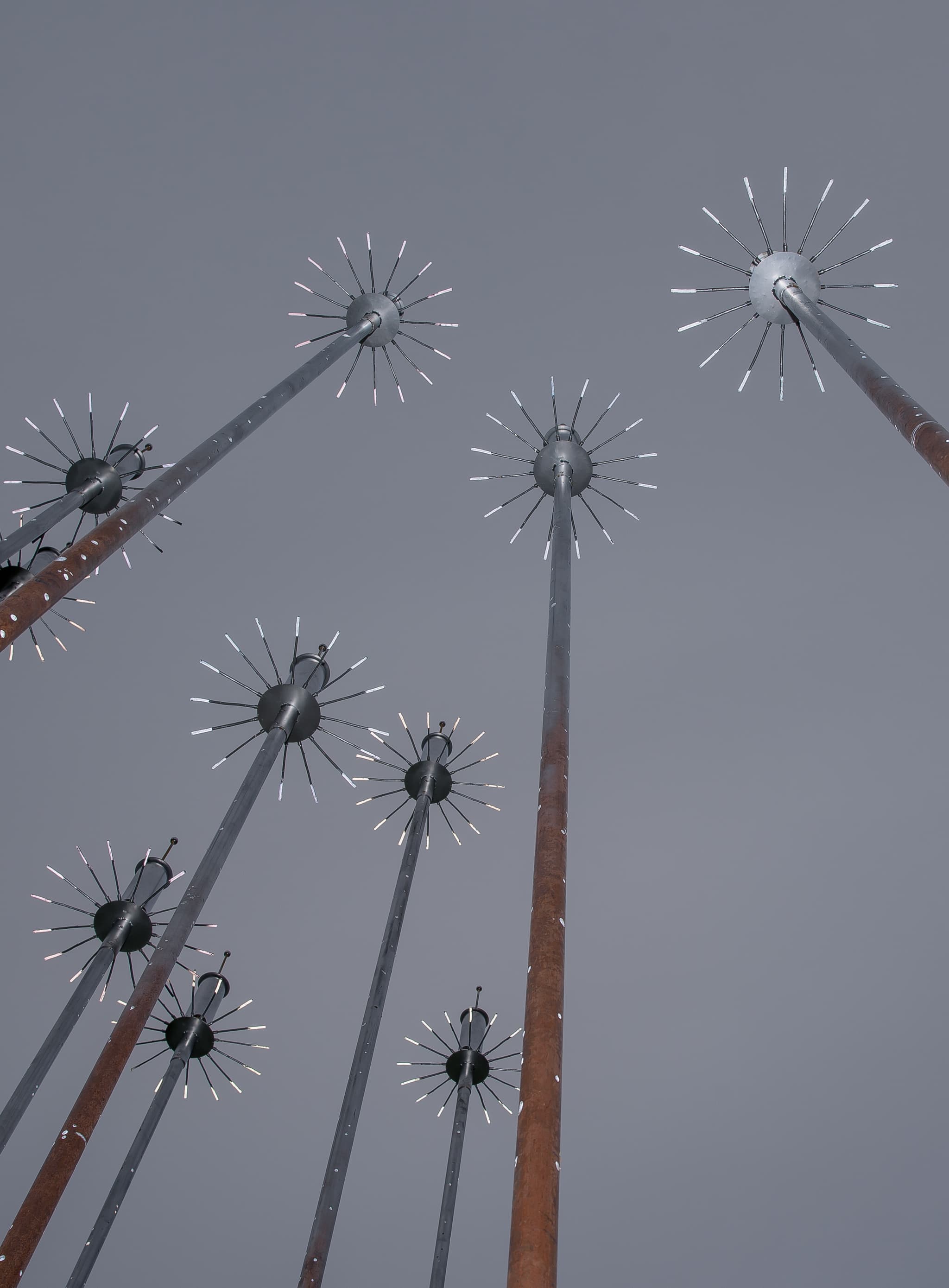 taraxos is a meditative place for anyone to slow down time for themselves. Visitors can sit beneath and stand amongst a constellation of 12 metal achenes, which take the form of futuristic dandelion ‘seeds’, and listen to the sculpture. Activated by the wind, the sculpture can also be played by touching the stems which are covered in copper, a material selected for its antimicrobial qualities.