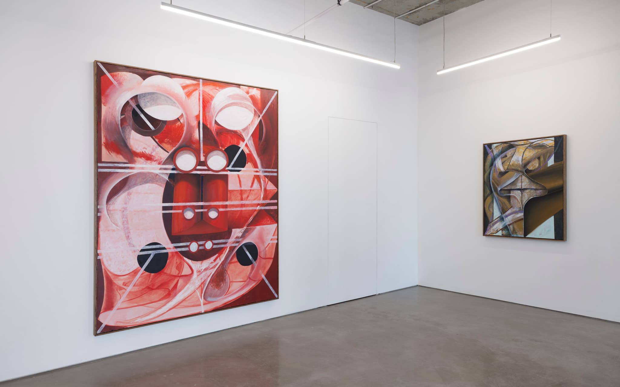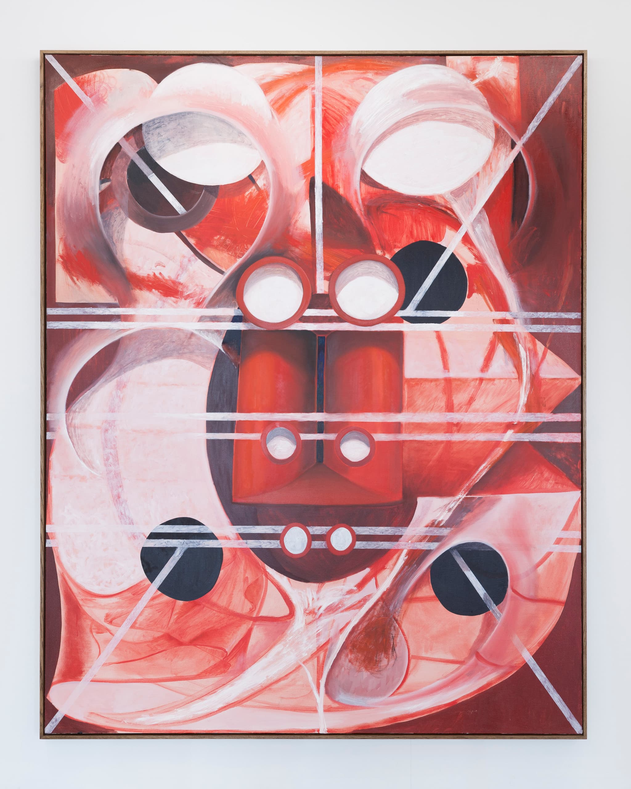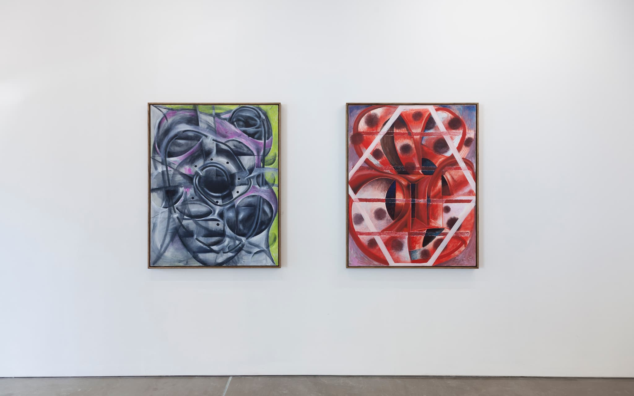 These individual forms are subdivisions of a larger whole, metabolising or masticating its interior. The paintings are held together by the pressure of their volumes; the bilateral tendency calls to mind something machinic or animal, even facial.