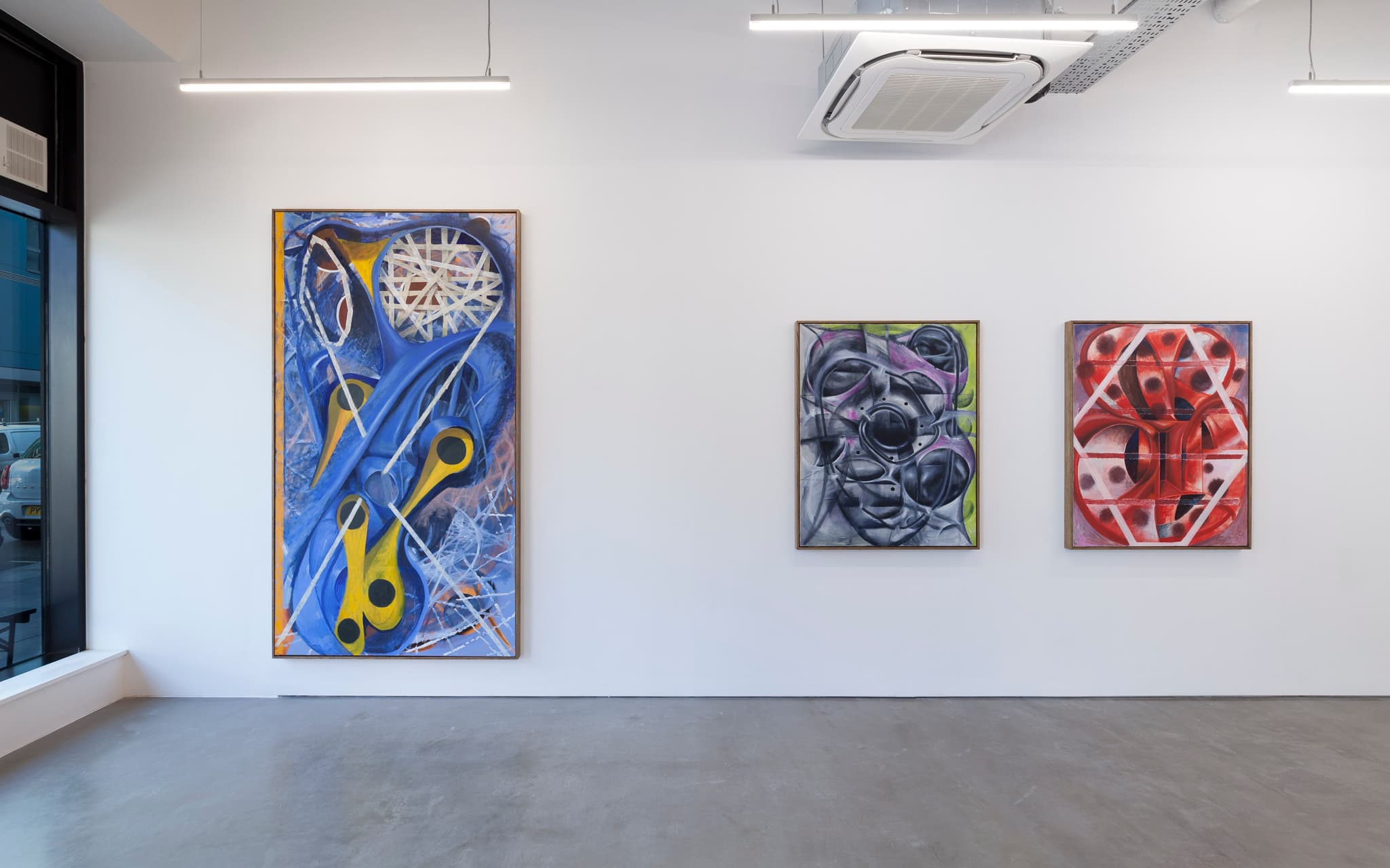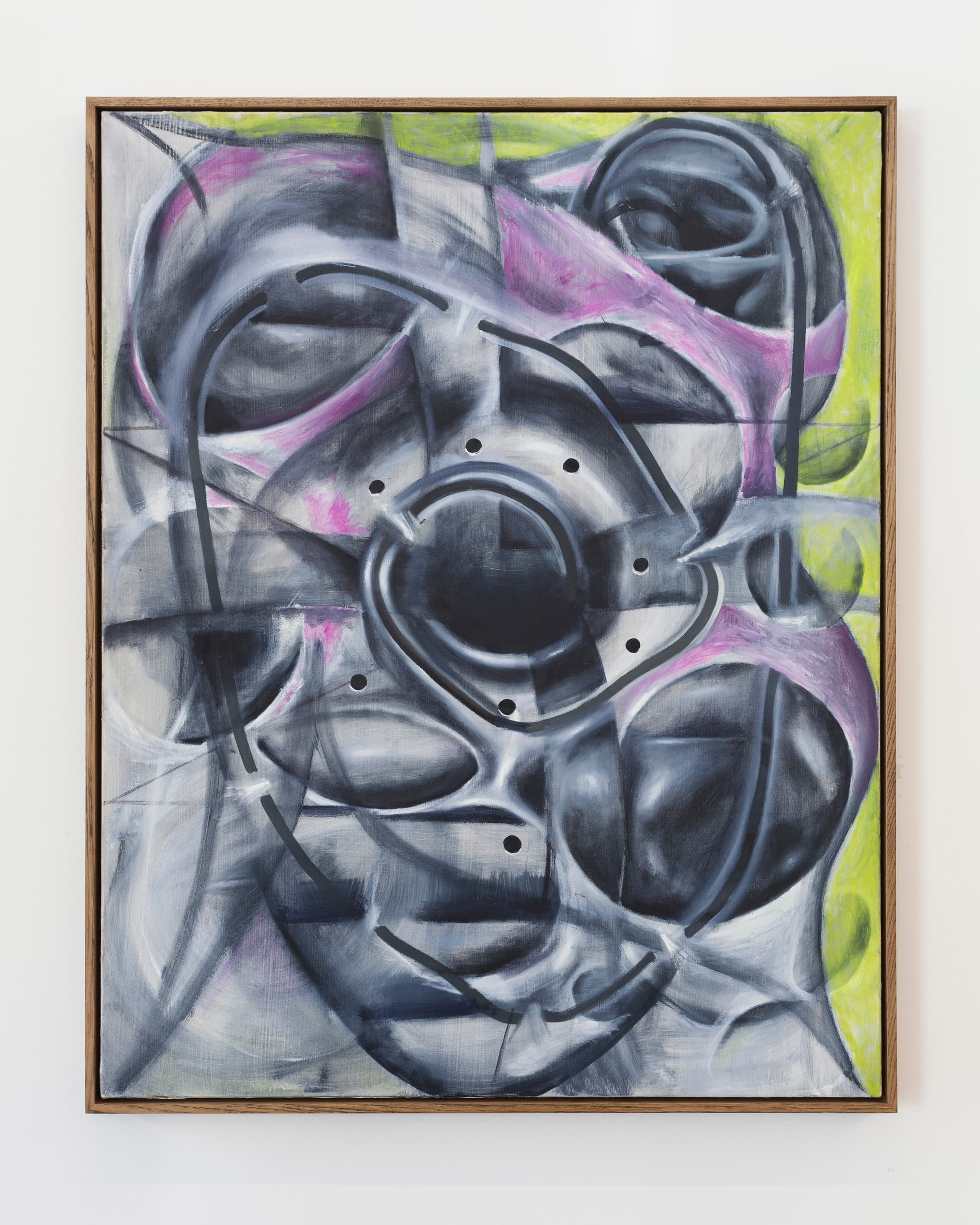 In these paintings, the surface swells. Volumes fold downwards into bore-holes, furrows smudge through vaults, manifolds scrunch past veins whilst rims cantilever over collars. Grids tuck under clasps, swellings push against webbing, disks seep through wiring as pockets erode down past promontories.